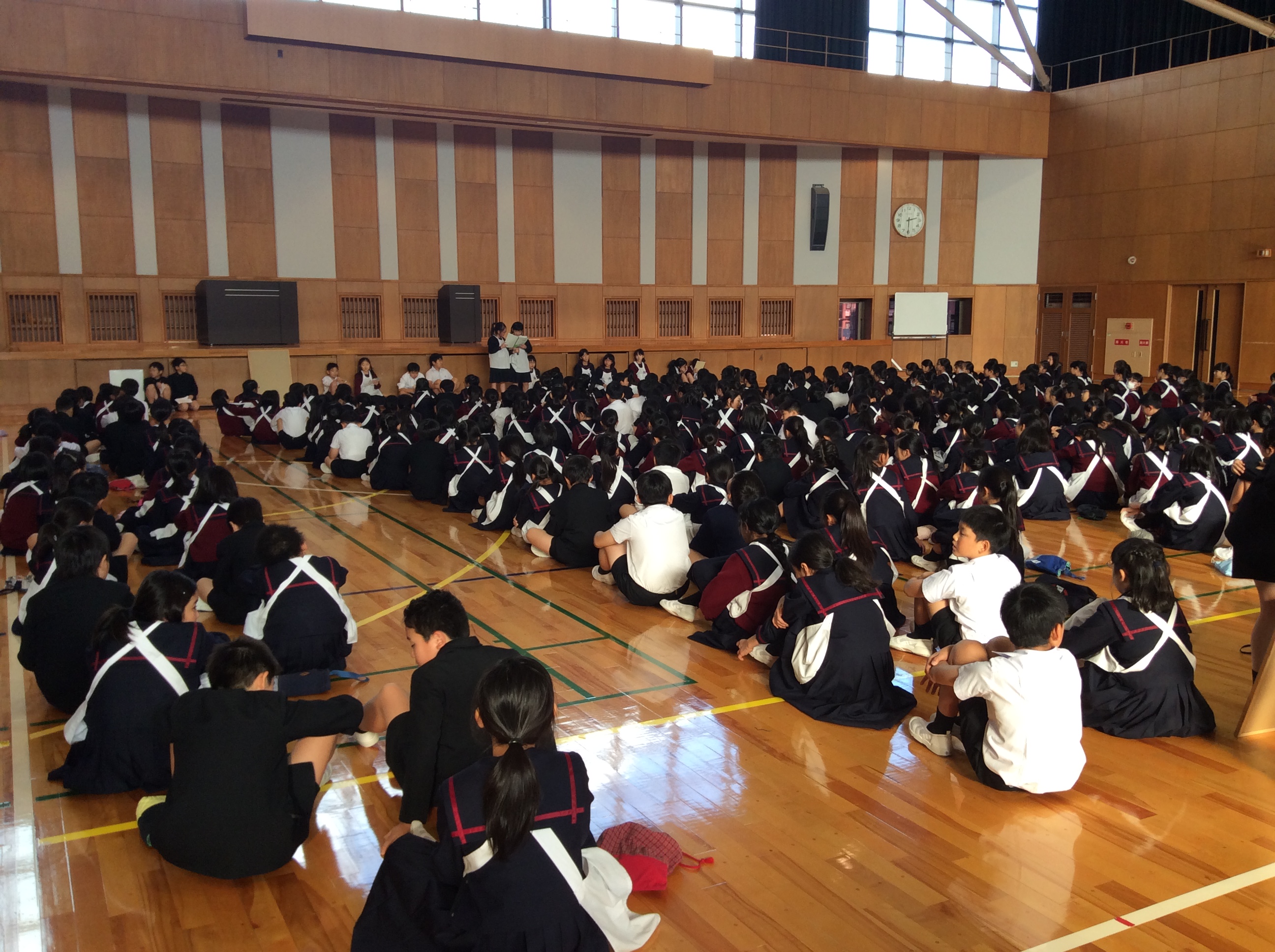 本日、昨日の雨曇を全く感じさせない晴天のもと全校朝礼を行いました。英語科と家庭科の新しい先生の紹介がありました。また、奉仕活動を行った6年生から、頑張りの報告がありました。これからも学校やその周辺を綺麗にする気持ちを大切にしてほしいです。