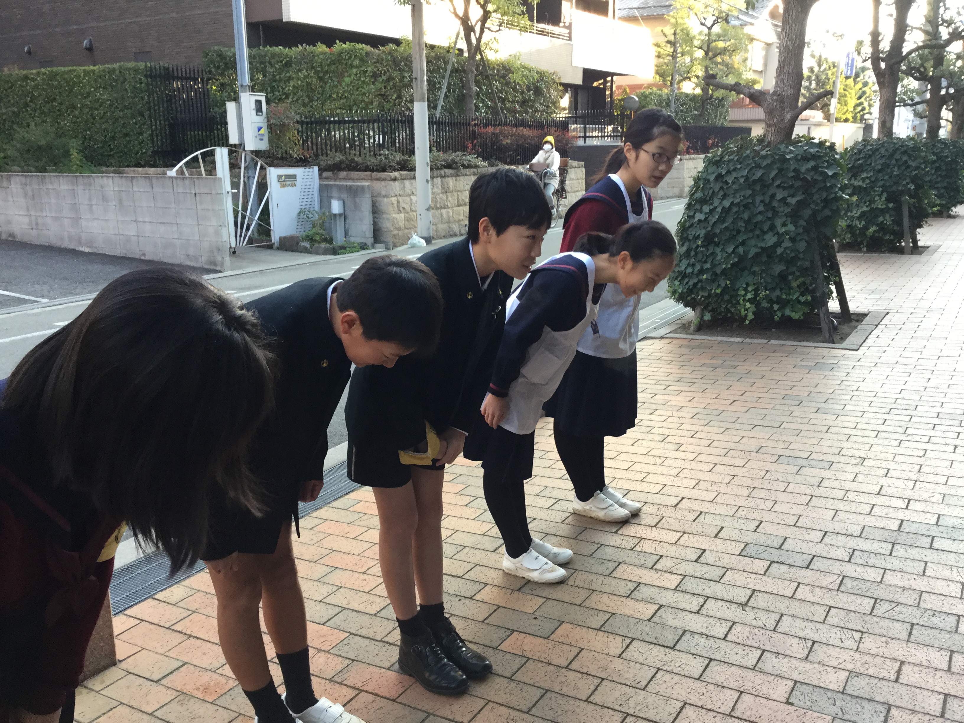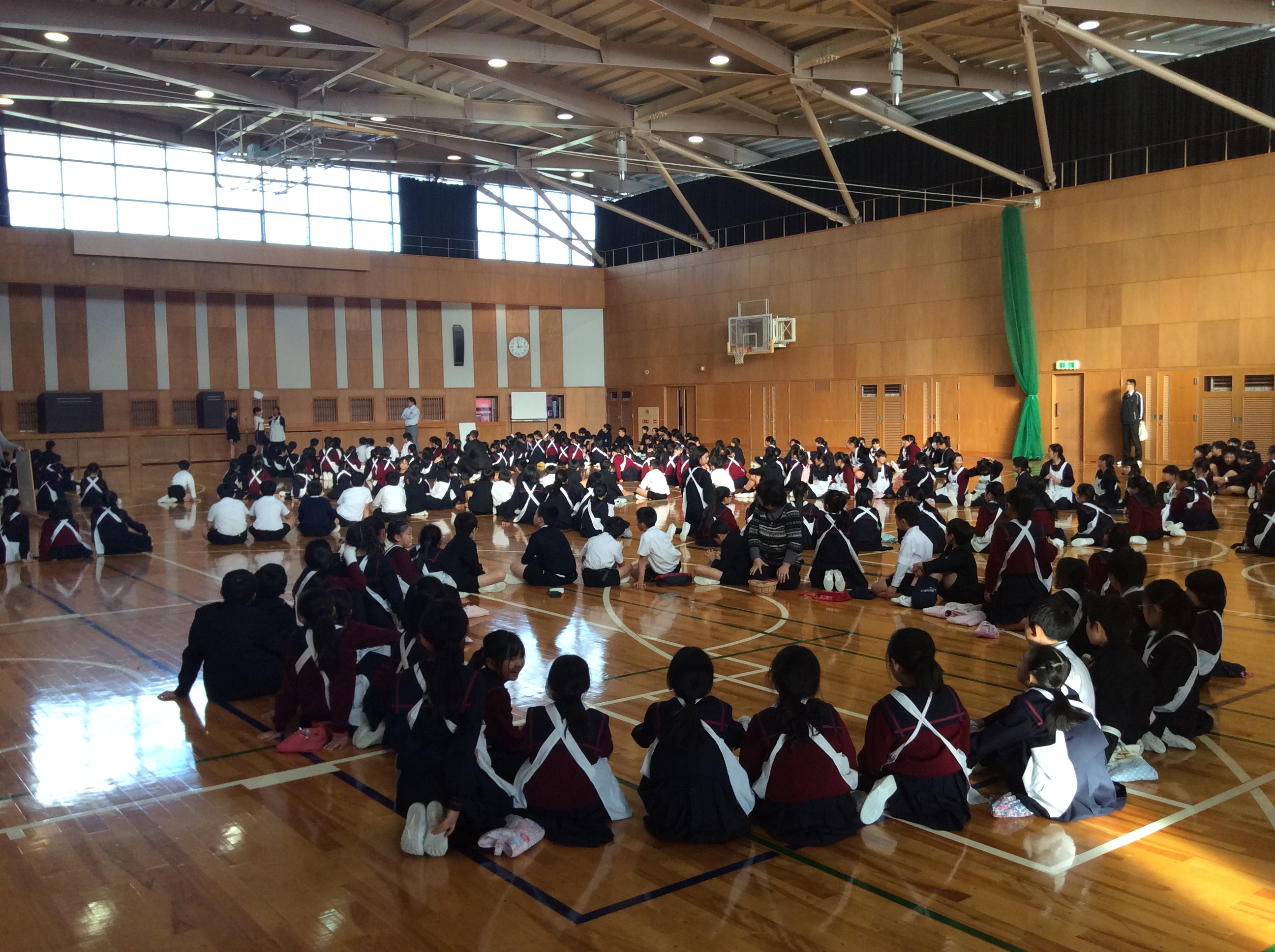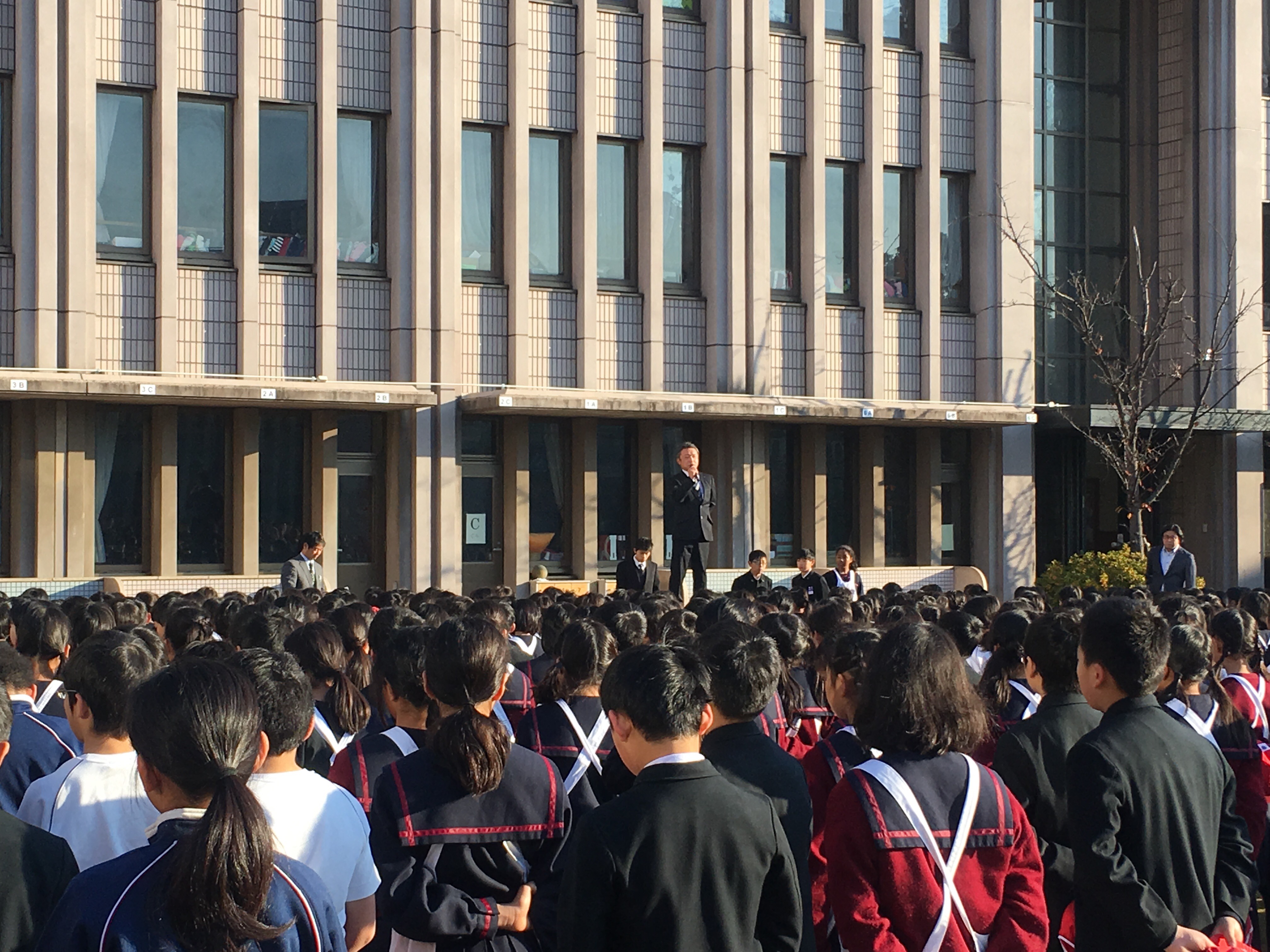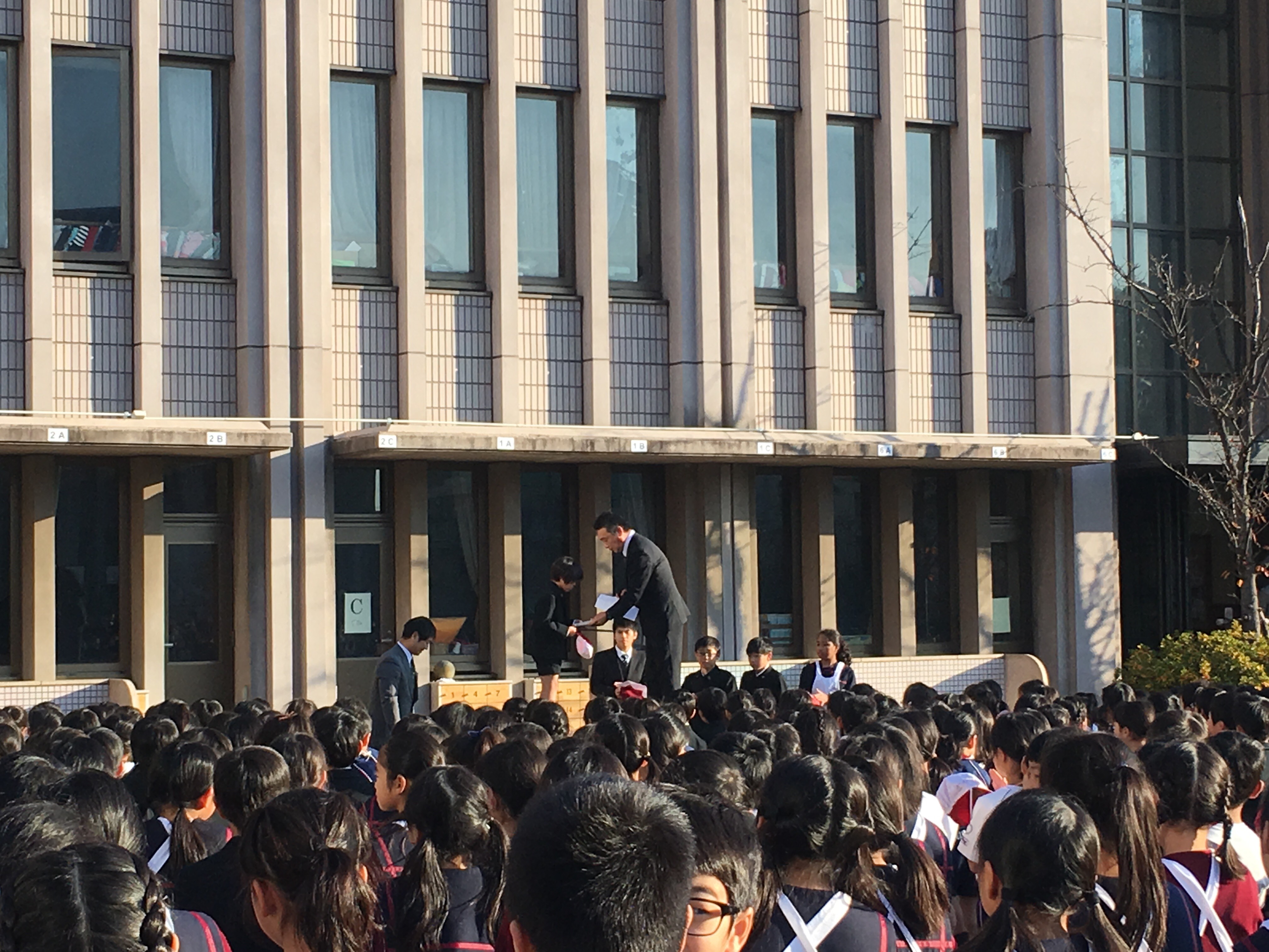 肌寒さが感じられる秋晴れの中、今日も全校朝礼が行われました。