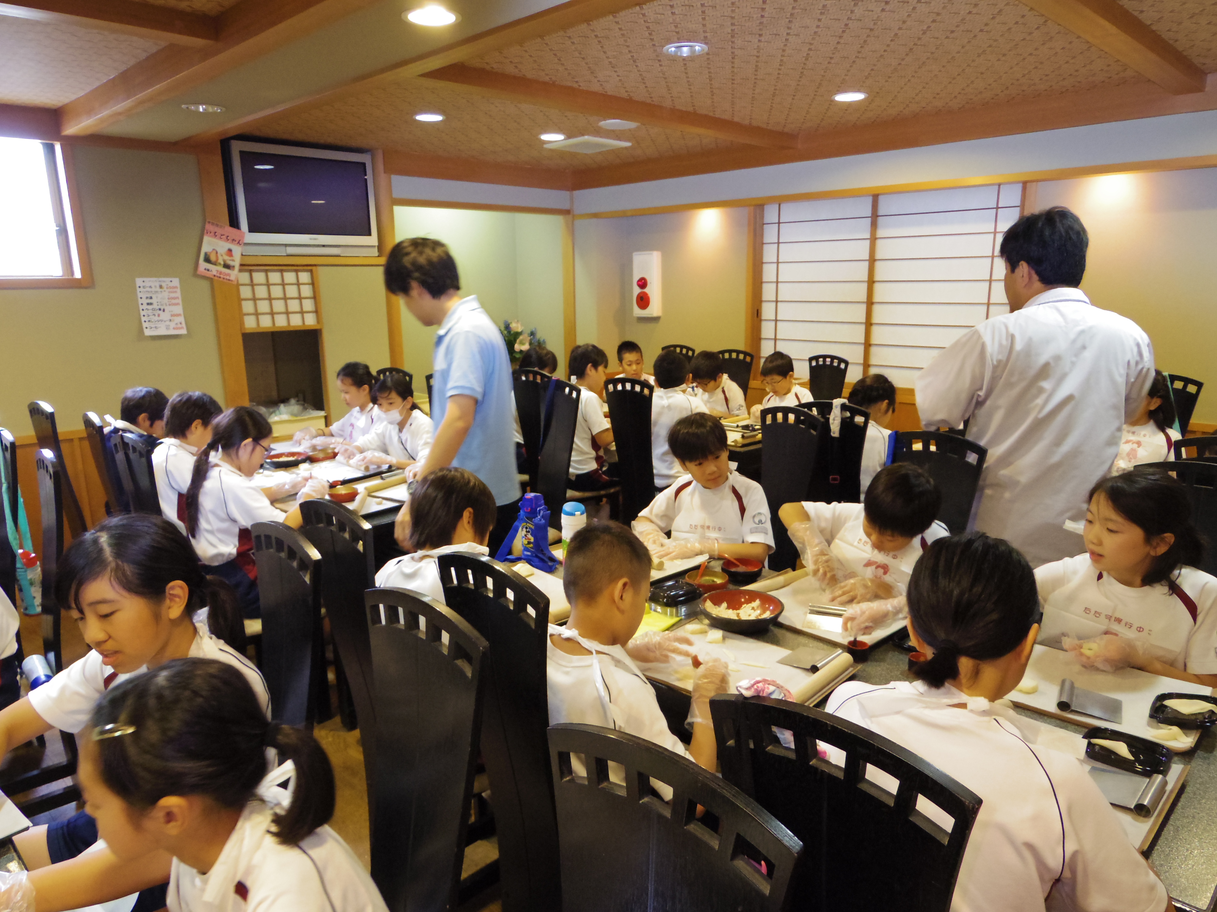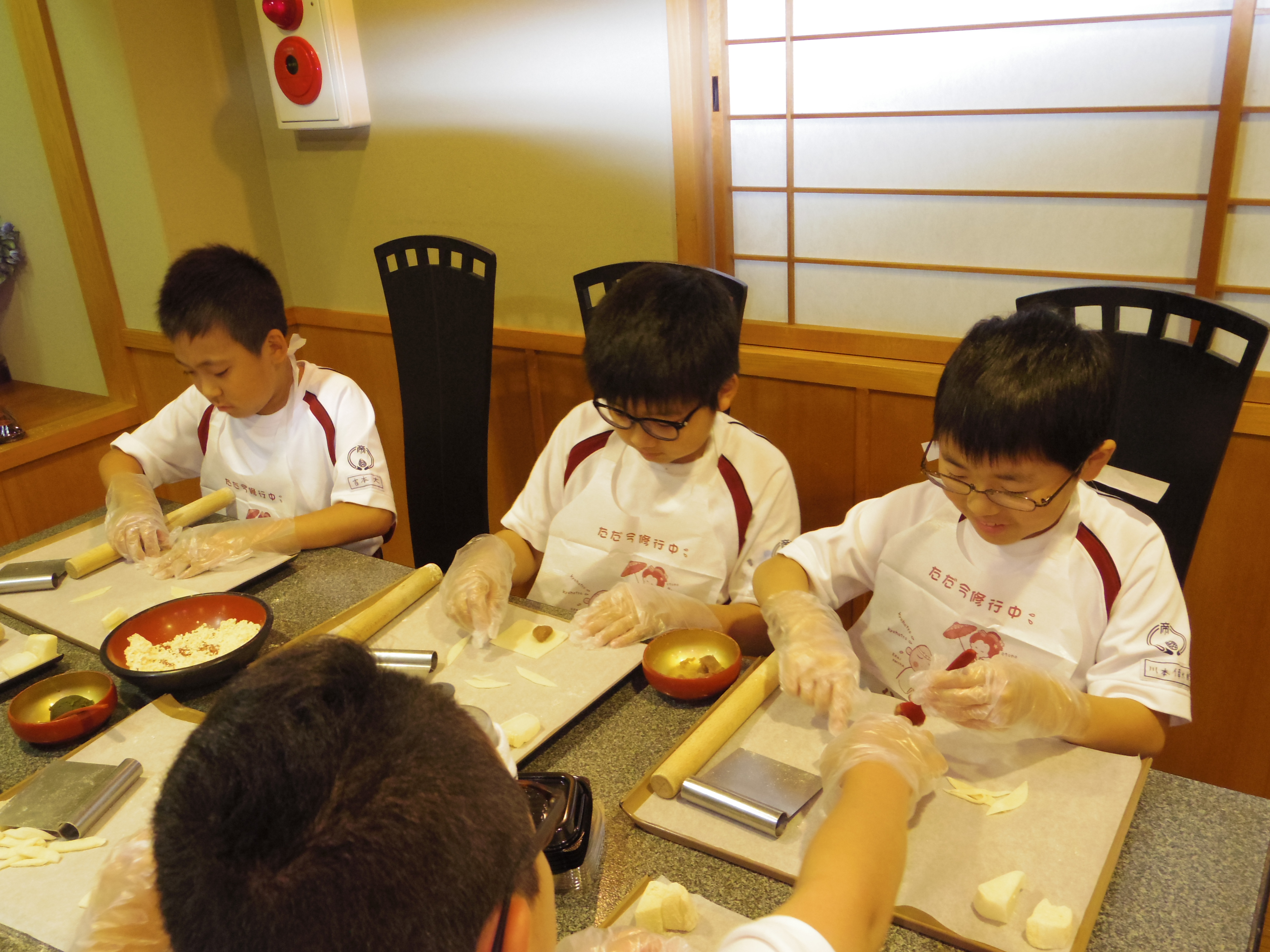 生地をのばして、正方形に切ってから餡をつつんで、3種類の味をつくることができました。生地の端の部分をつまんで、おいしく食べて、口のまわりいっぱいに粉をつけた笑顔をみることができました。