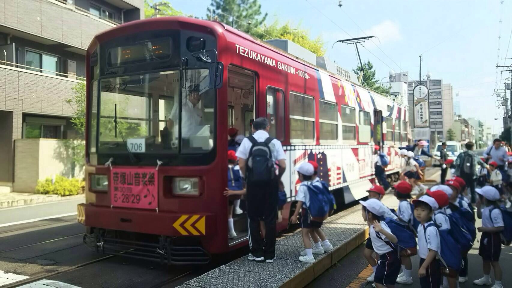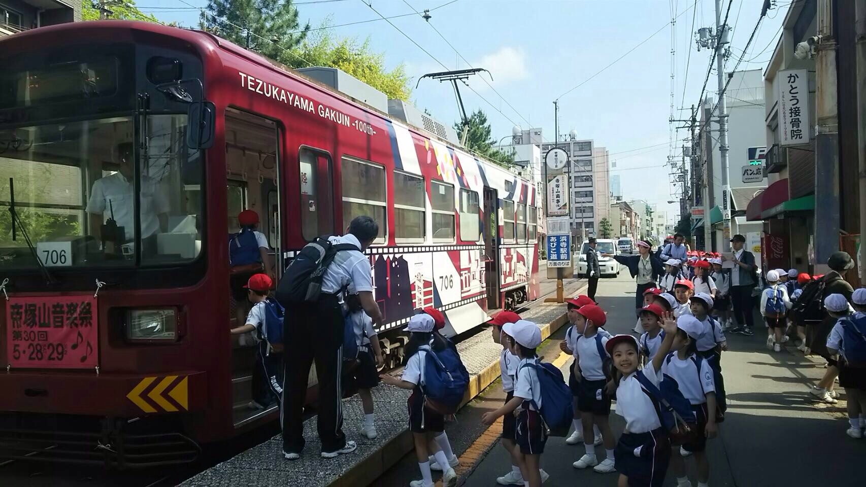 今日は1年生から4年生の遠足でした。1年生は浜寺公園に出かけました。阪堺電車さんの計らいで、帝塚山100周年バージョンの路面電車がきてみんなビックリ。快晴のもと、とっても楽しい一日でした。