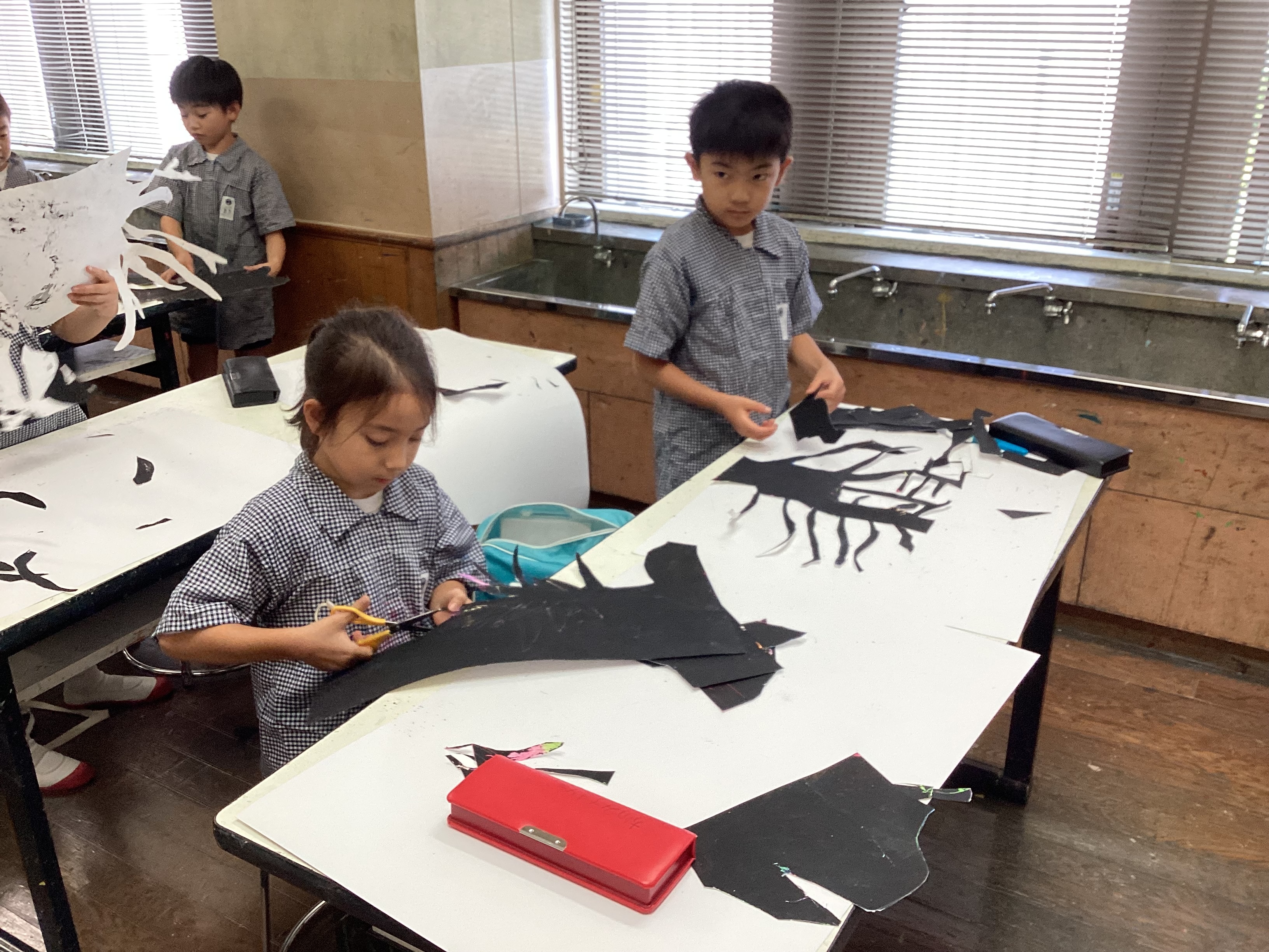 台紙に貼り付けた夢の木は、一人ひとり木の形が違い、味があります。次回の授業ではスクラッチ(引っかき)の技法を用いて木に夢を表現していきます。