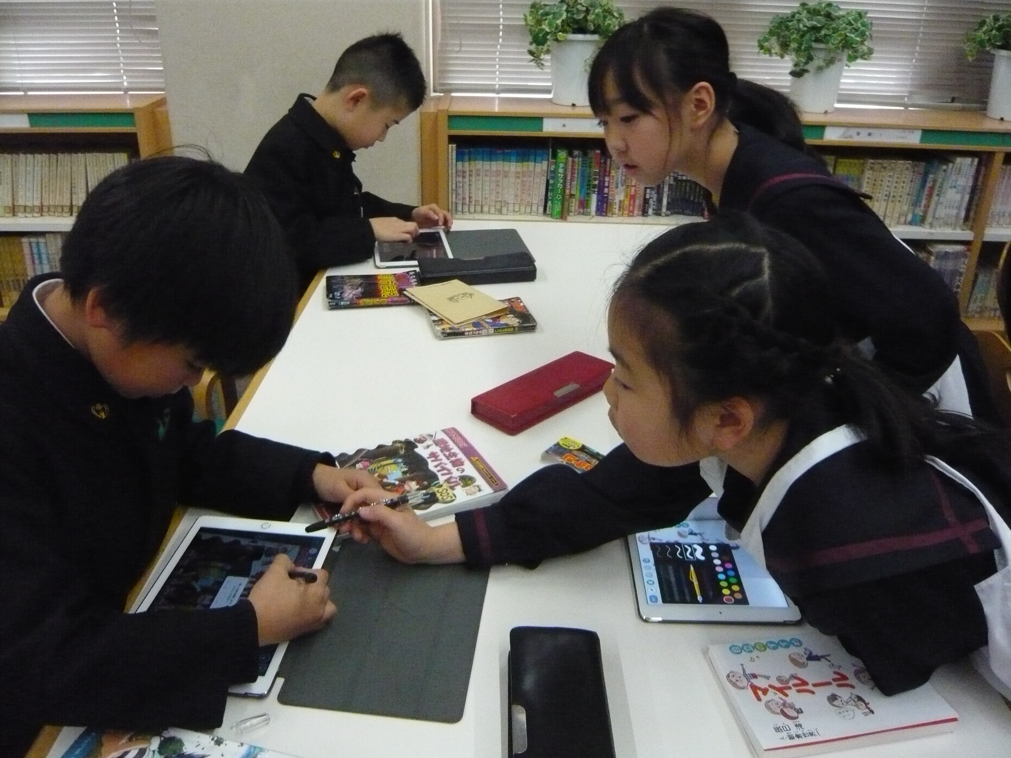 4年生の児童は、プレゼン用アプリの機能に気づき、自由に絵や字を書いたり、写真を撮ったり、写真の上に字を書いたり、紹介メッセージを音声にして残したり、いろいろなことを試していました。