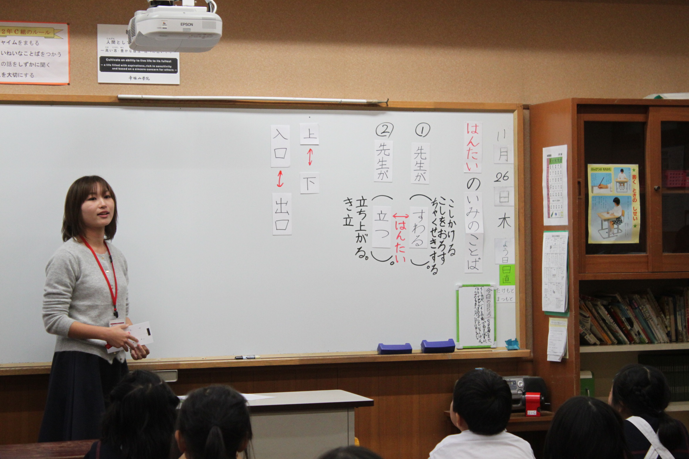6年生は伝え方を一生懸命考え、1年生はその言葉を聞いて一生懸命跳んでいました。