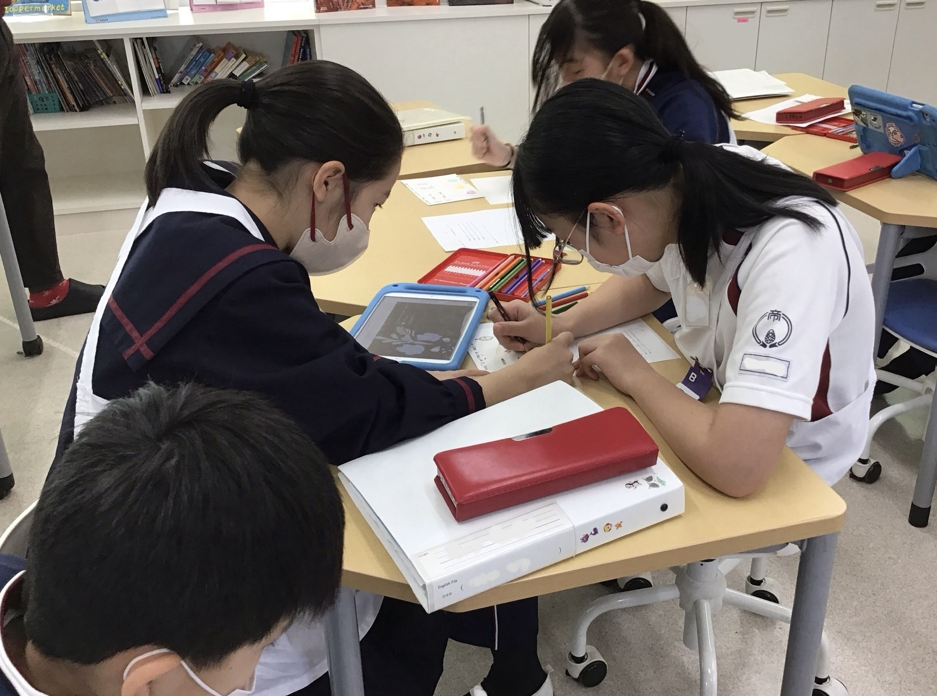 グループで、名前の音に合わせた素敵な漢字を考え意見を出し合います。カードには筆ペンを使ったり絵を描いたり、グループごとに工夫して楽しそうに作業を進めました。完成したカードがアーミデイルのお友だちに届く日が楽しみです。