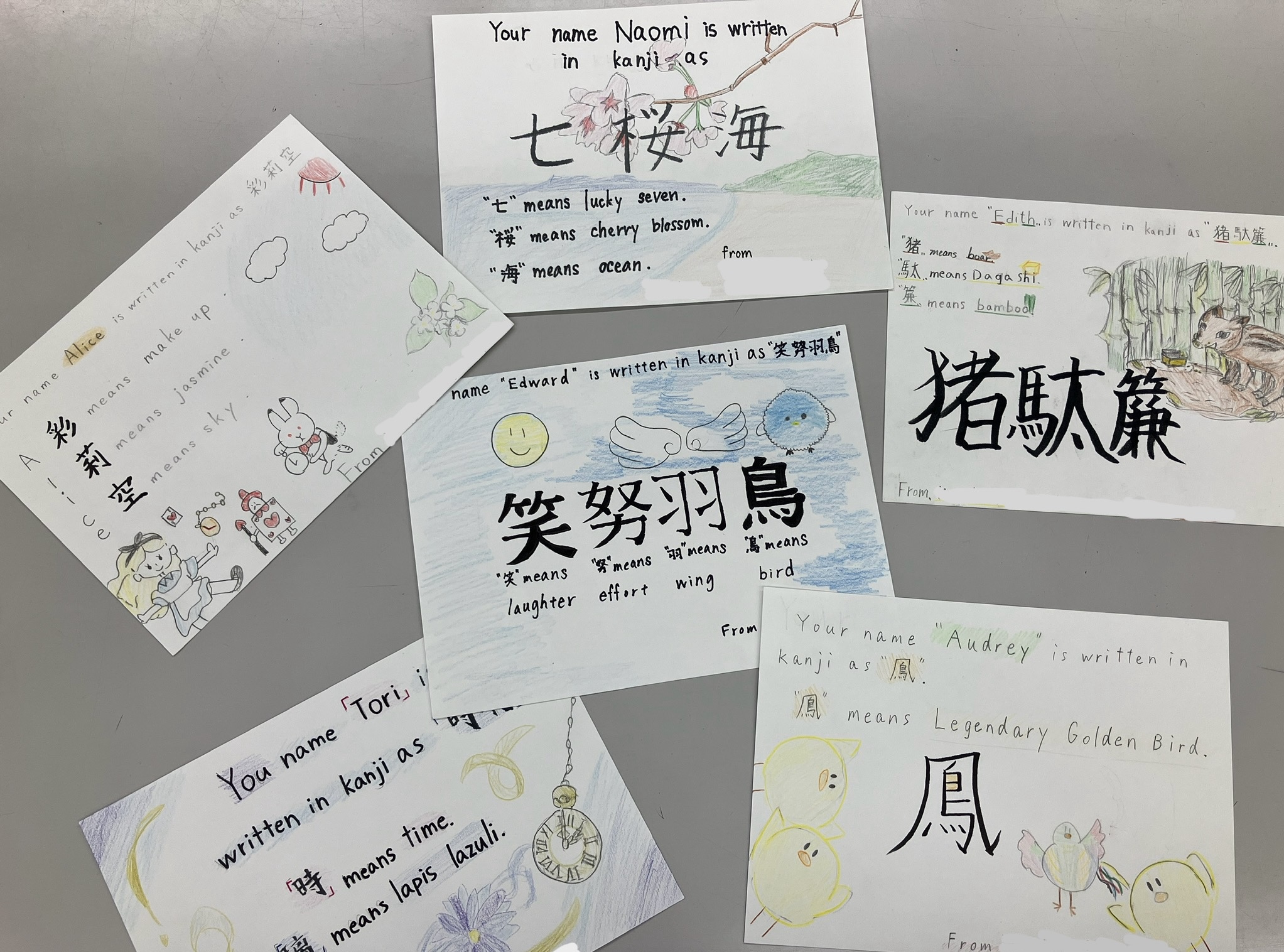 そして、今年の6年生も、アーミデイルのお友だちの名前を漢字にしてカードを作成し、プレゼントをする恊働学習を行いました。