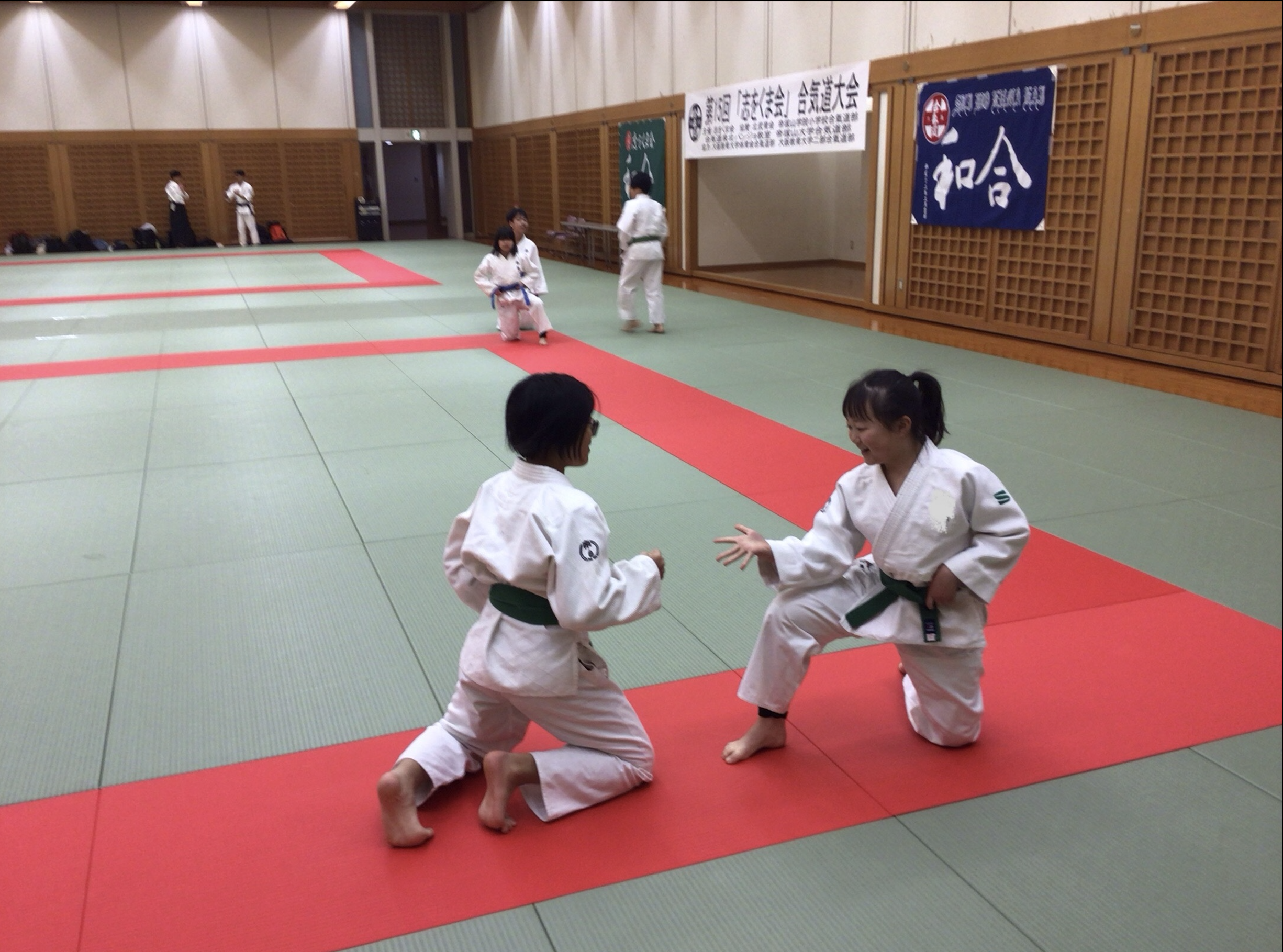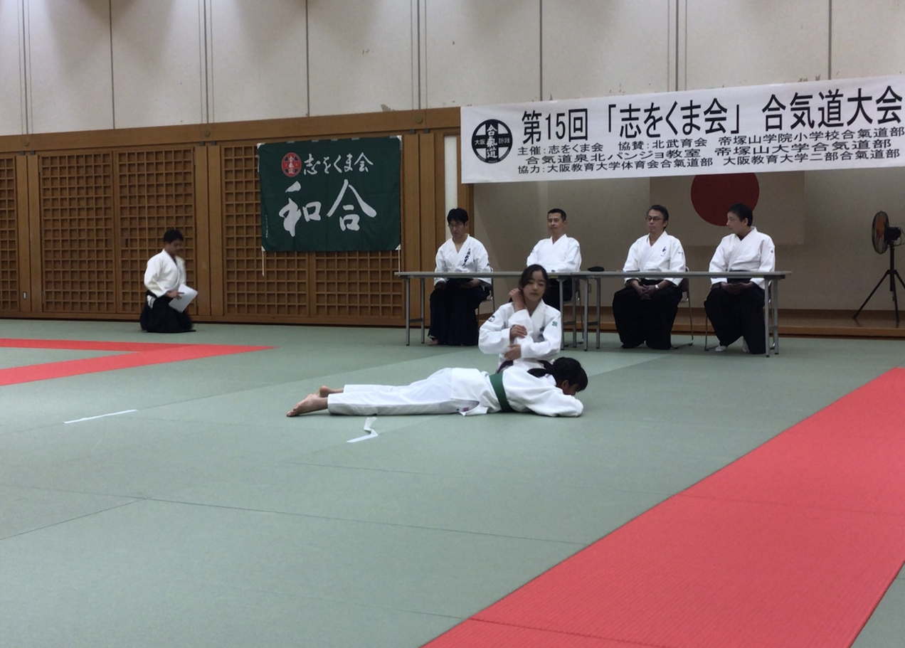 2月1日(日)の審査に引き続き、2月2日(月)から2月6日(金)も早朝練習に臨んだ合氣道部員は、2月7日(土)に大阪市立中央体育館で、第15回志をくま会合氣道大会に参加しました。到着してから始まるまでに時間があったので、膝行じゃんけんでウォーミングアップをしました。そして、1組ずつ演武を発表していきました。どのペアも気合十分、迫力のある技を披露することができました。