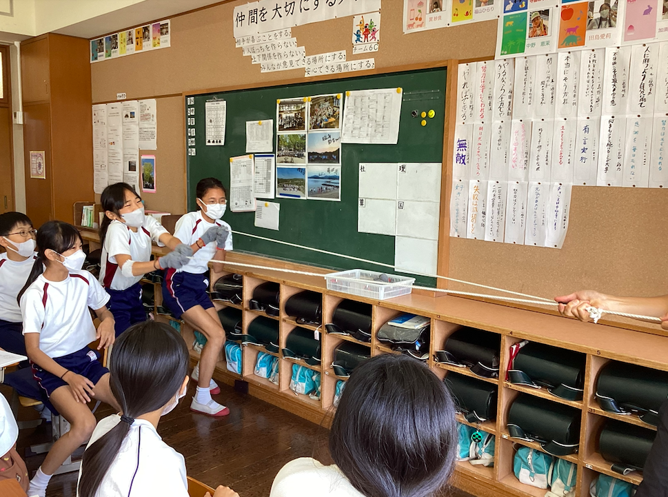 定滑車と動滑車のちがいを学ぶなかで、実際に手ごたえをみんなで体感しました。