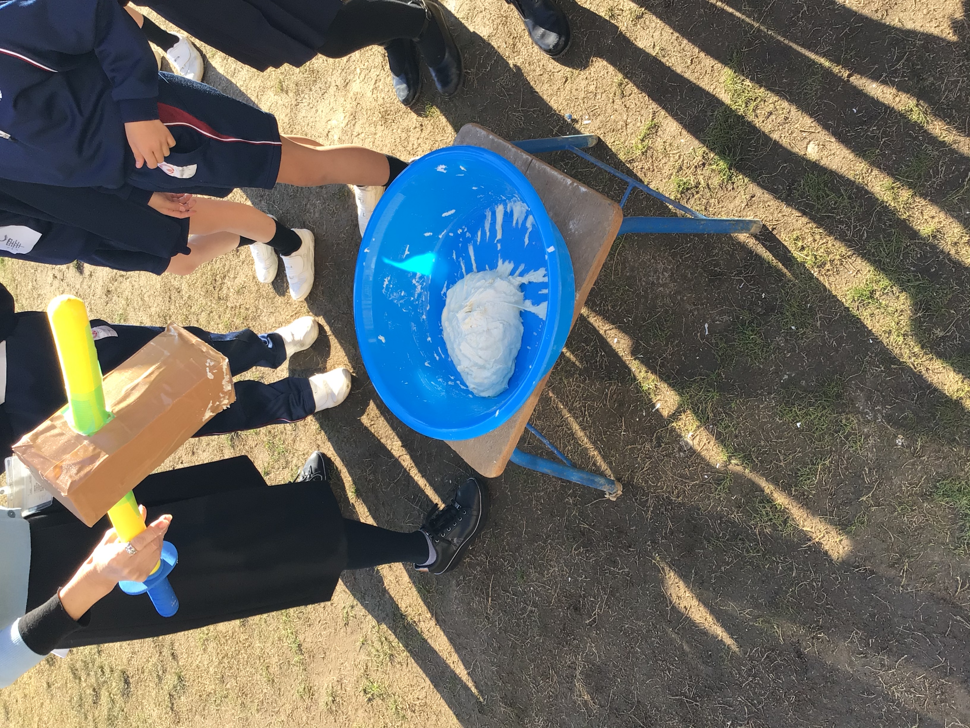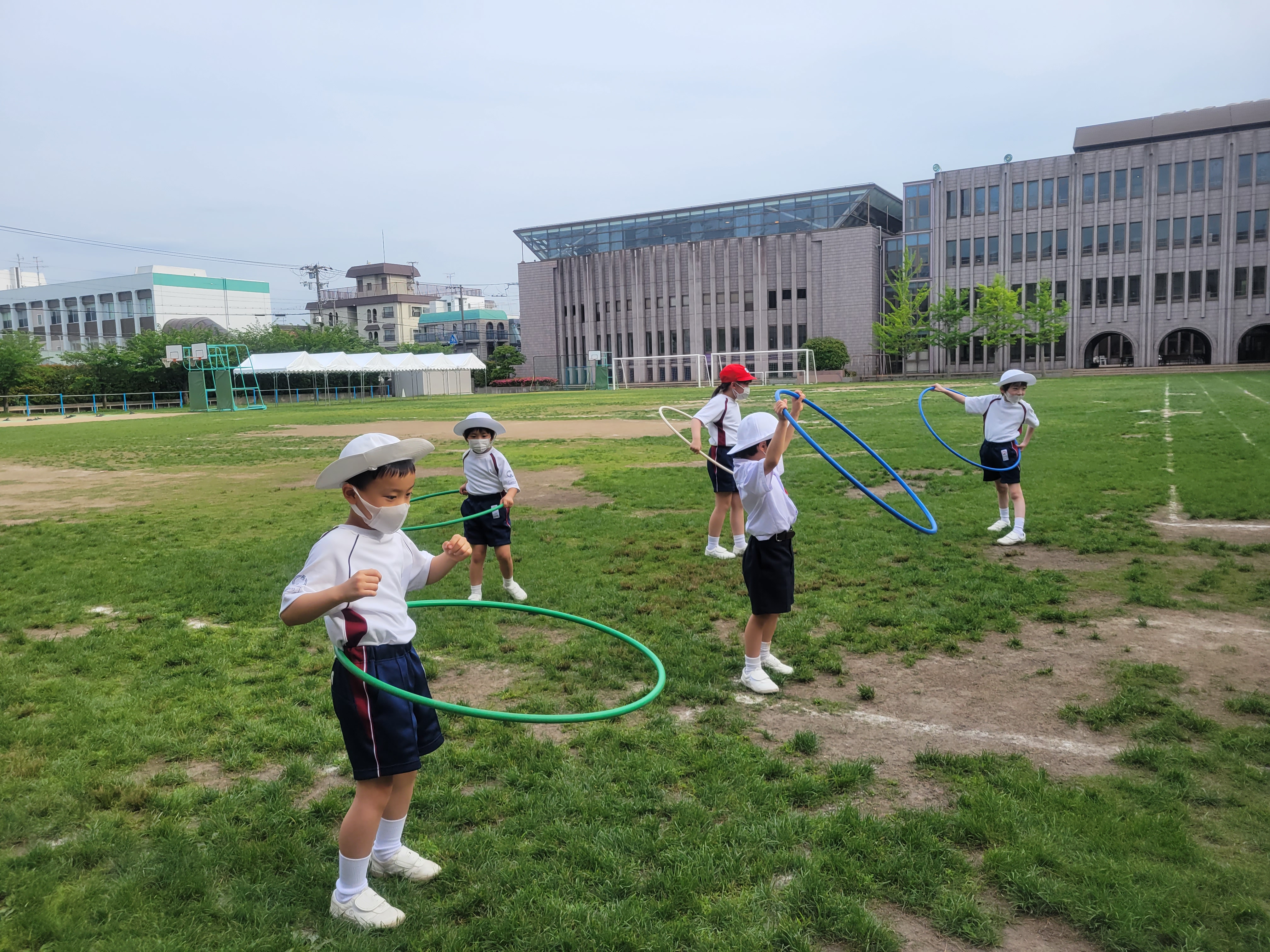 一人ひとりの健康観察をした後、フラフープ、短なわとび、長なわとび、ボール遊び、ゲームなどを50分程度します。途中何度も水分補給をして話し合いをして運動遊びをします。いつも2人組、チームを作り励まし、助け合っています。なわ操作がうまくできない子どもには助言をしています。子どもができたときの表情はにっこりして、できた喜びを体いっぱいに表現します。みんなも大きな拍手を送ります。こうした体験は子どもの大きな自信になります。