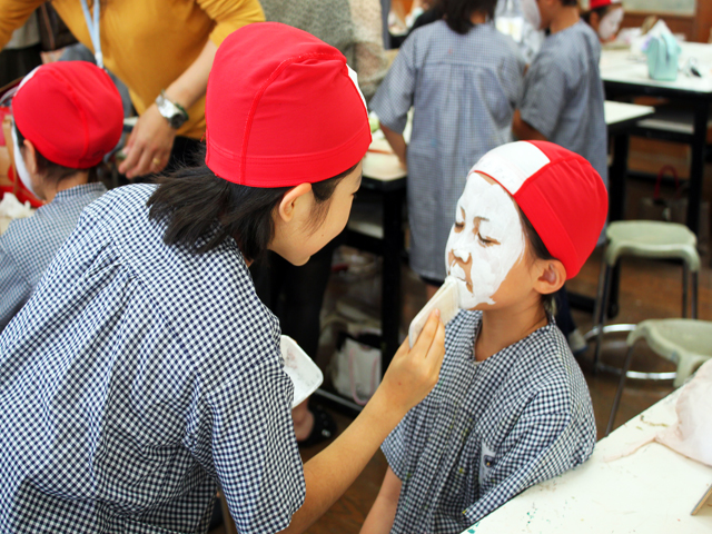 児童たちは、変身していく顔に驚き、真剣に取り組んでいました。