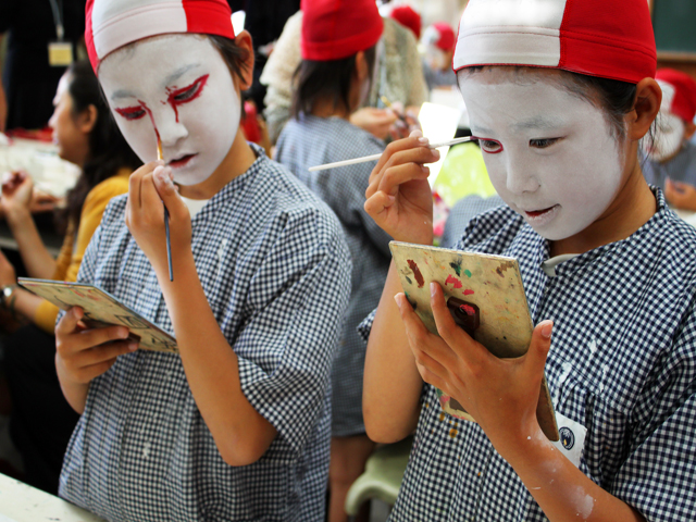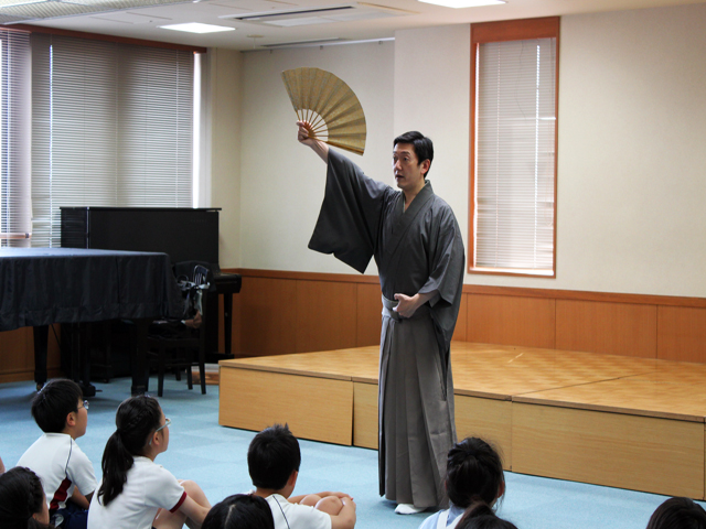 児童たちは、興味深く歌舞伎の授業を受けていました。