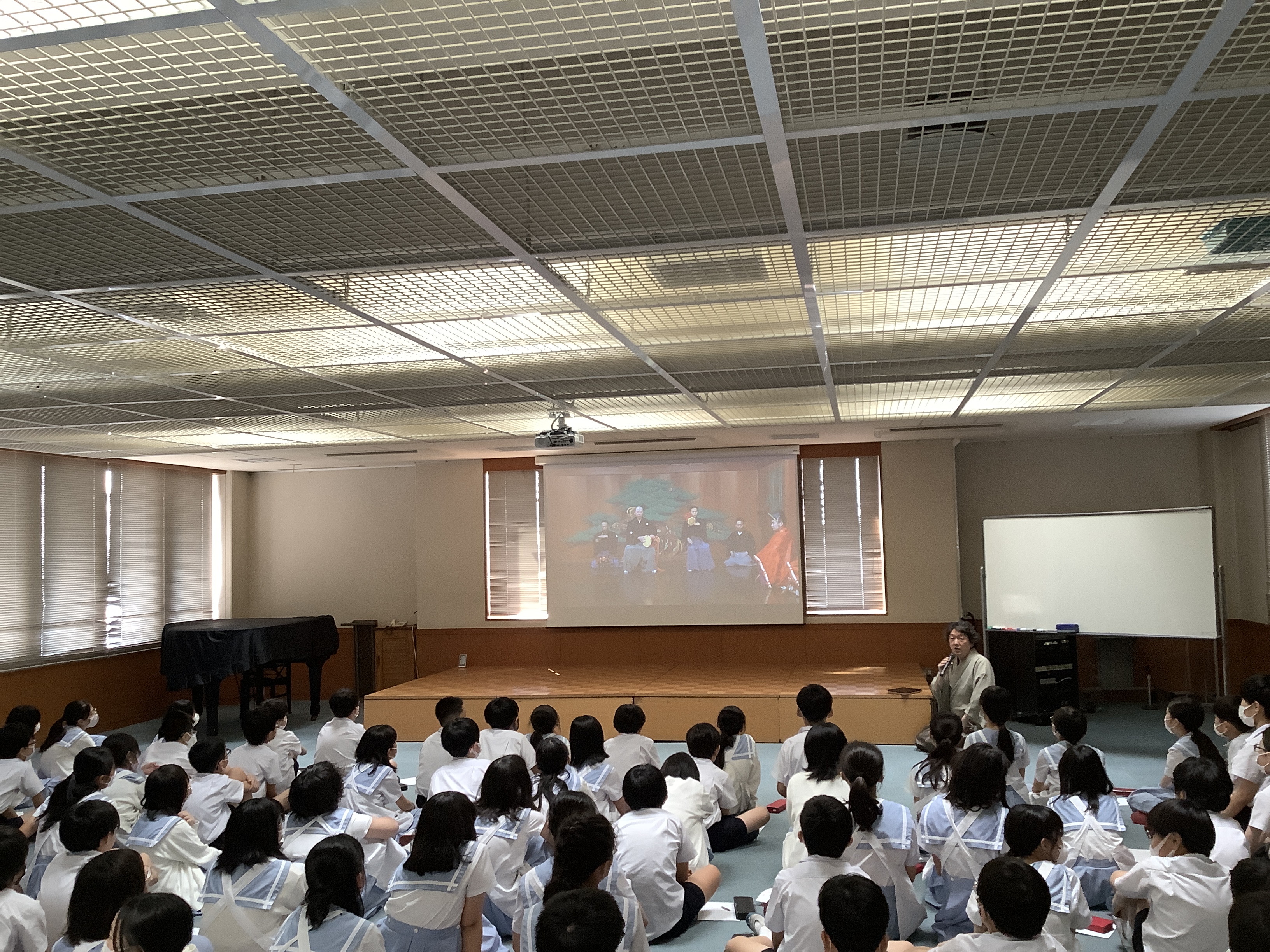 6年生は、山中迓晶先生に能についてのお話をしていただきました。