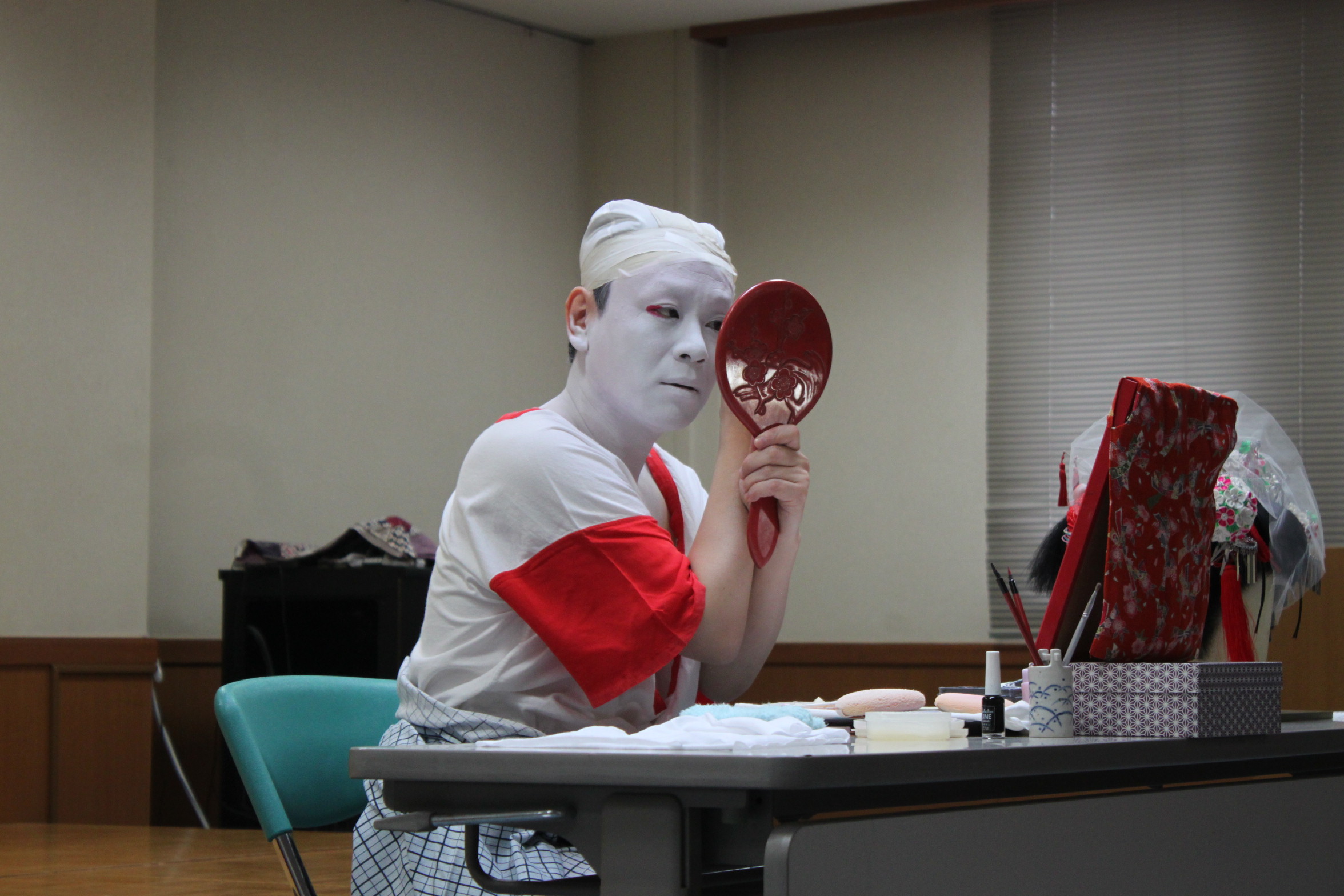 2日目の学習では、自分の顔に立役の化粧の1種「隈」を自分の顔に取っていきます。