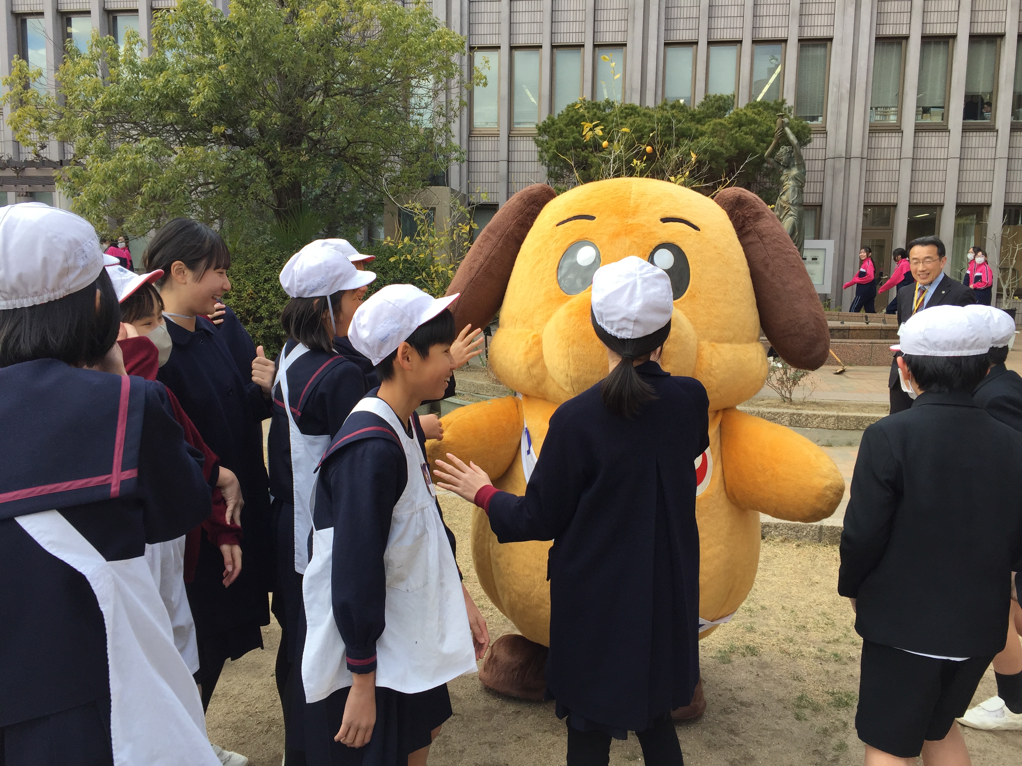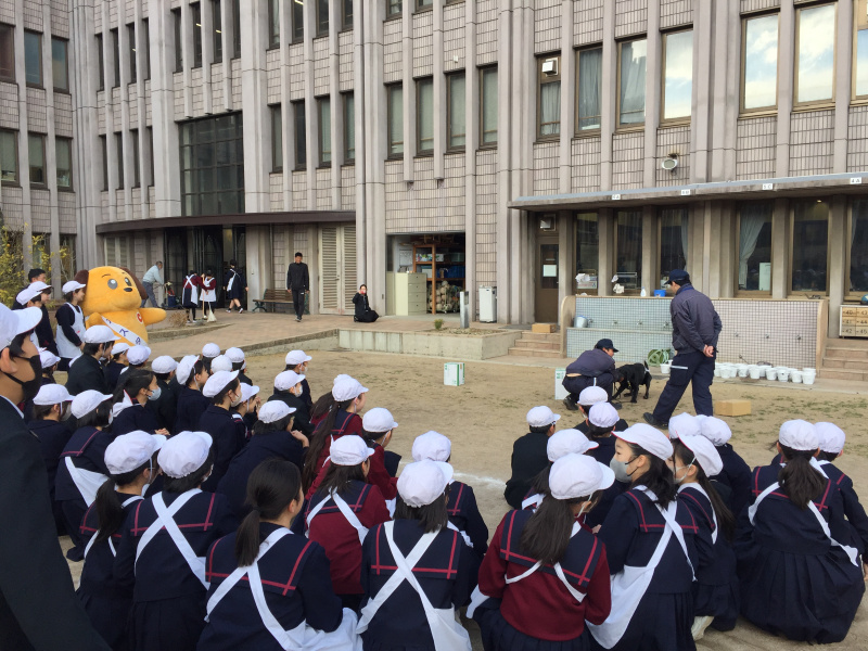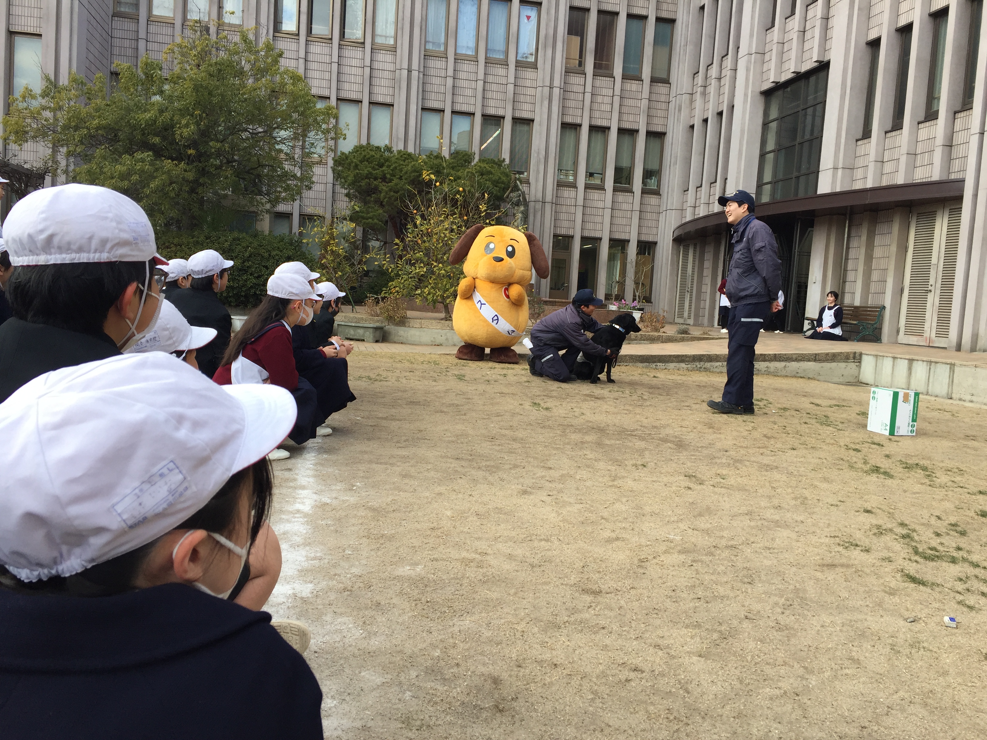 講師には、住吉税務署、大阪税関から来ていただき、更に麻薬探知犬やマスコットキャラクターのカスタム君まで特別ゲストとして来校。