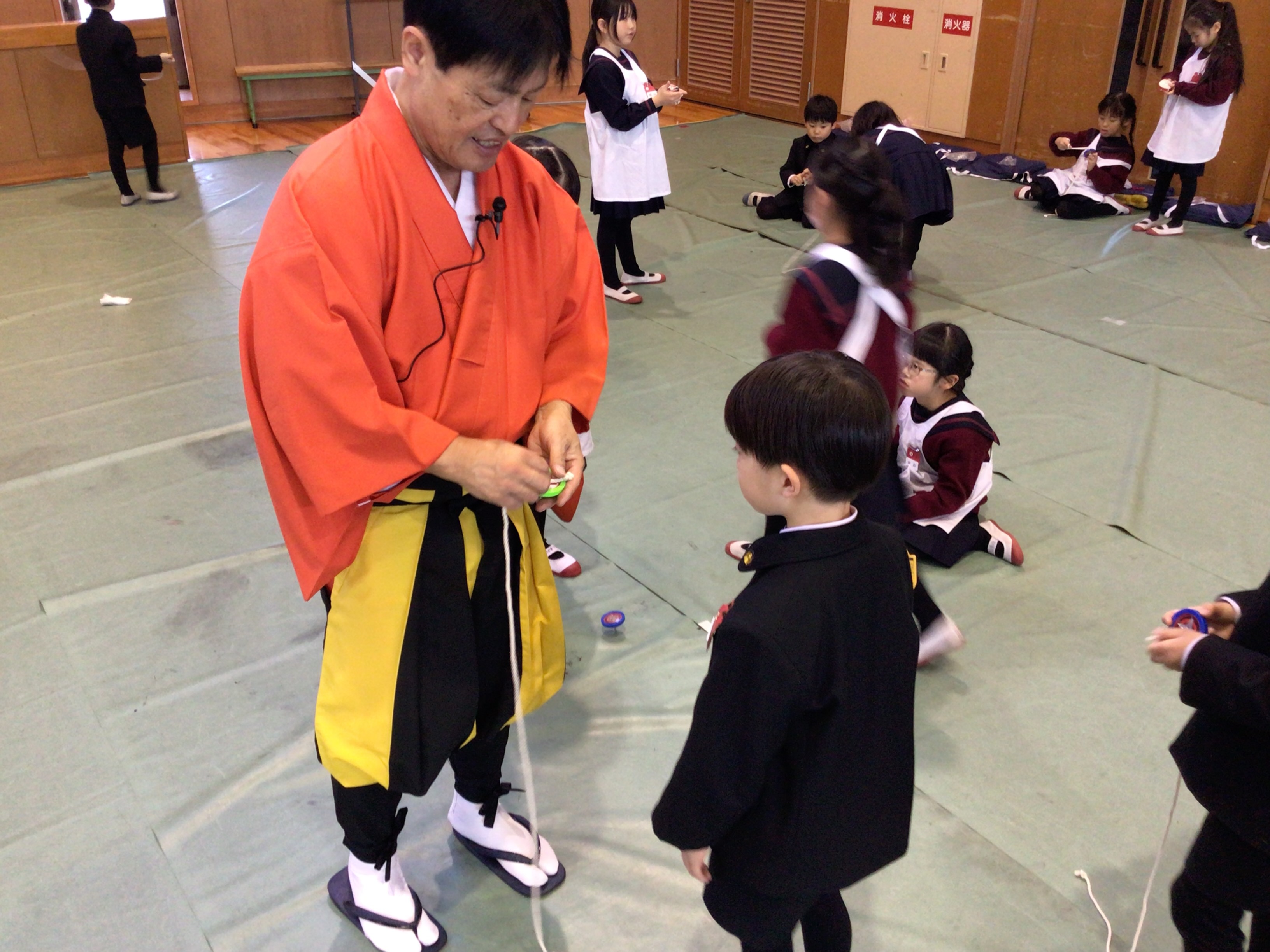 最後に、1年生のために、分かりやすくこまの回し方を教えていただき、みんなで練習をして、回すことができるようになりみんなとても喜んでいました。
