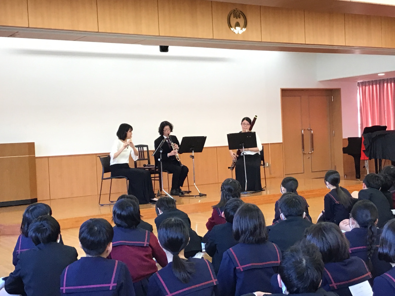 6年生では、フィルハーモニック・ウインズ大阪(Osakan)より3名の奏者の方々をお招きし、音楽鑑賞会をおこないました。