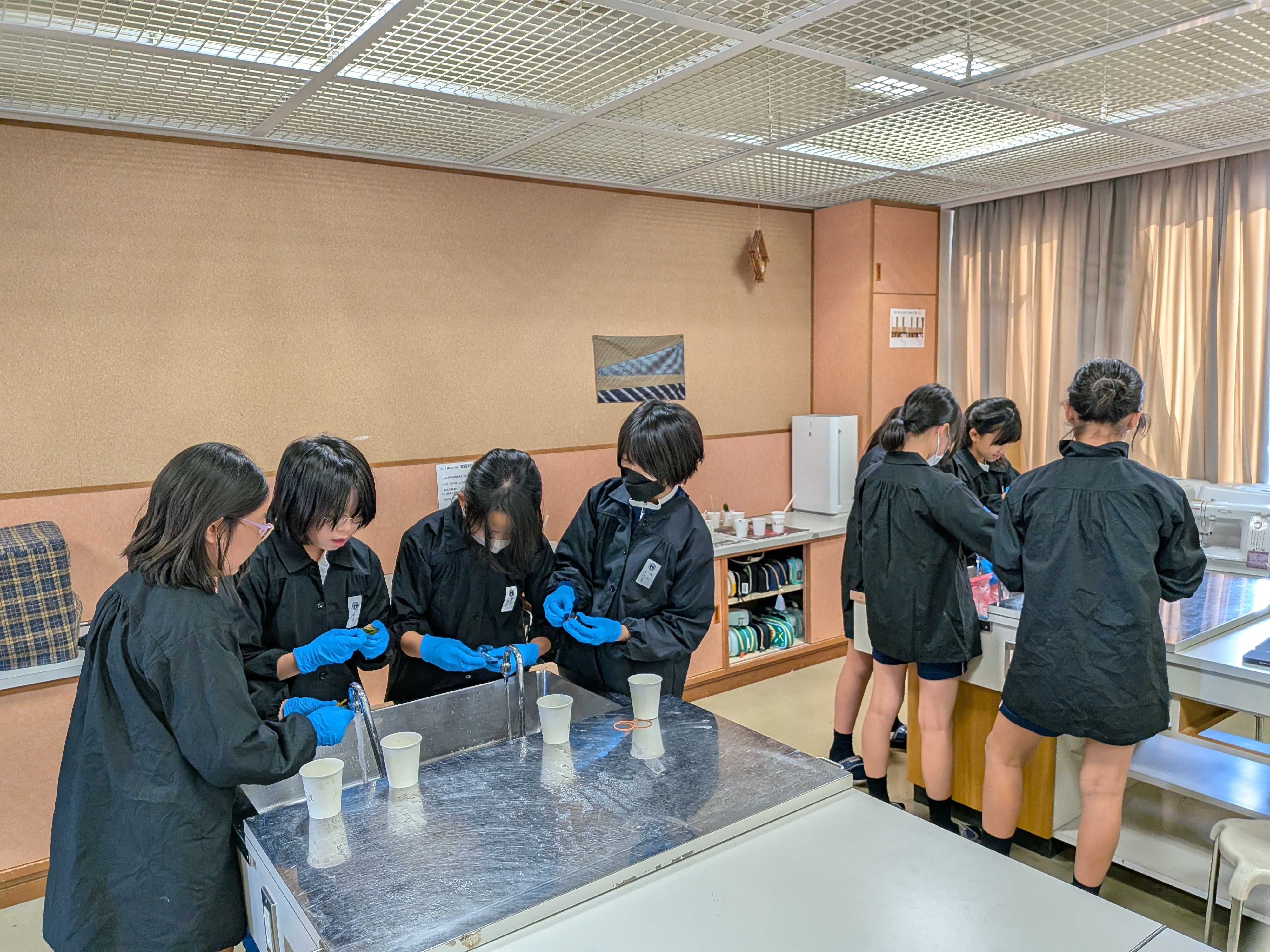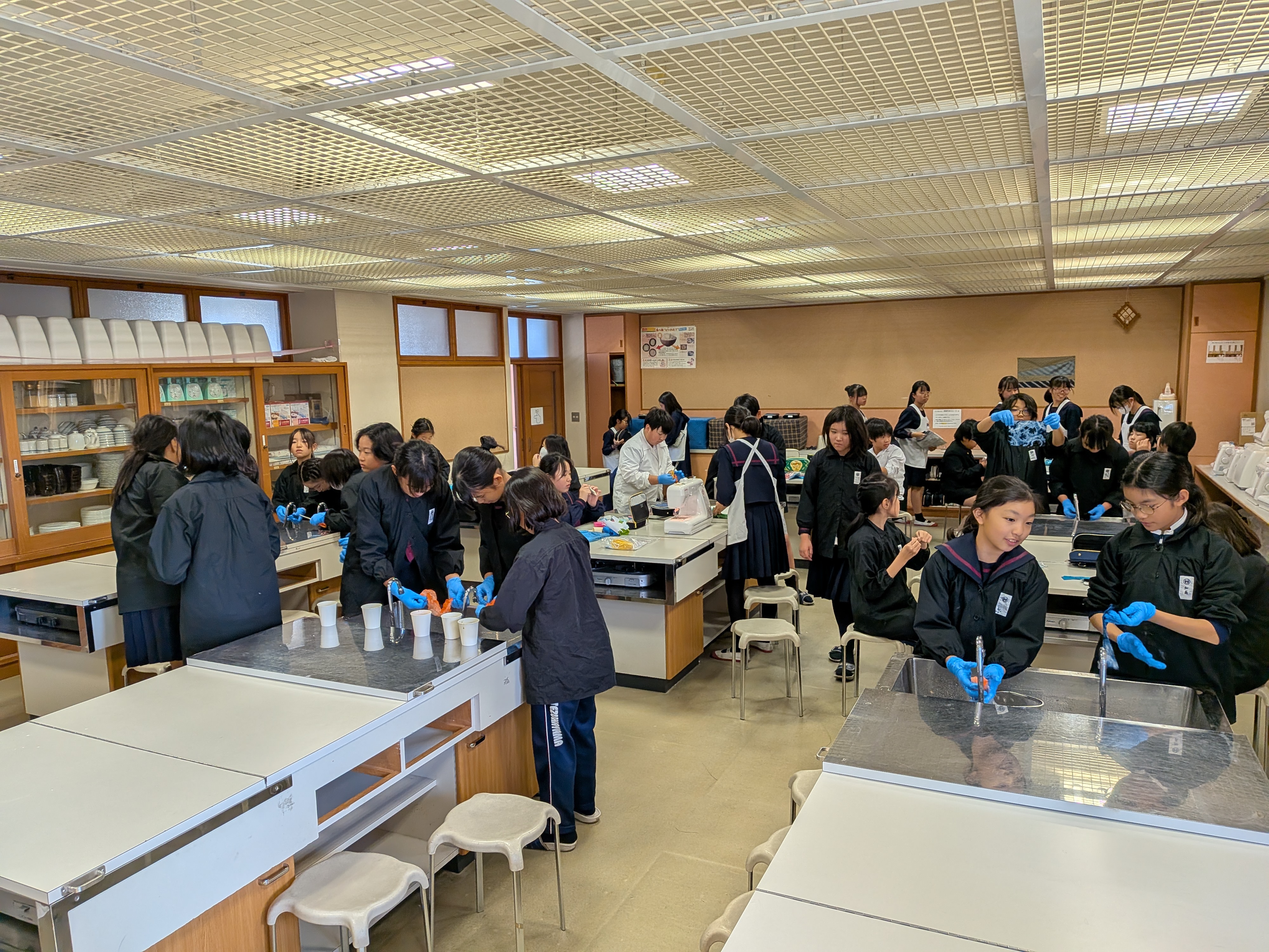 座学とは異なり、作業の進度に個人差が出たり、追加で取り組む作業があったりするため、5・6年生が家庭科室に集まり、それぞれの作業を進めているところです。