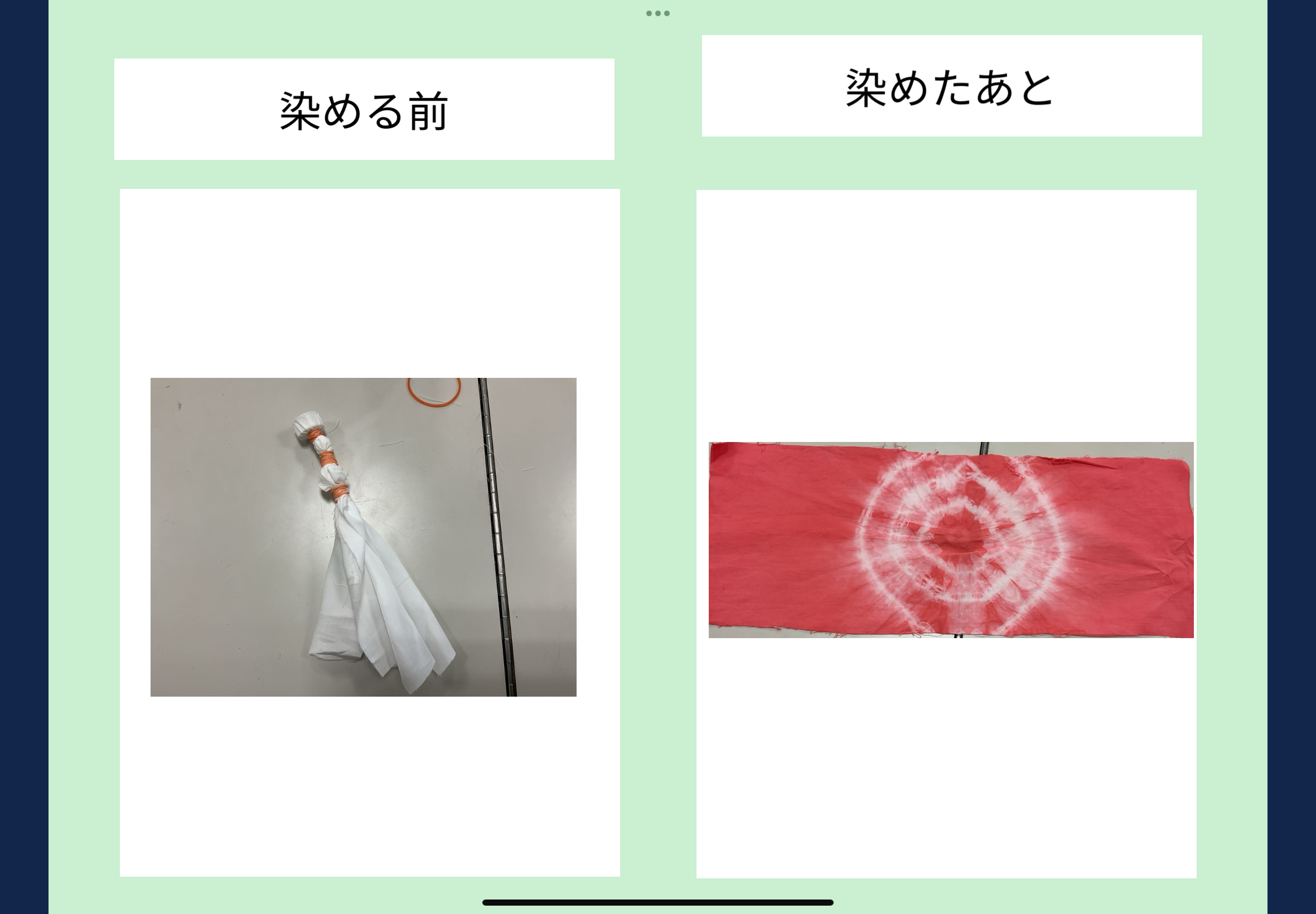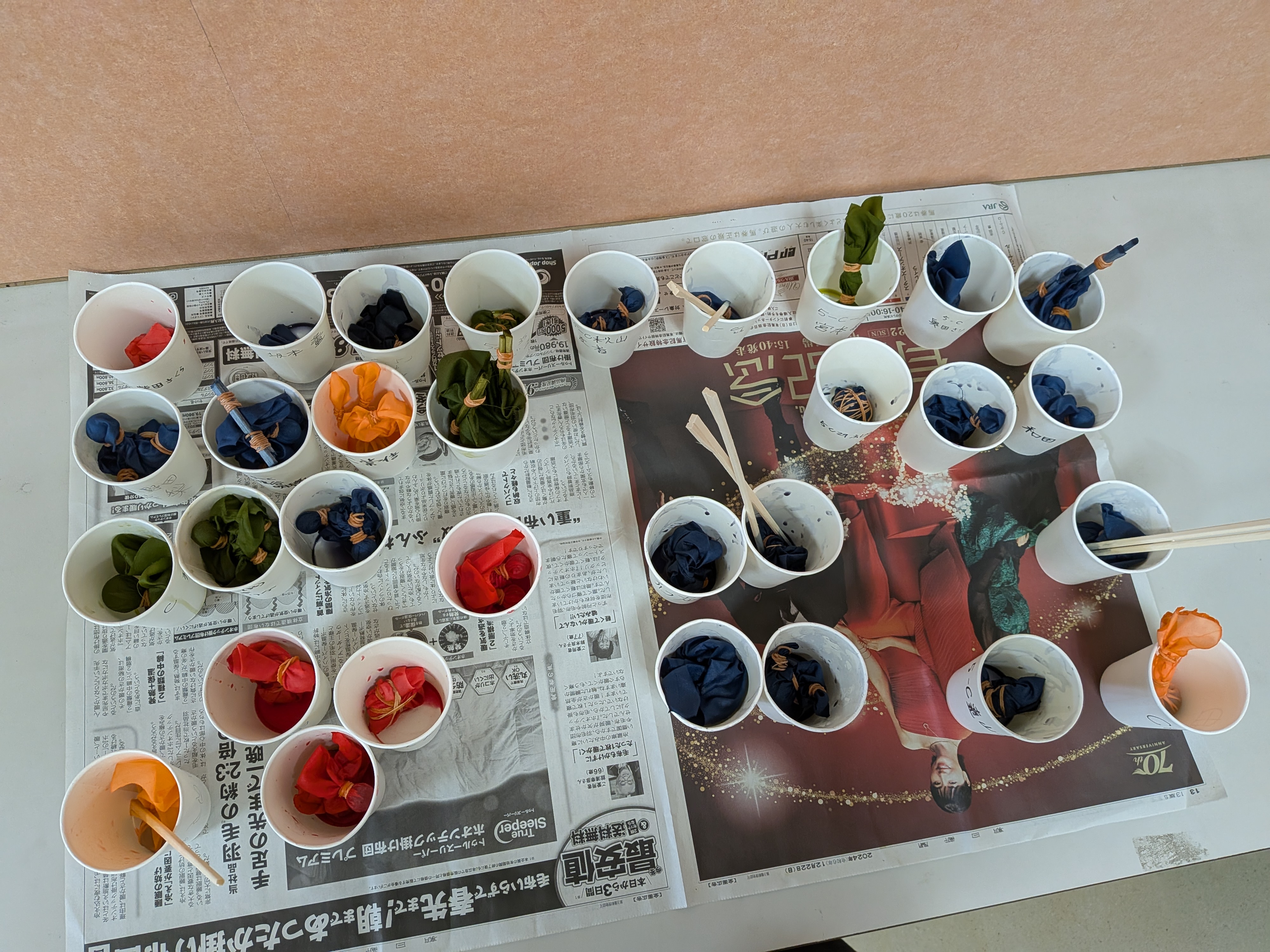 オリジナルの布を使って、ティッシュケースづくりを進めています。今週は、その布を染めるために、それぞれが思い思いの方法で絞り、染料につけ、すすいで干すところまで取り組みました。