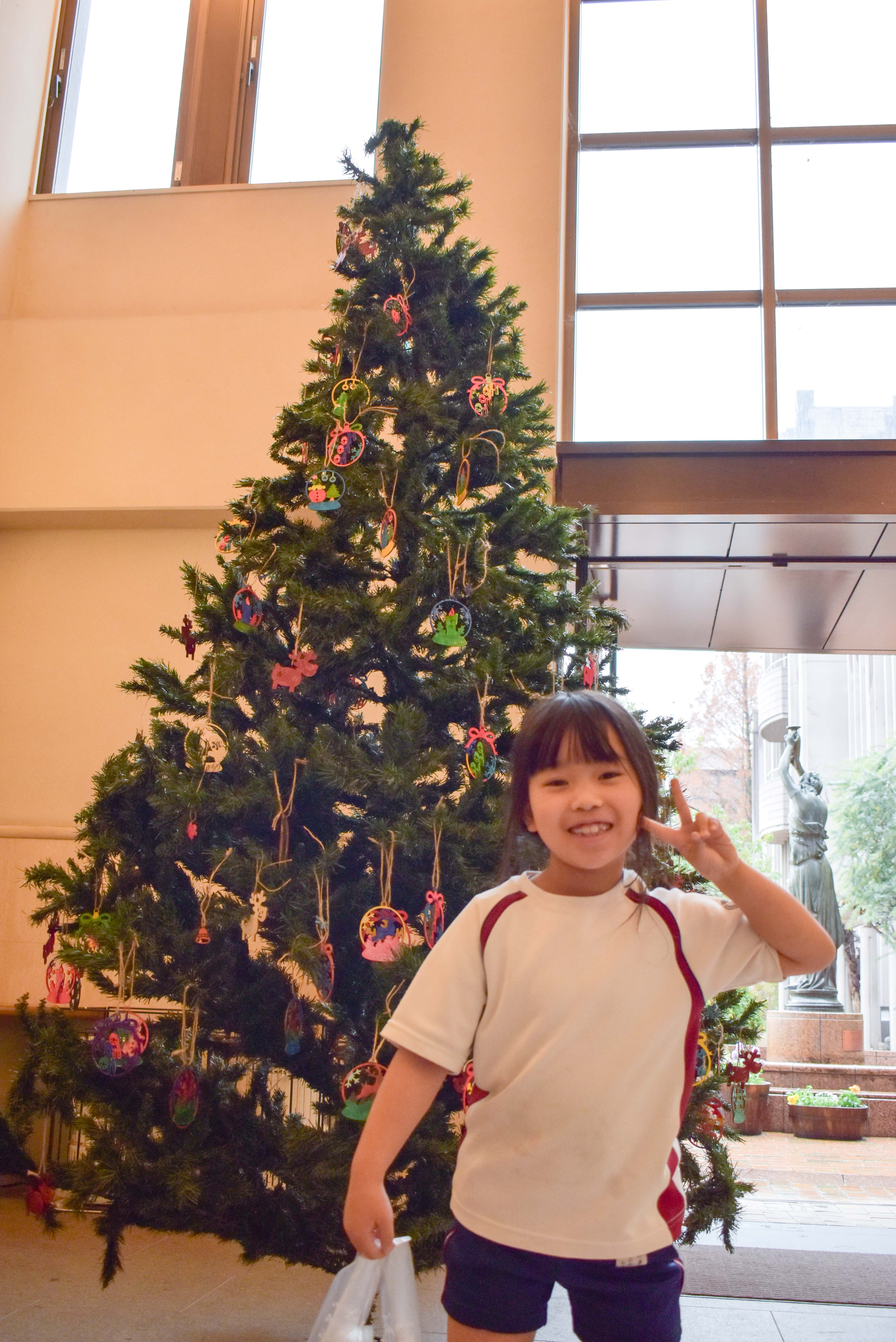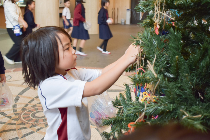 出来上がったオーナメントは正門にある大きなツリーに飾り付けました。