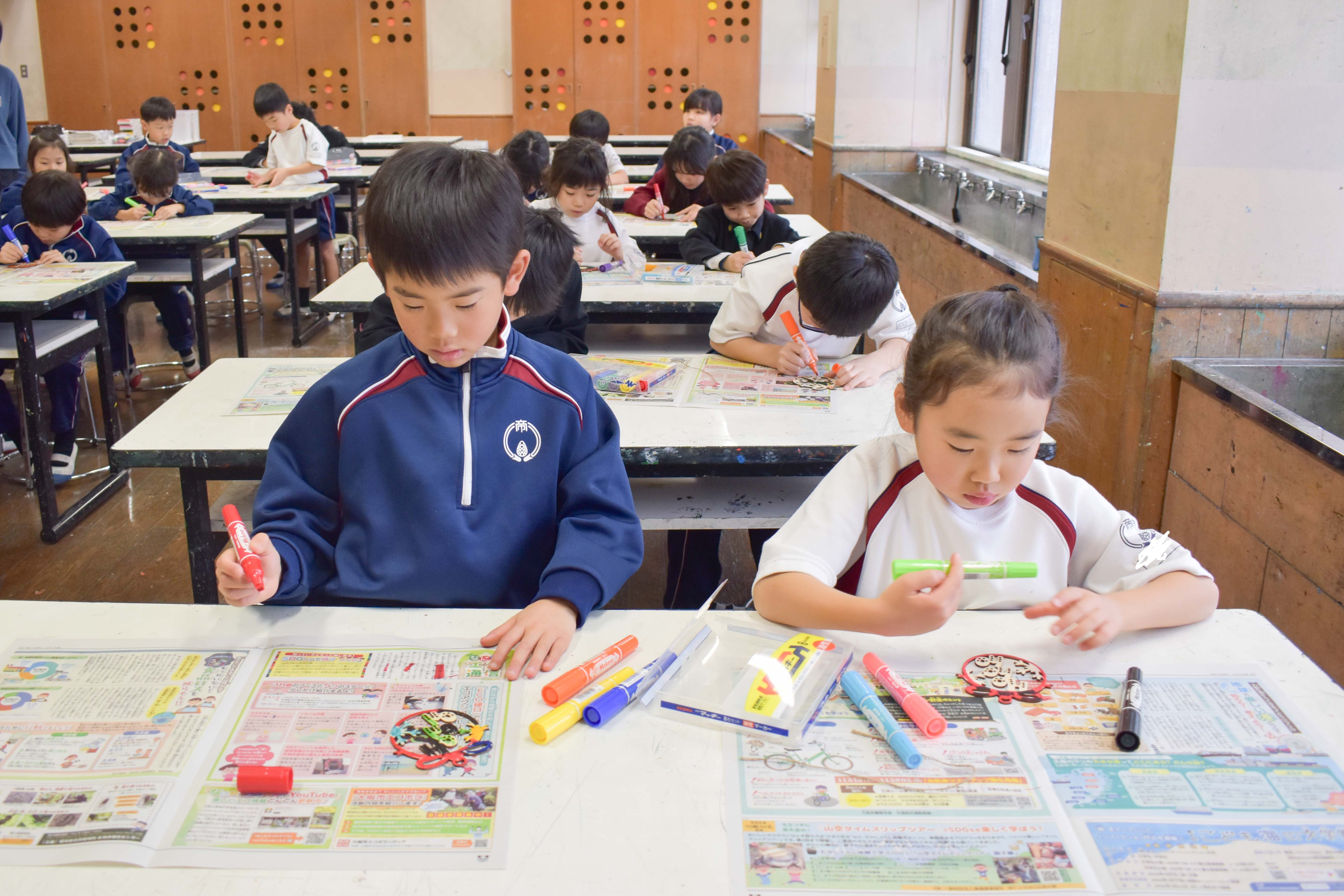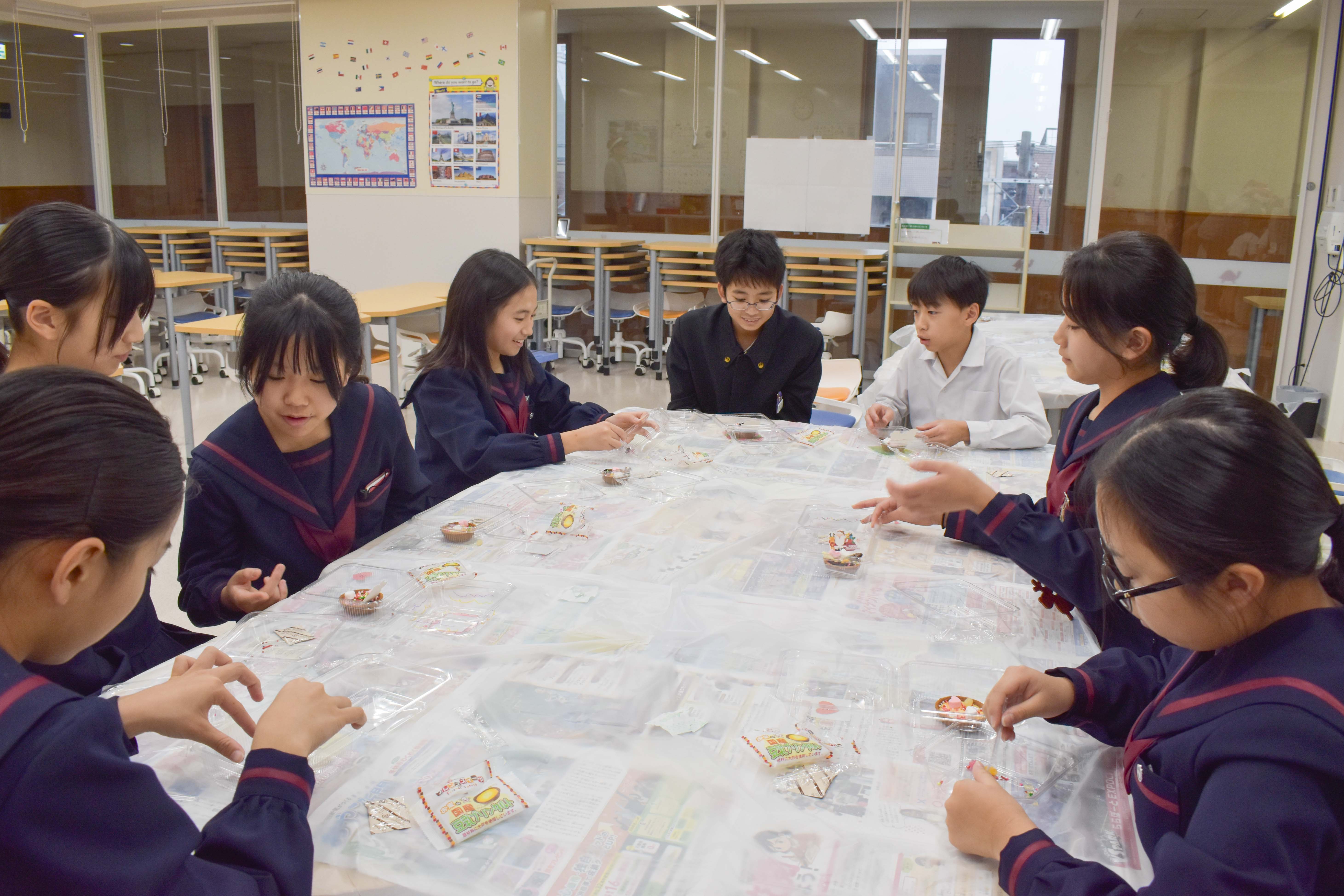 タルトデコレーションでは容器に好きな絵を描いたりシールを貼ったり、タルトに可愛いお菓子で飾り付けを行いました。