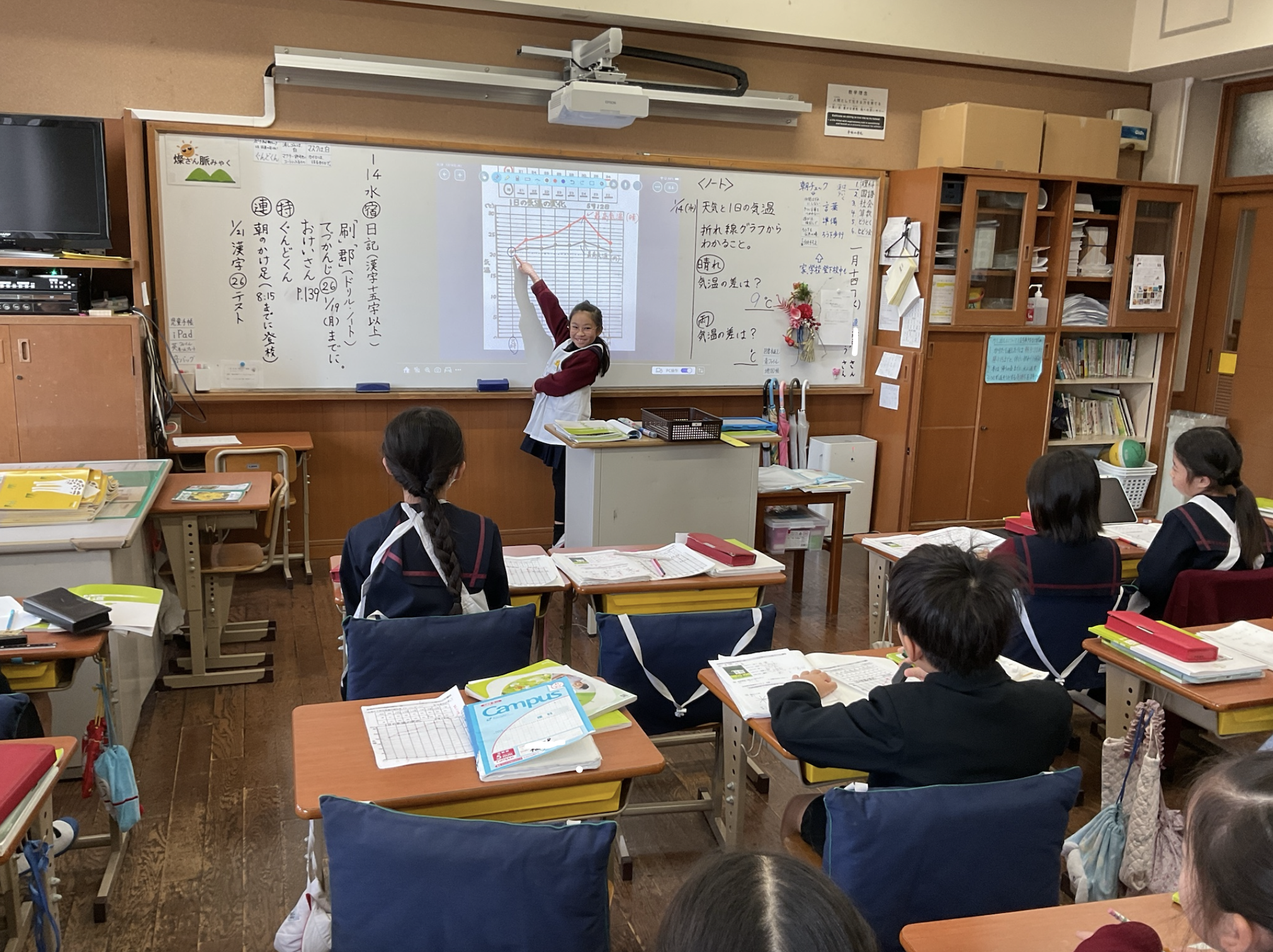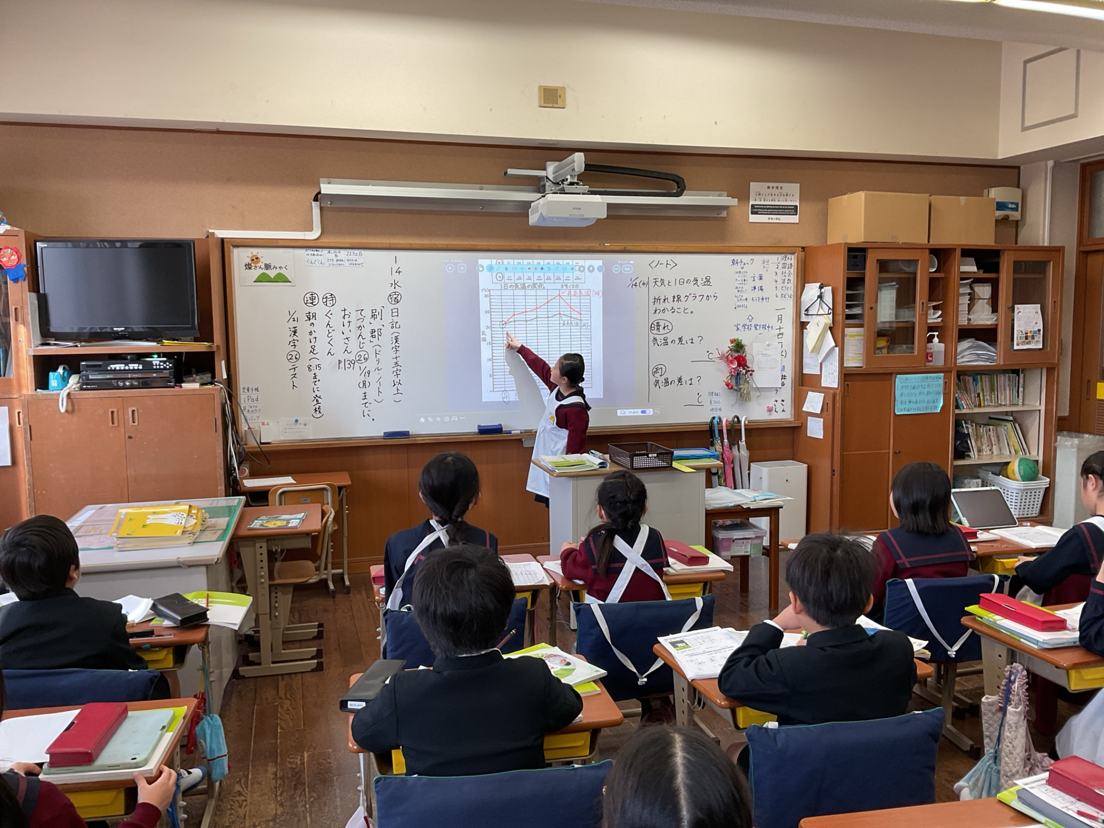 3年生の理科の授業で『天気と気温の関係を調べる学習』を行いました。集めた結果をもとに折れ線グラフを作り、晴れの日と雨の日を比べます。「晴れの日は変化が大きいな」「雨の日はなぜちがいがあるのかな?」と、グラフから気づきを見つける子どもたちでした。数字が線になることで、天気と気温のつながりが一目で分かりました。考える力と読み取る力が、理科の学習を通して身につきました。