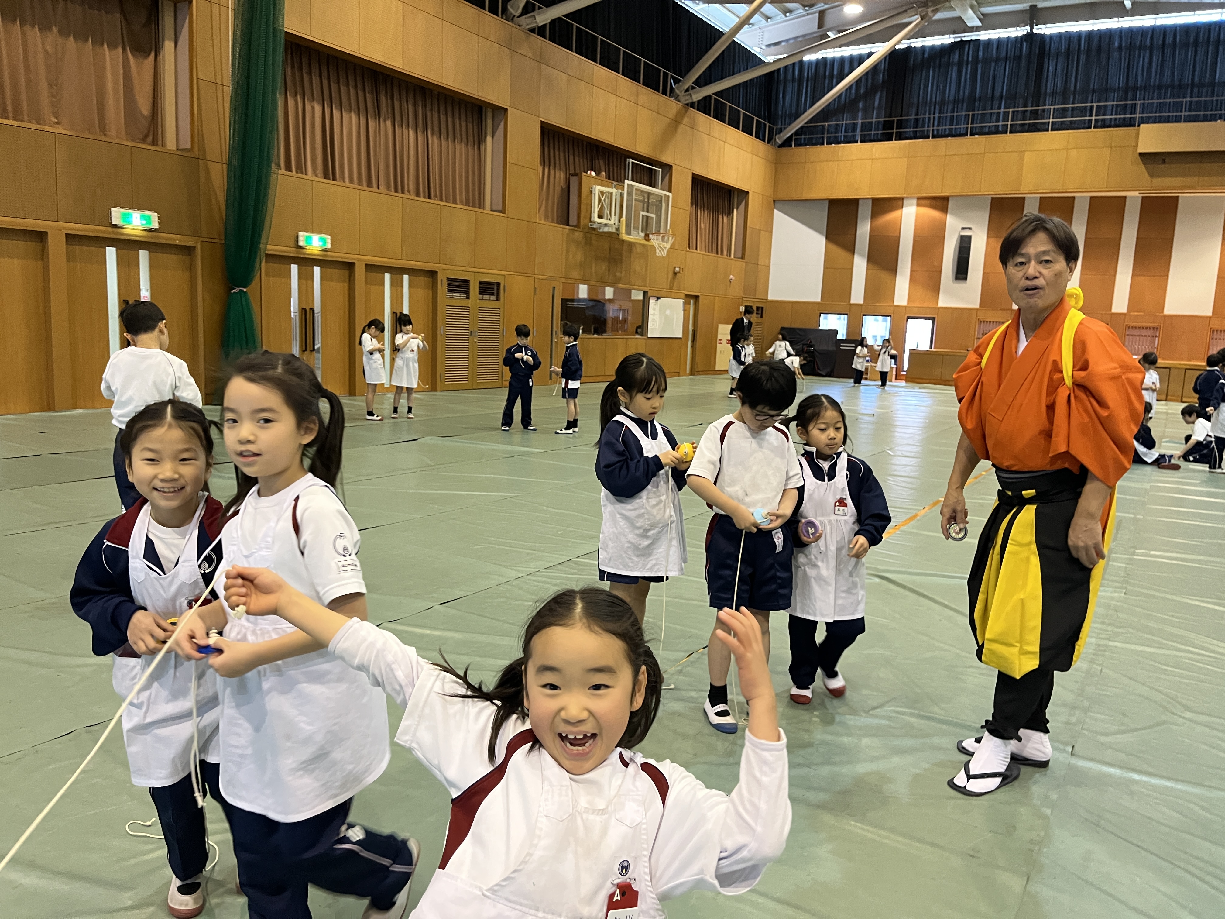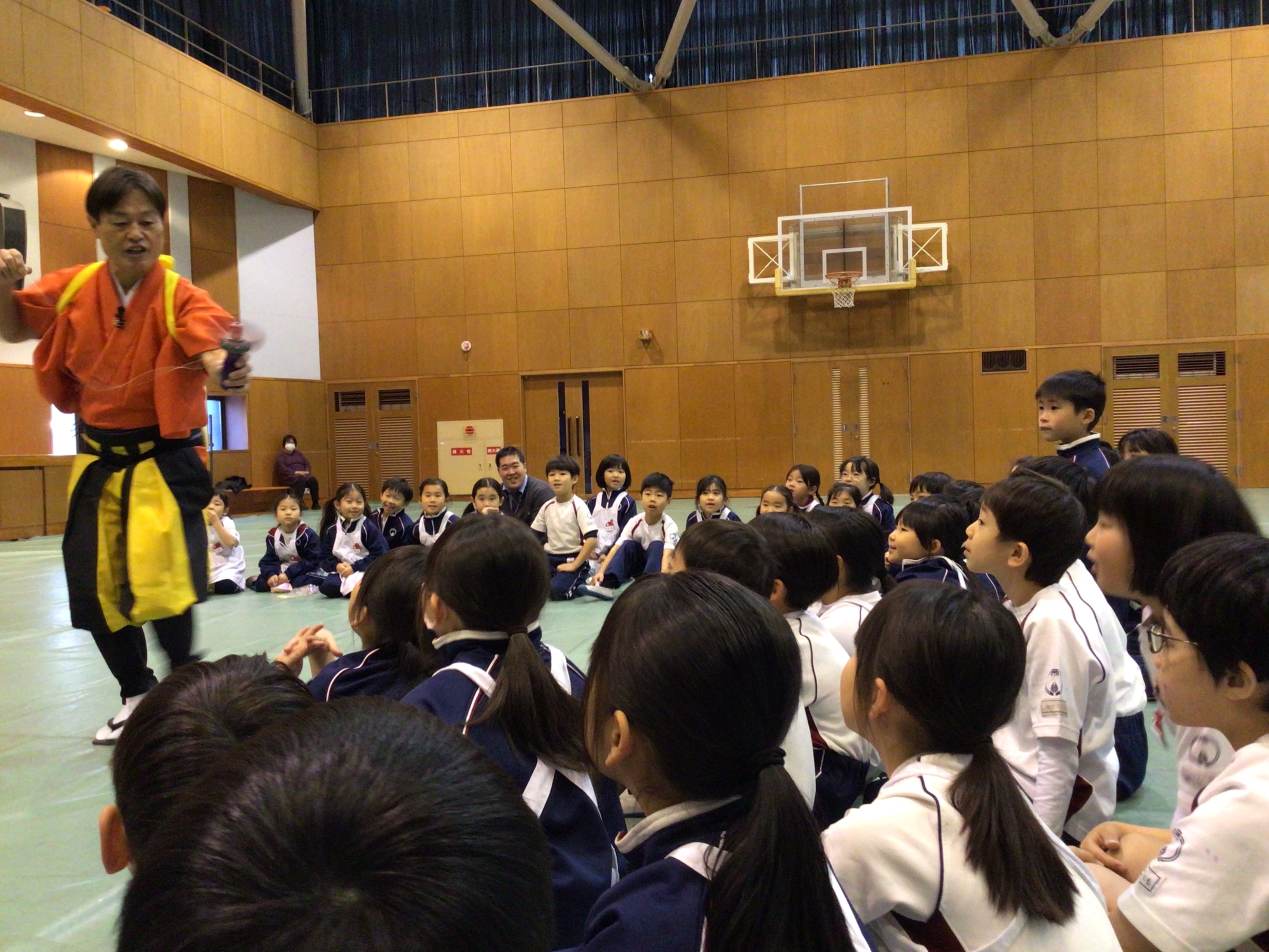 本日、こま回し名人が帝塚山学院小学校に来てくれました。