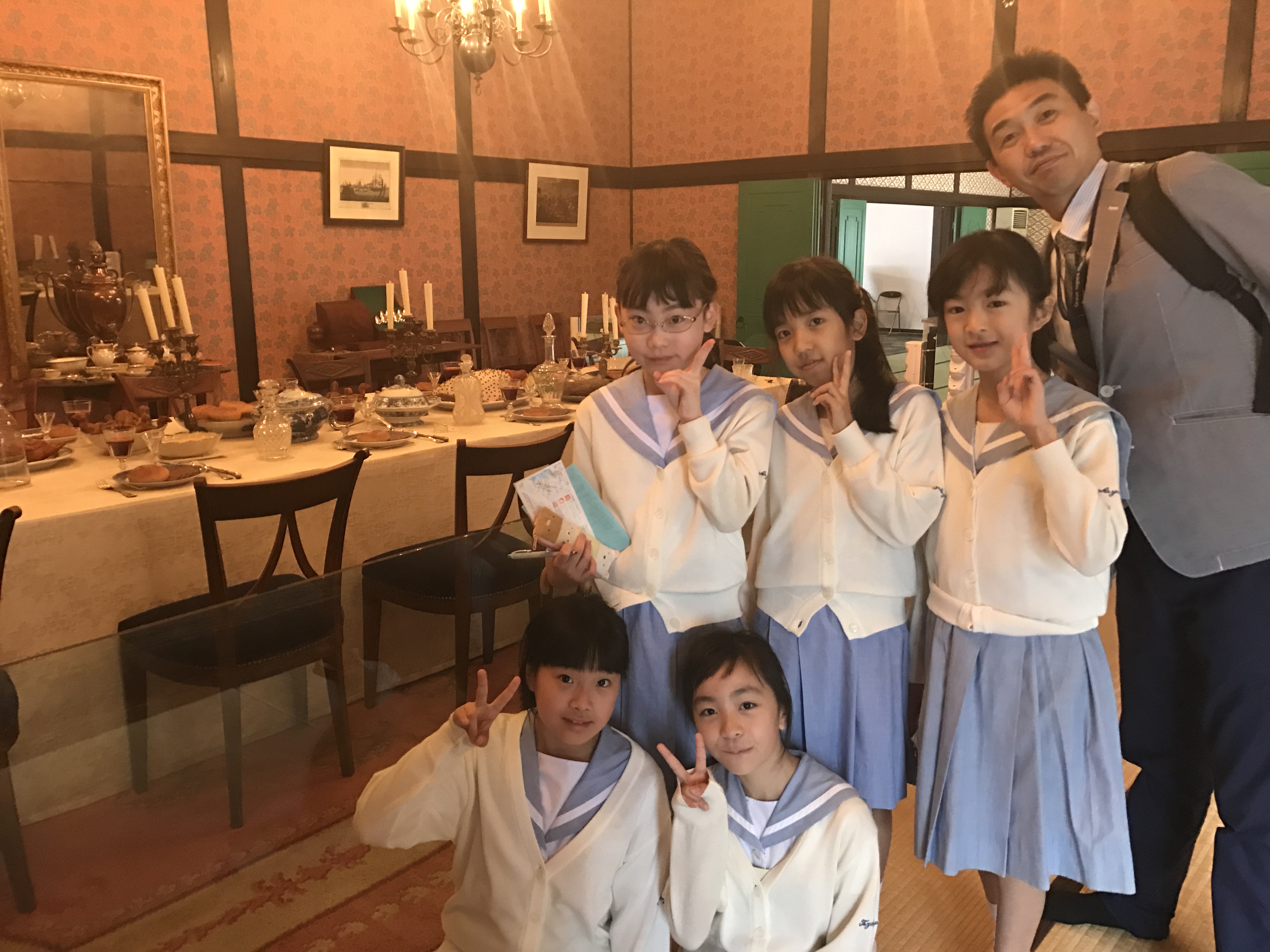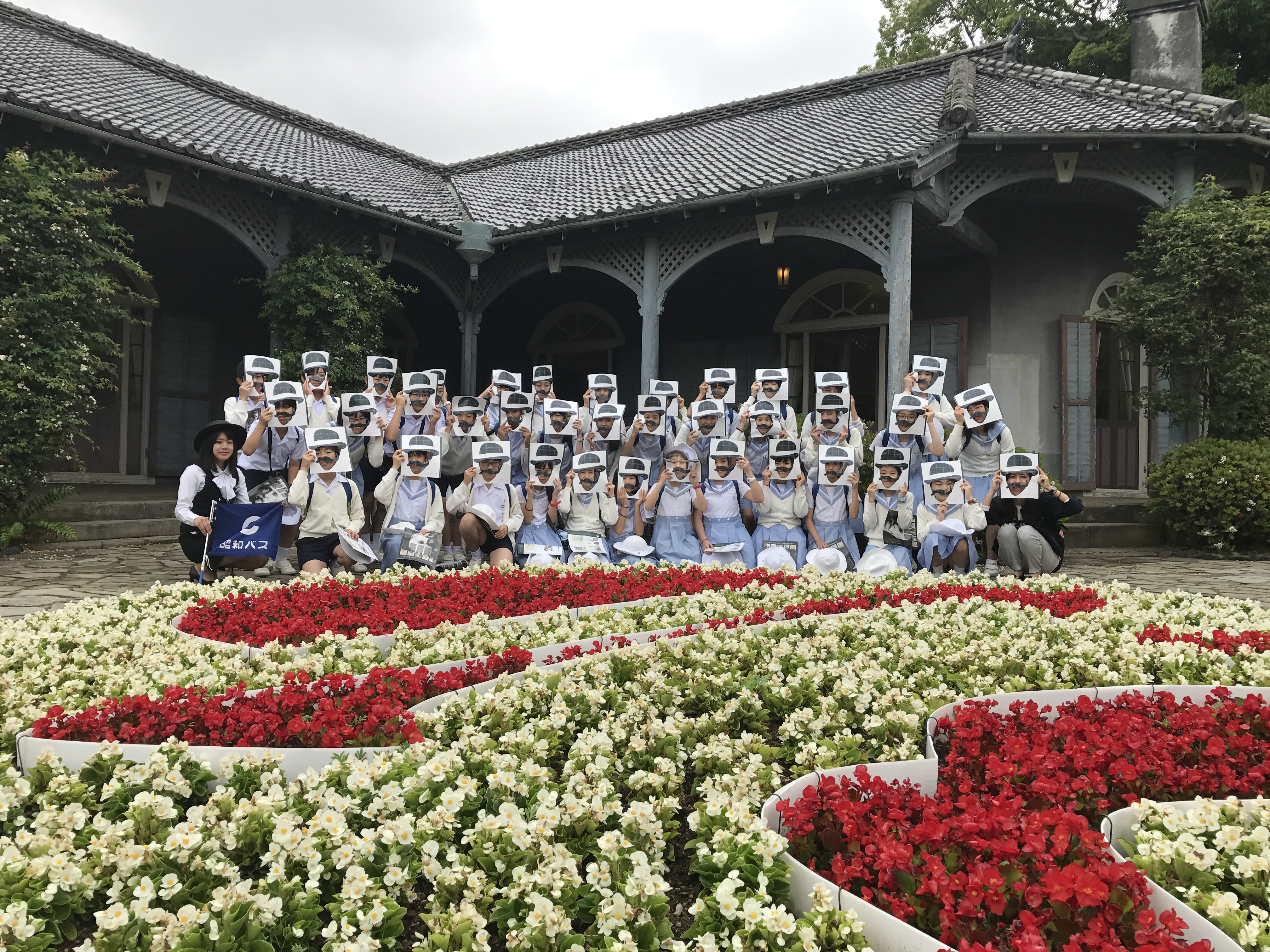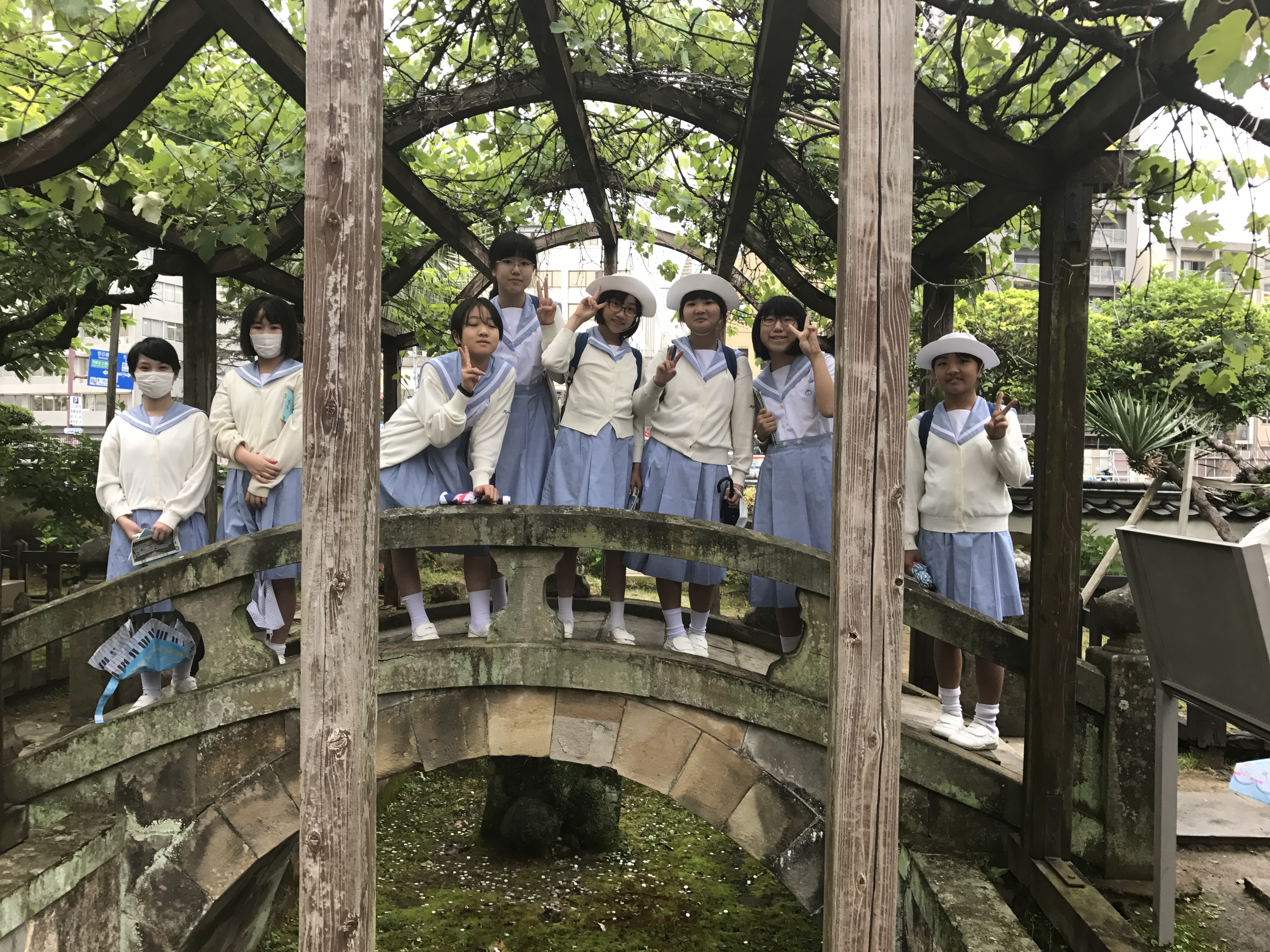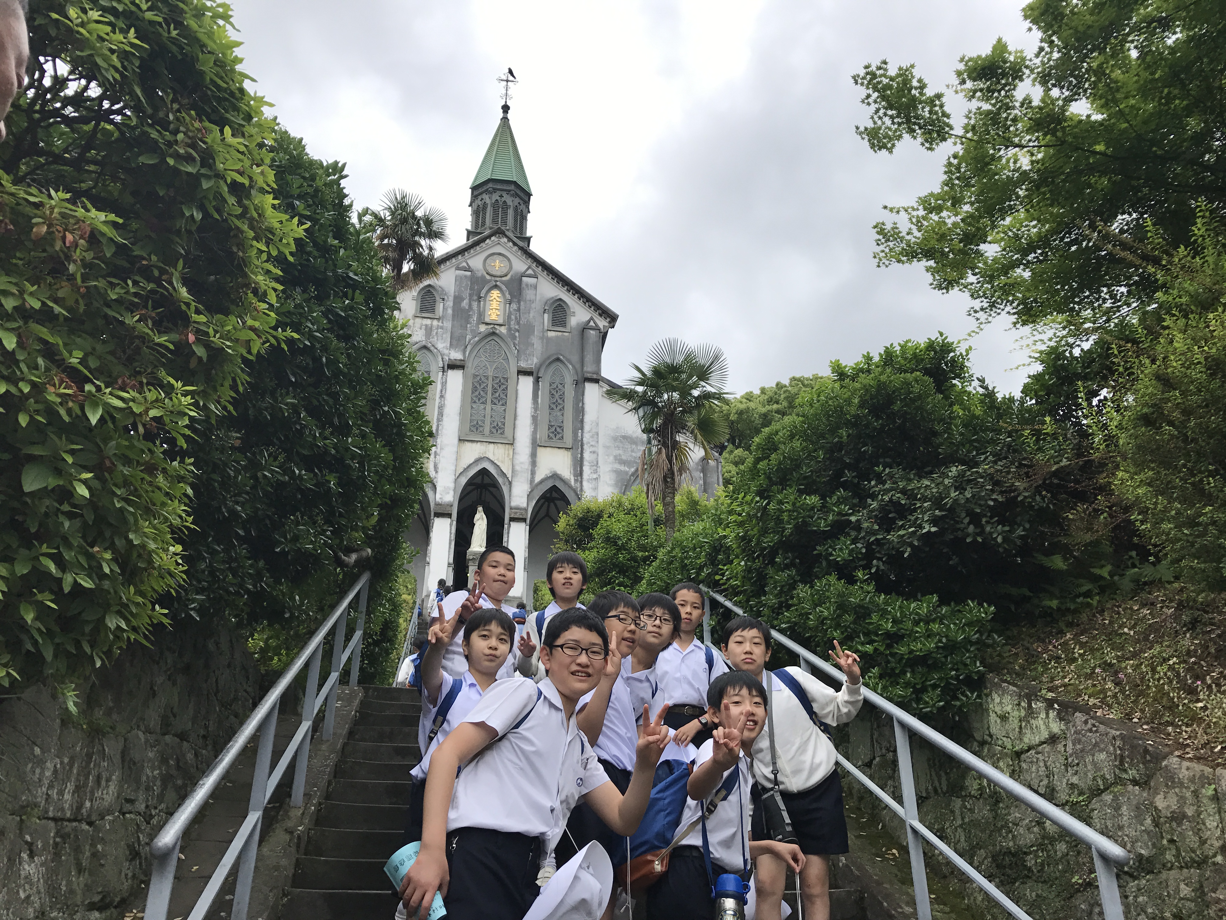 修学旅行3日目です。まず最初に、出島見学に行きました。昔の日本と外国が融合した建物やお庭はとても素敵でした。大浦天主堂は外からの光でステンドガラスが綺麗に光っていました。グラバー園では、グラバー邸を見学した後、みんなでハートの石を見つけました。