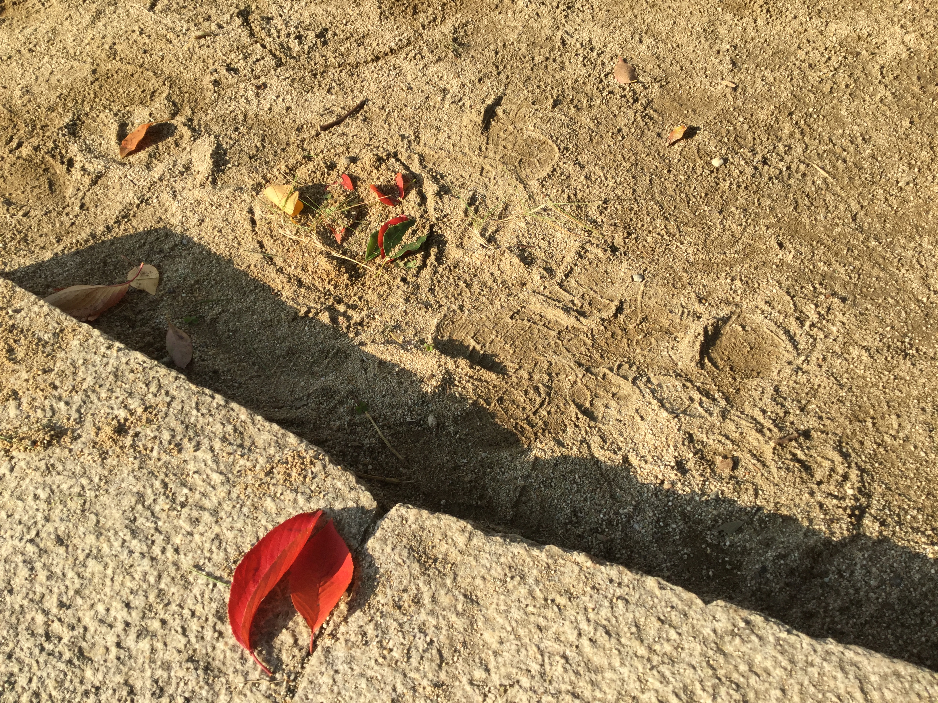 春、たくさん咲いていた桜も紅葉しています。 校庭を散歩していたところ、遊具の横に子供達が作った葉っぱの顔がありました。 休み時間に子供達が作ったものだと思います。 「物」と子供達の「心」が響きあった時に生まれる自然な「表現」を大切にしていきたいと考えています。