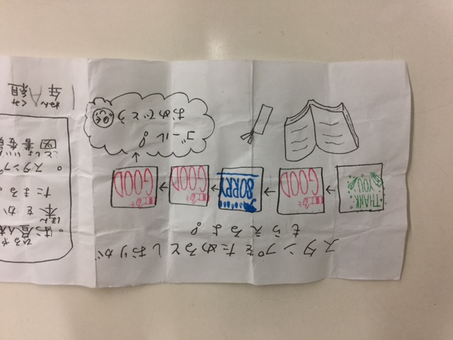 お昼休みに、本を借りると1つスタンプをもらうことができ、5つスタンプを集めると手作りしおりがもらえるという内容でした。