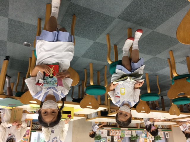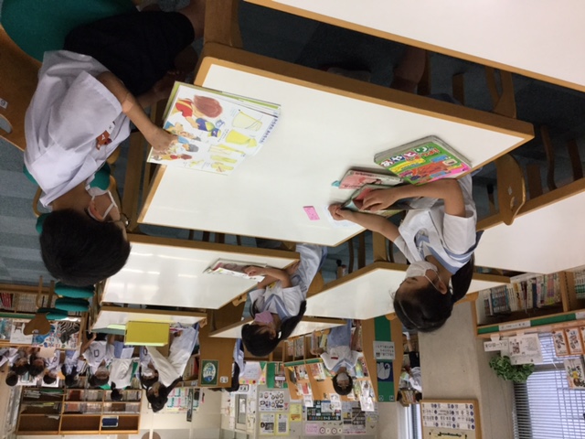 興味を持ち図書室へ行くと、1年生を中心に多くの児童たちが、ワクワクしながら、列をつくっていました。また、雨の日の過ごし方を考え、じっくり本読みをしている児童たちの姿。