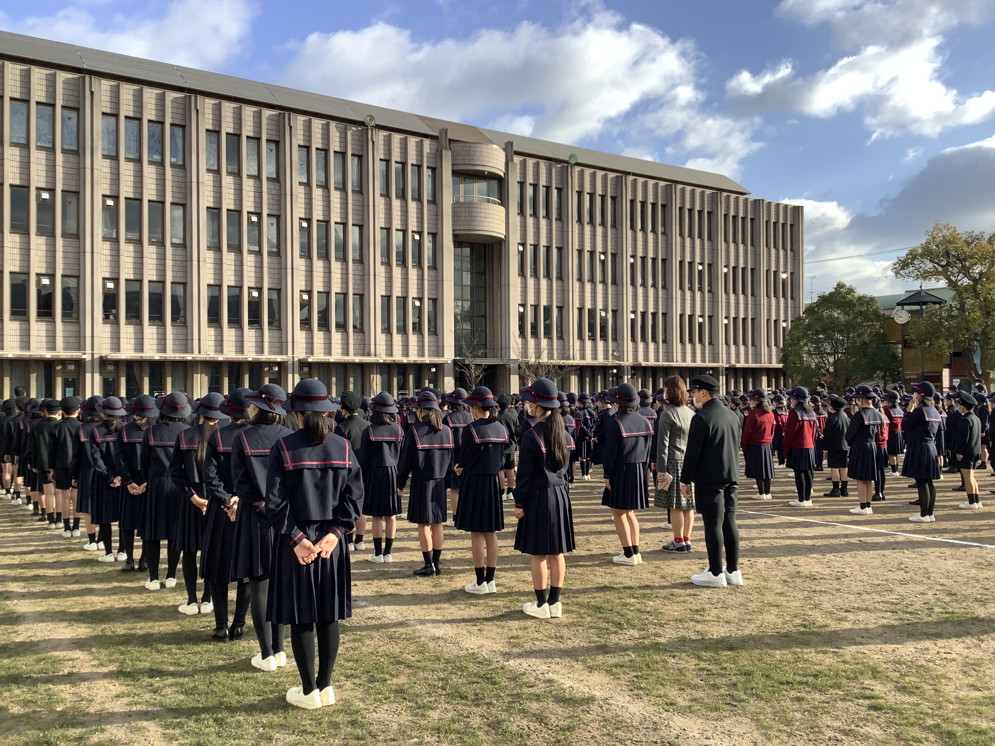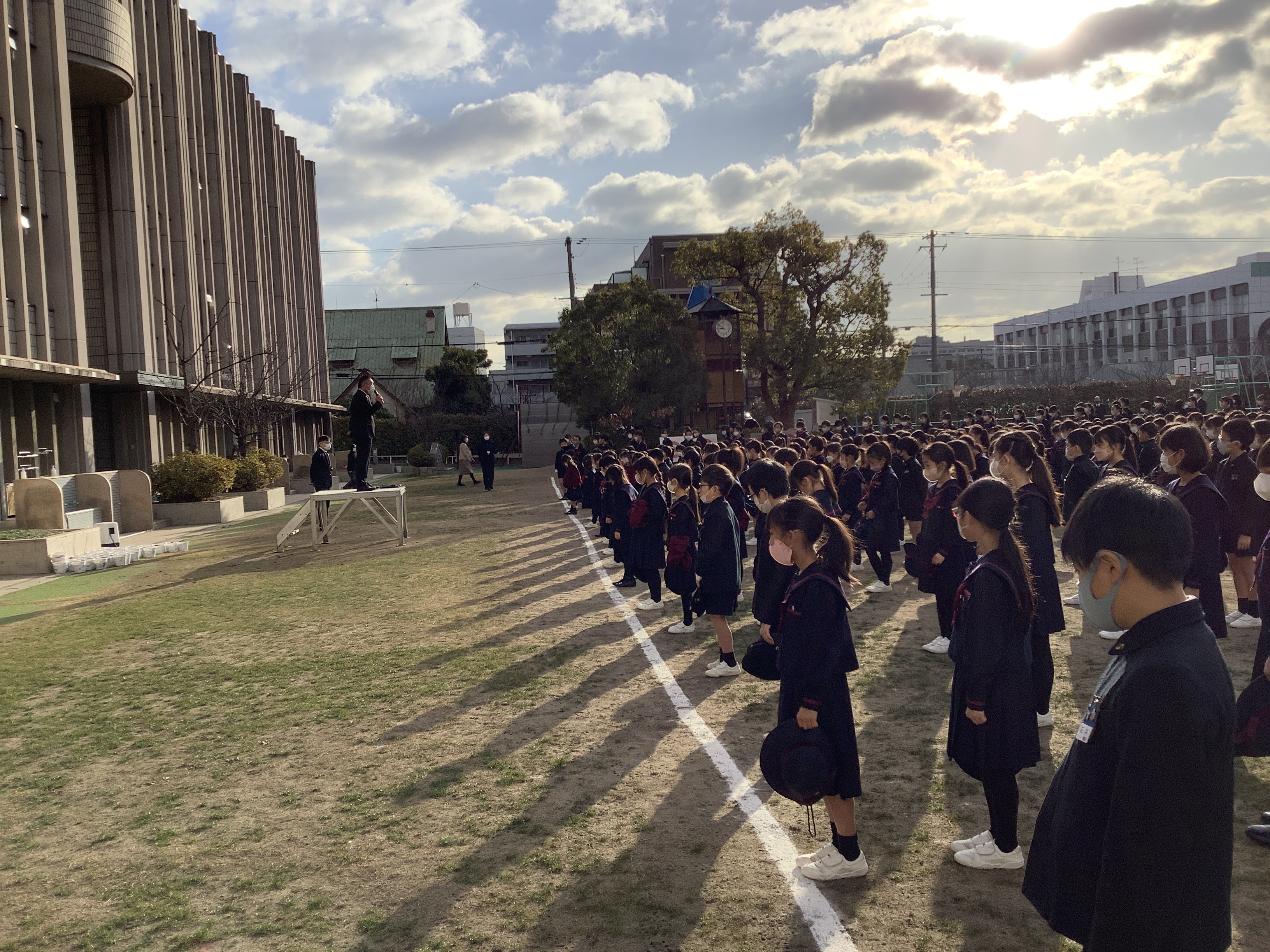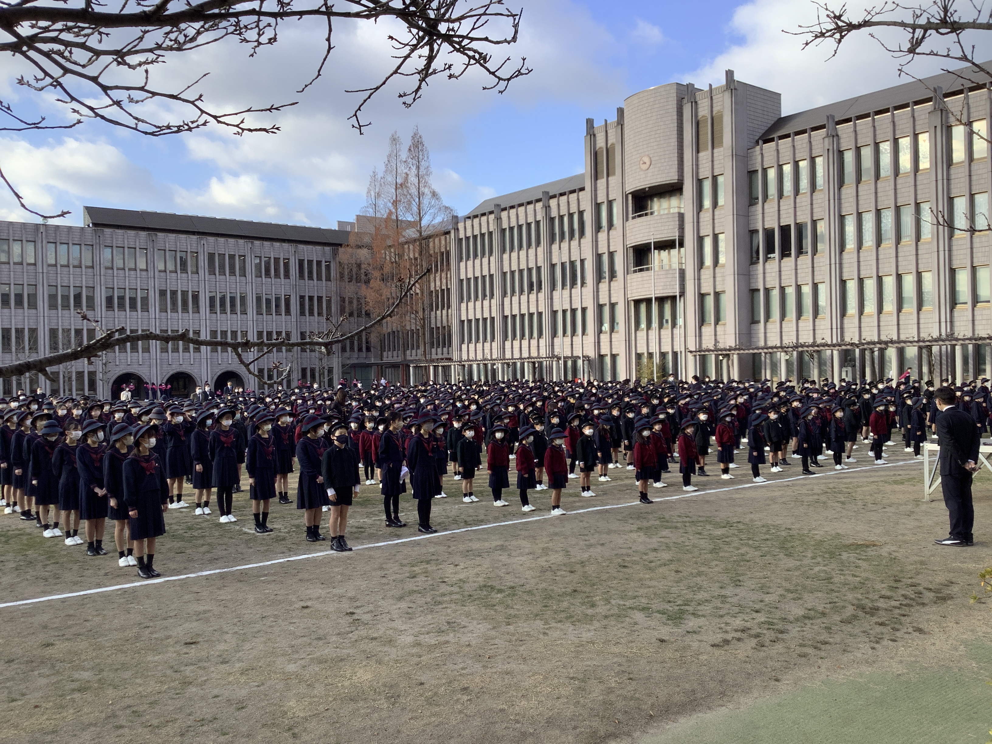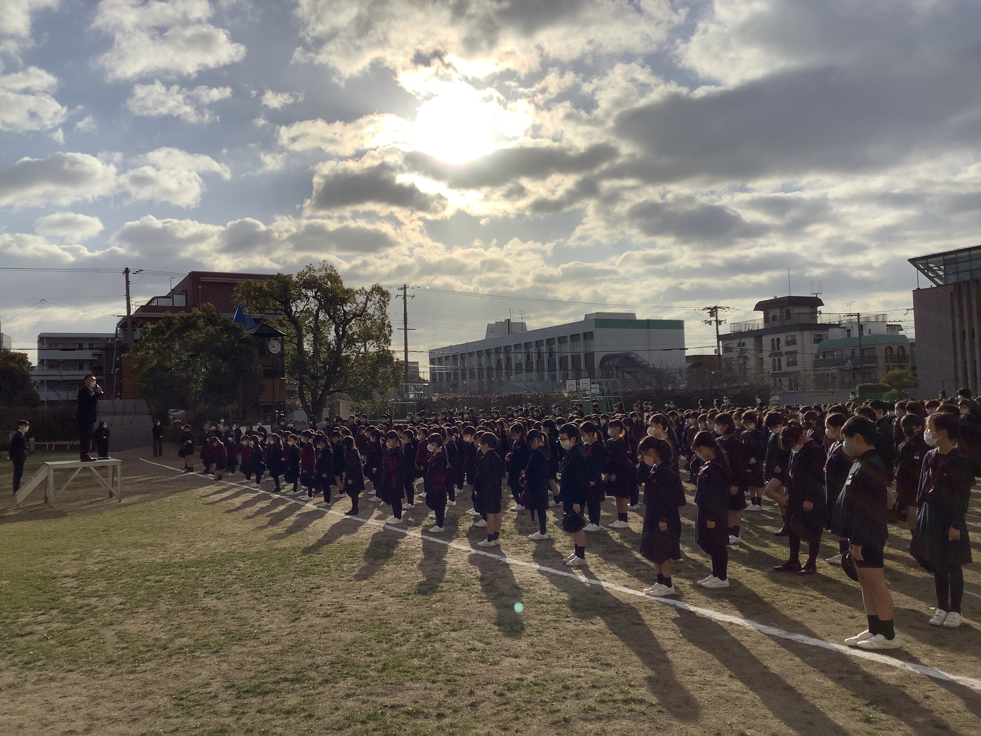 運動場で行われた始業式では、寒さもあり身が引き締まるものとなりました。