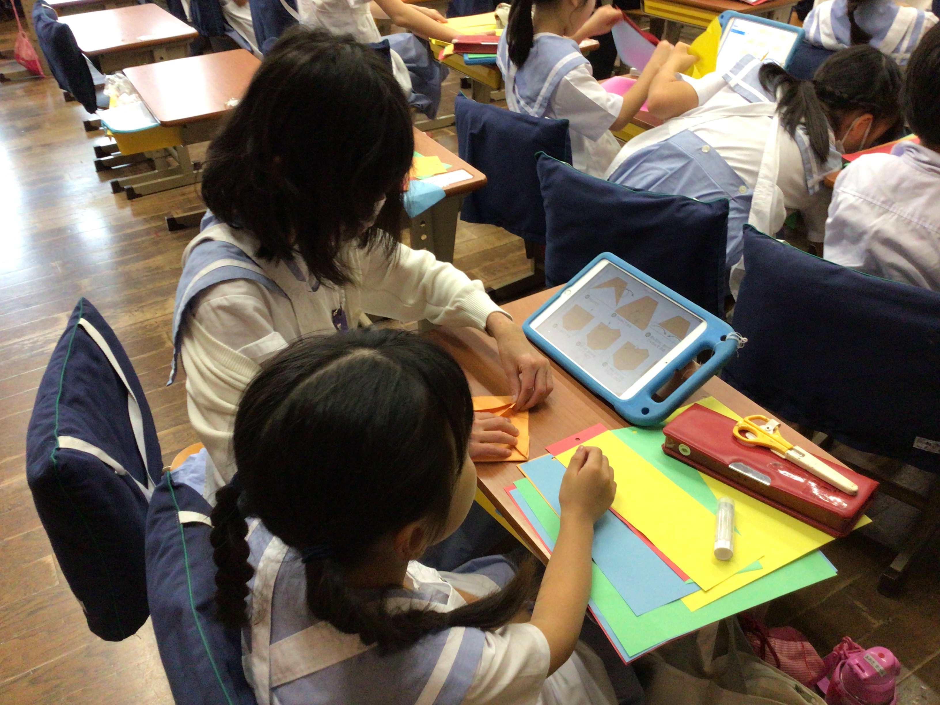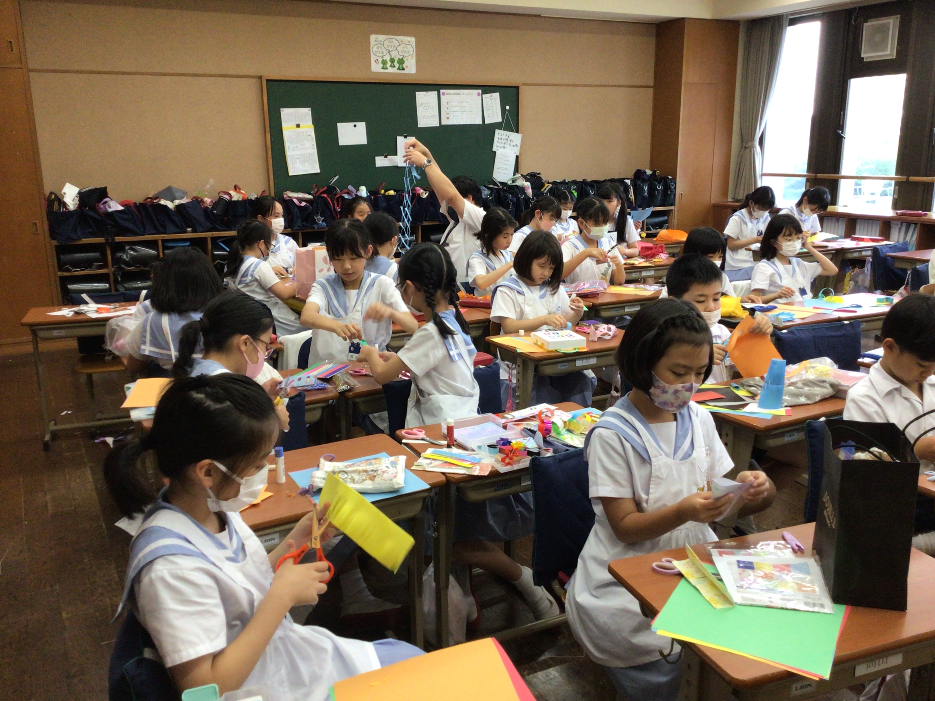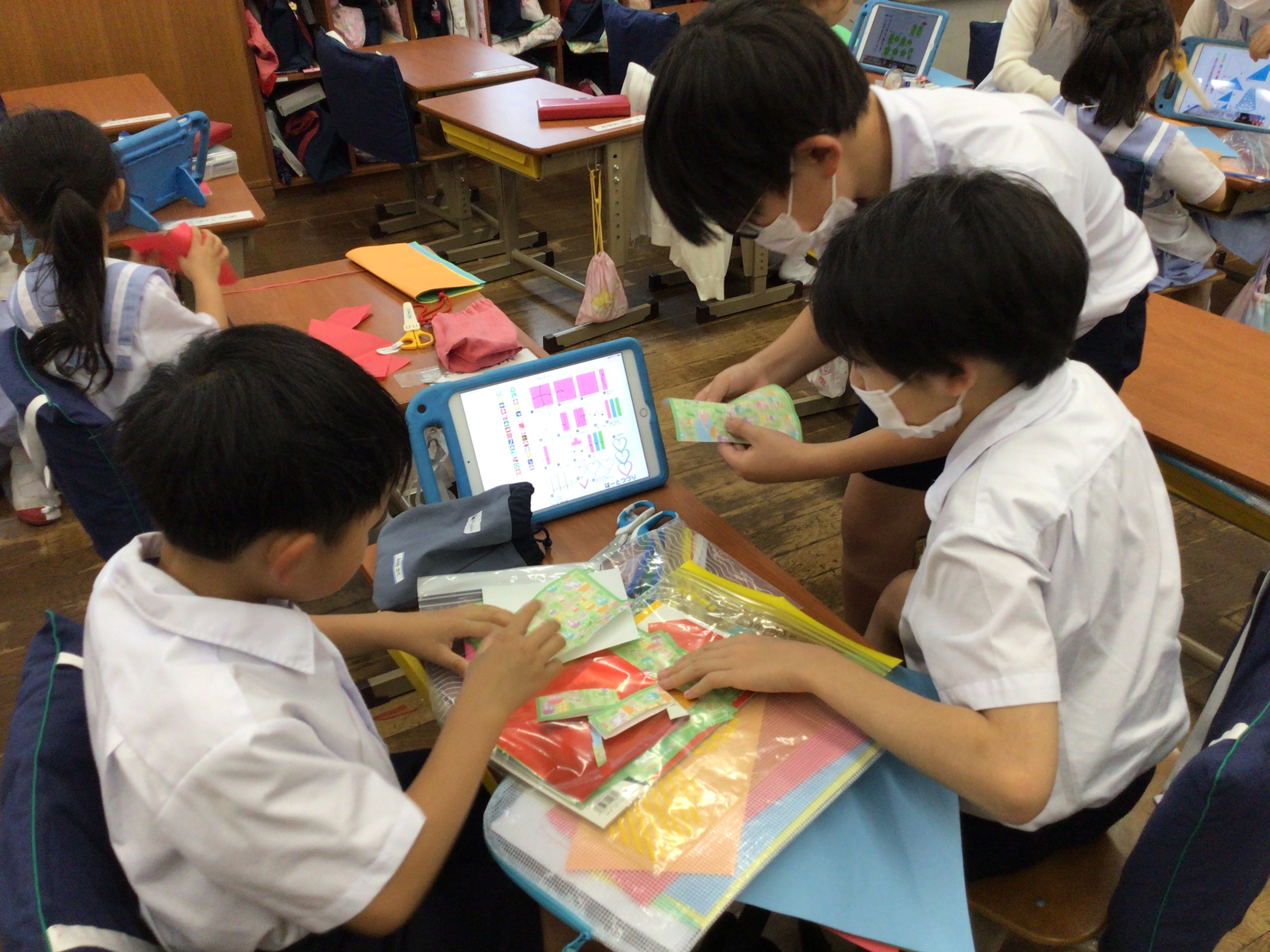 本日6時間目の児童会の時間に、学年間交流をする学級が多かったので覗きに行くと、兄弟学級で七夕飾りを作っていました。お兄さんお姉さんに折り紙の折り方を教わったり、協力しながら飾りを作ったり、それぞれが交流を深めながら時間を過ごしていました。