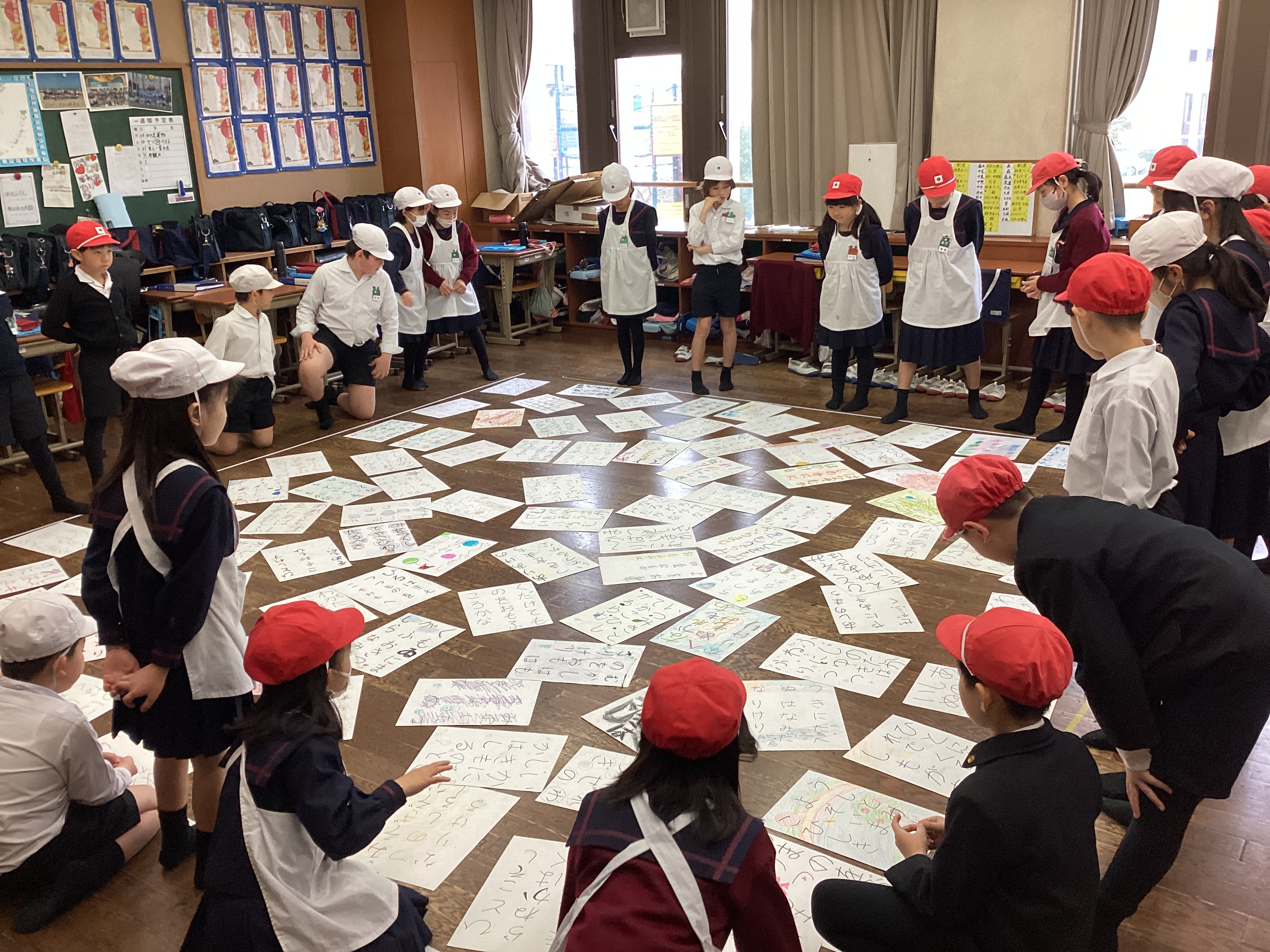 お手つきをしたり、同時に札をタッチしたり、それぞれのクラスで白熱した対戦があったようですが、全力で取り組む児童の姿も見られ、熱い百人一首大会になったようです。