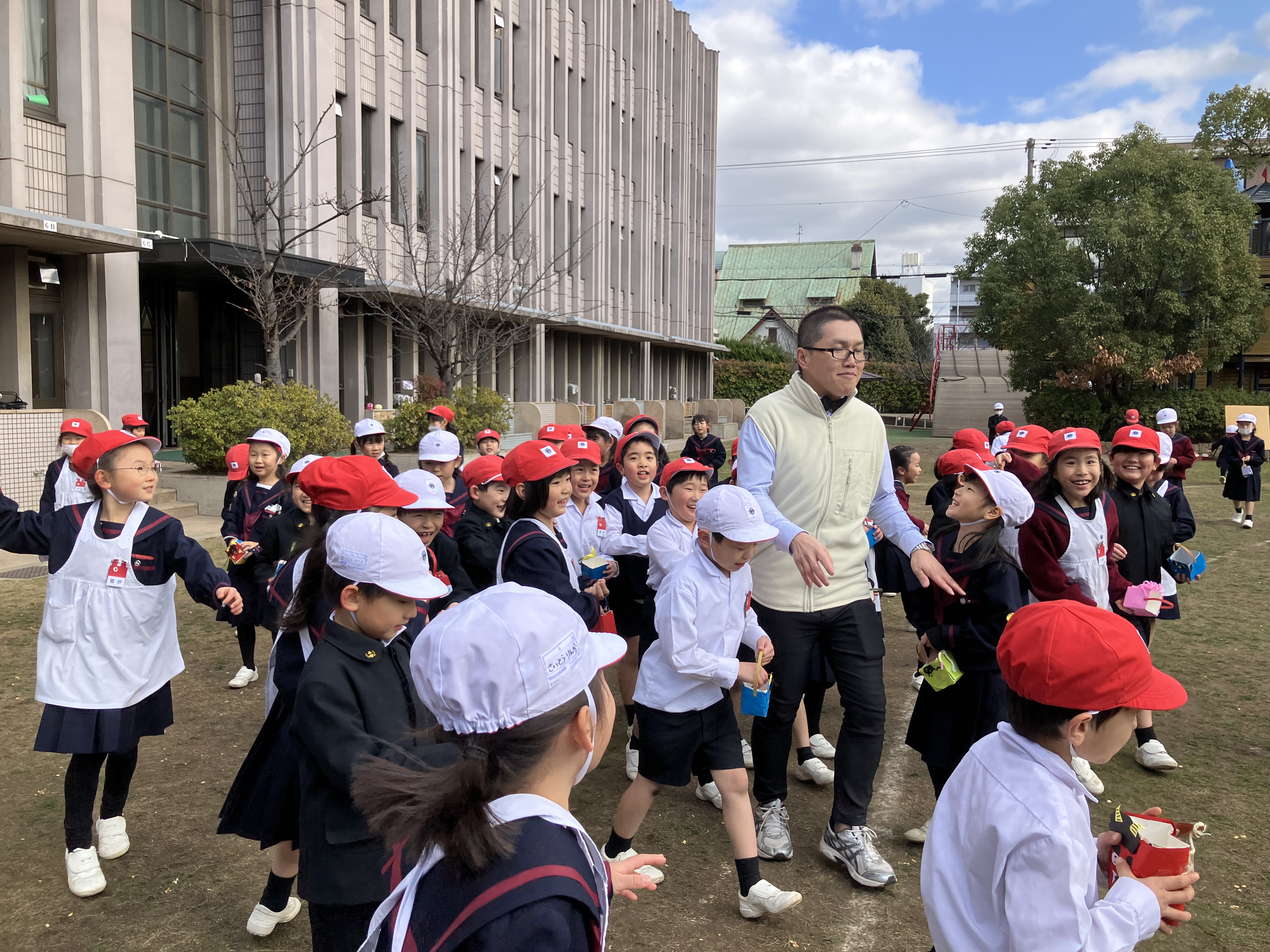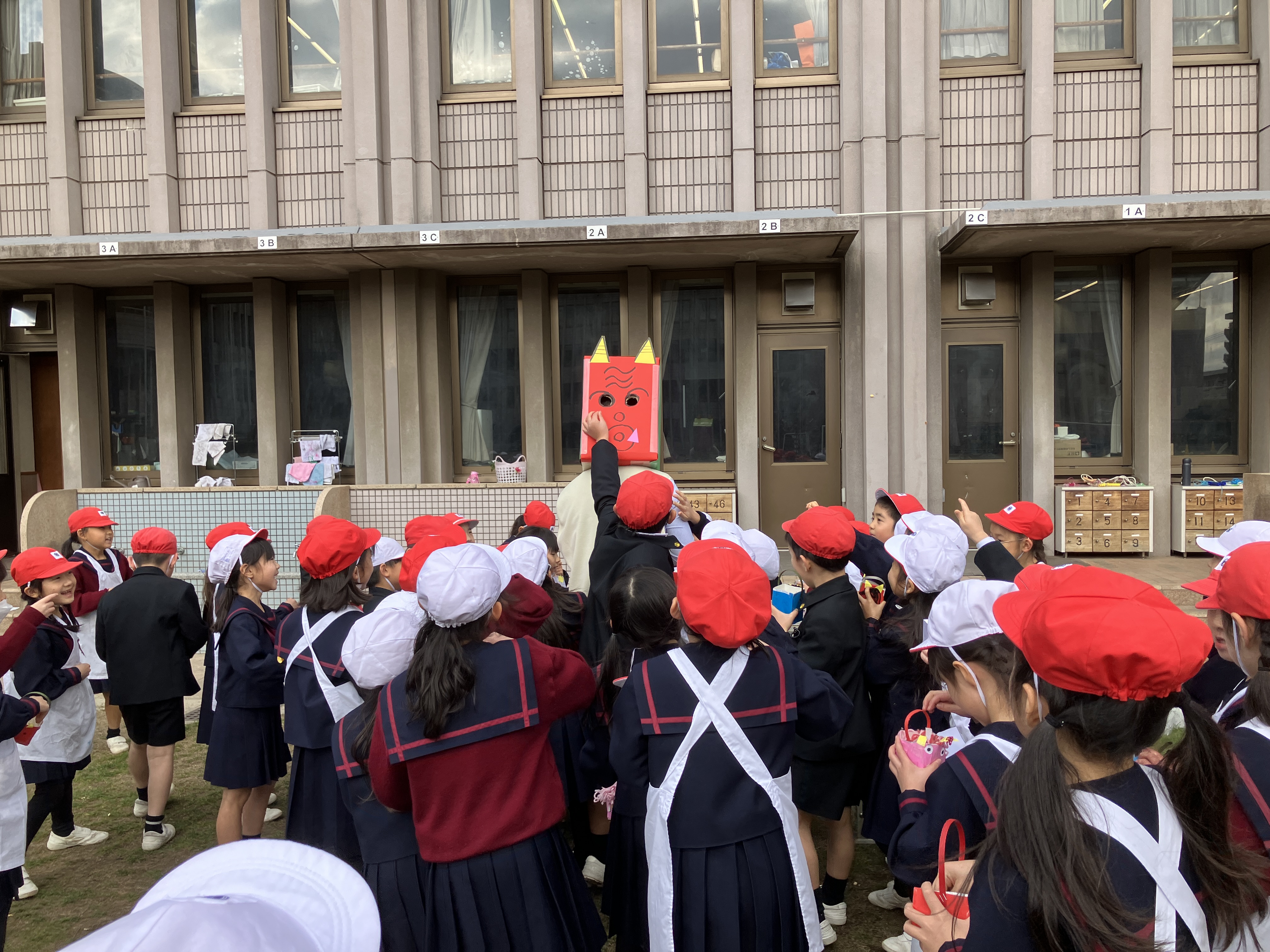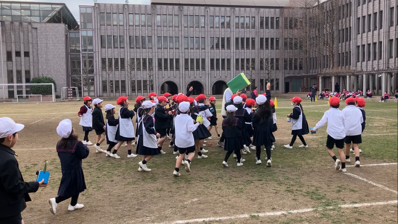豆まきをする前には、「自分の中にある鬼を退治する」という話をし、それぞれ自分のなおしたいところをしっかり思い浮かべてからいよいよ豆まきのスタートです。今年の鬼さんは1人でしたので、圧倒的に1年生の勝利!元気いっぱい駆け回り、しっかり鬼を退治しました!