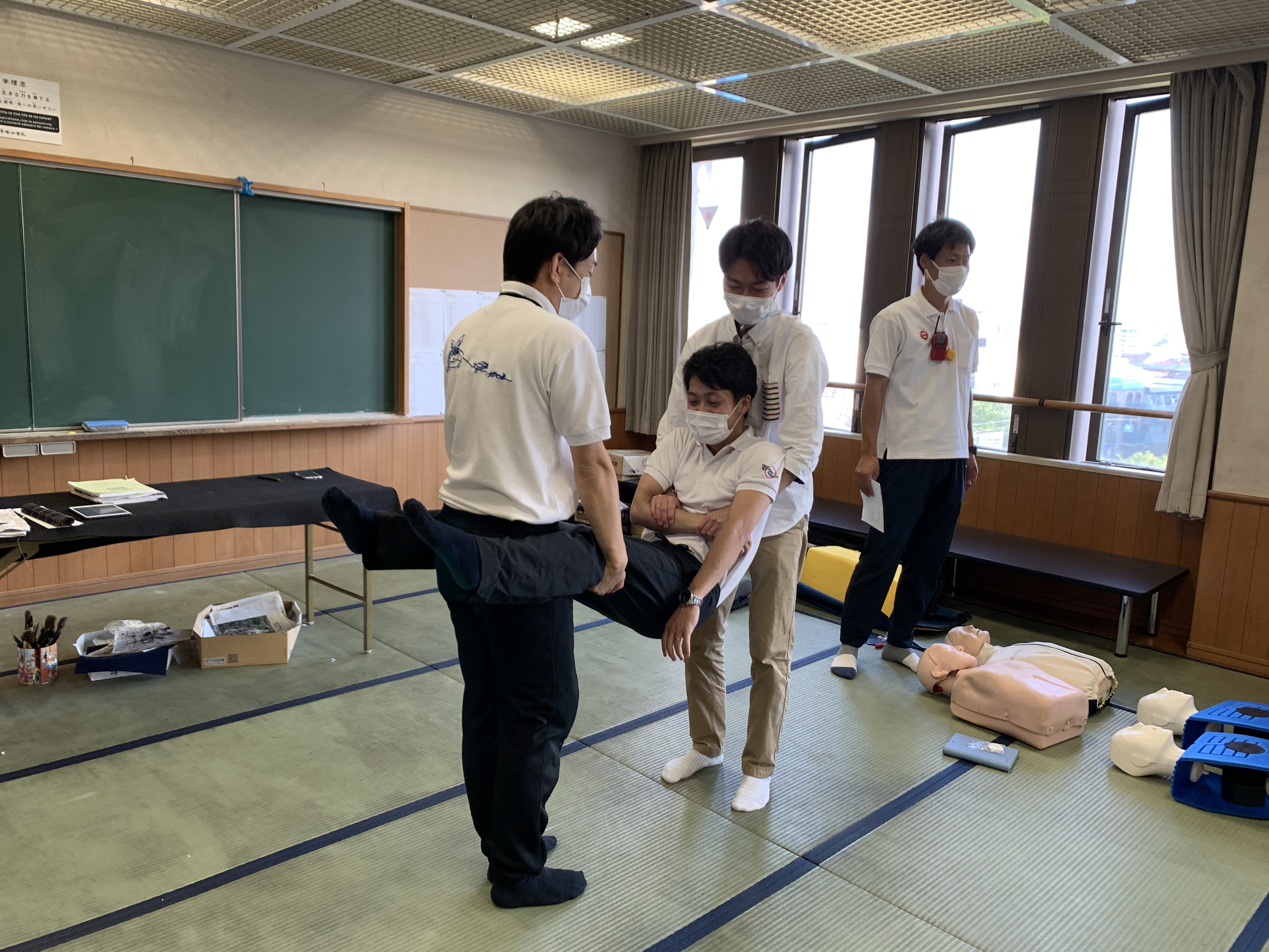 主に一次救命を取り扱い、万が一の事態に備え、各自の動きを迅速にするための研修です。基本の救命処置に加え、コロナ禍においてのガイドラインを確認しました。