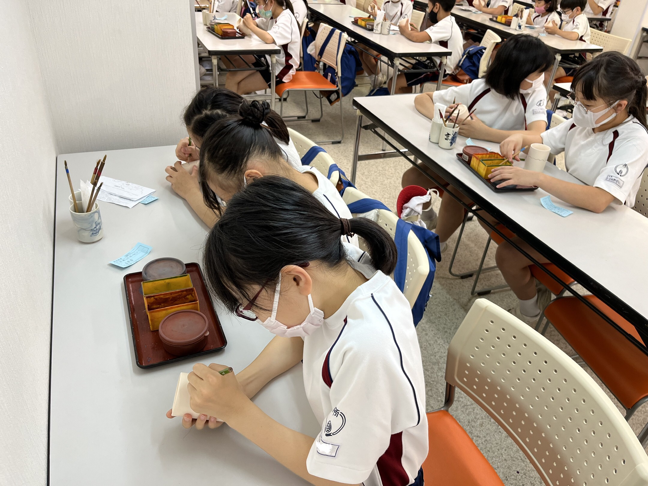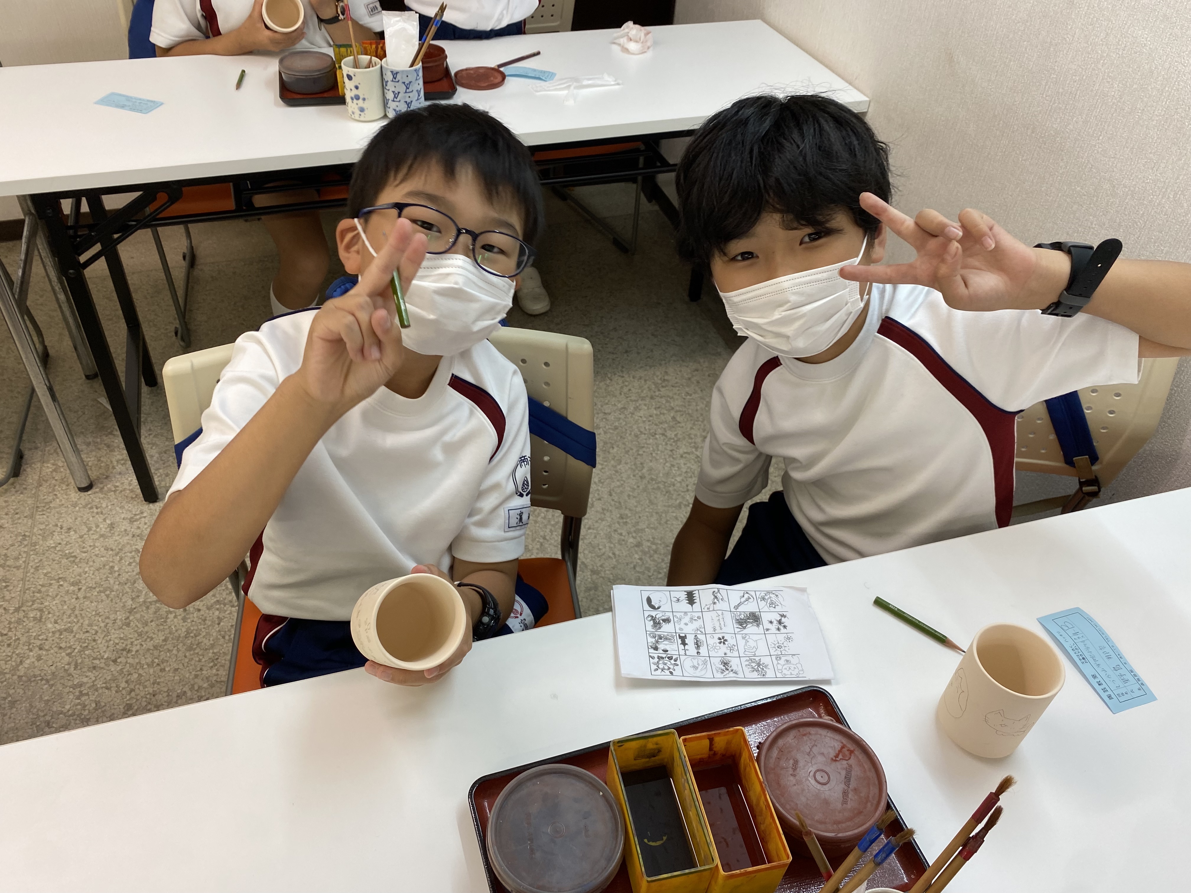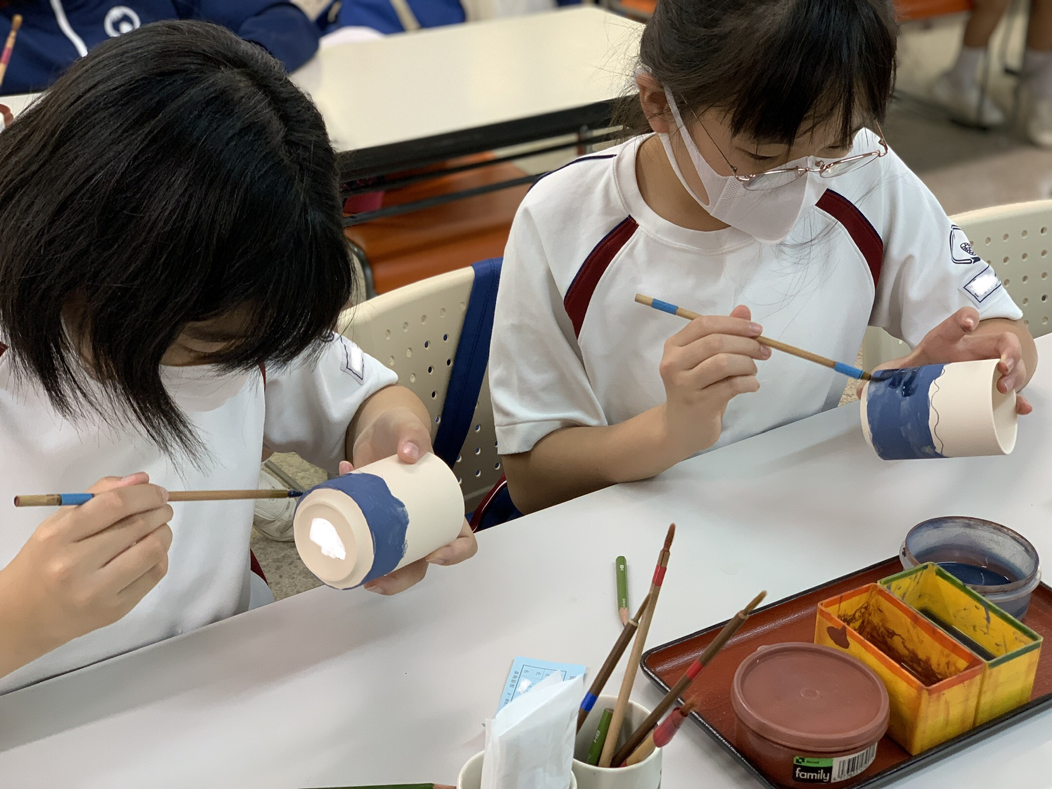 オリジナル湯呑みを完成させるため、2色の絵の具を使って自分のデザインを描きました。完成は1ヶ月後とのことですので、楽しみに待ちたいと思います。