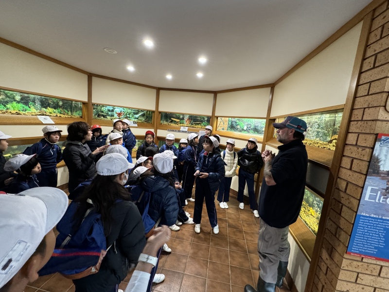 午前中は、マスの養殖場に社会見学に行きました。児童たちは、魚のプロからマスについての説明を聞いたり、エサやりをさせていただきました。