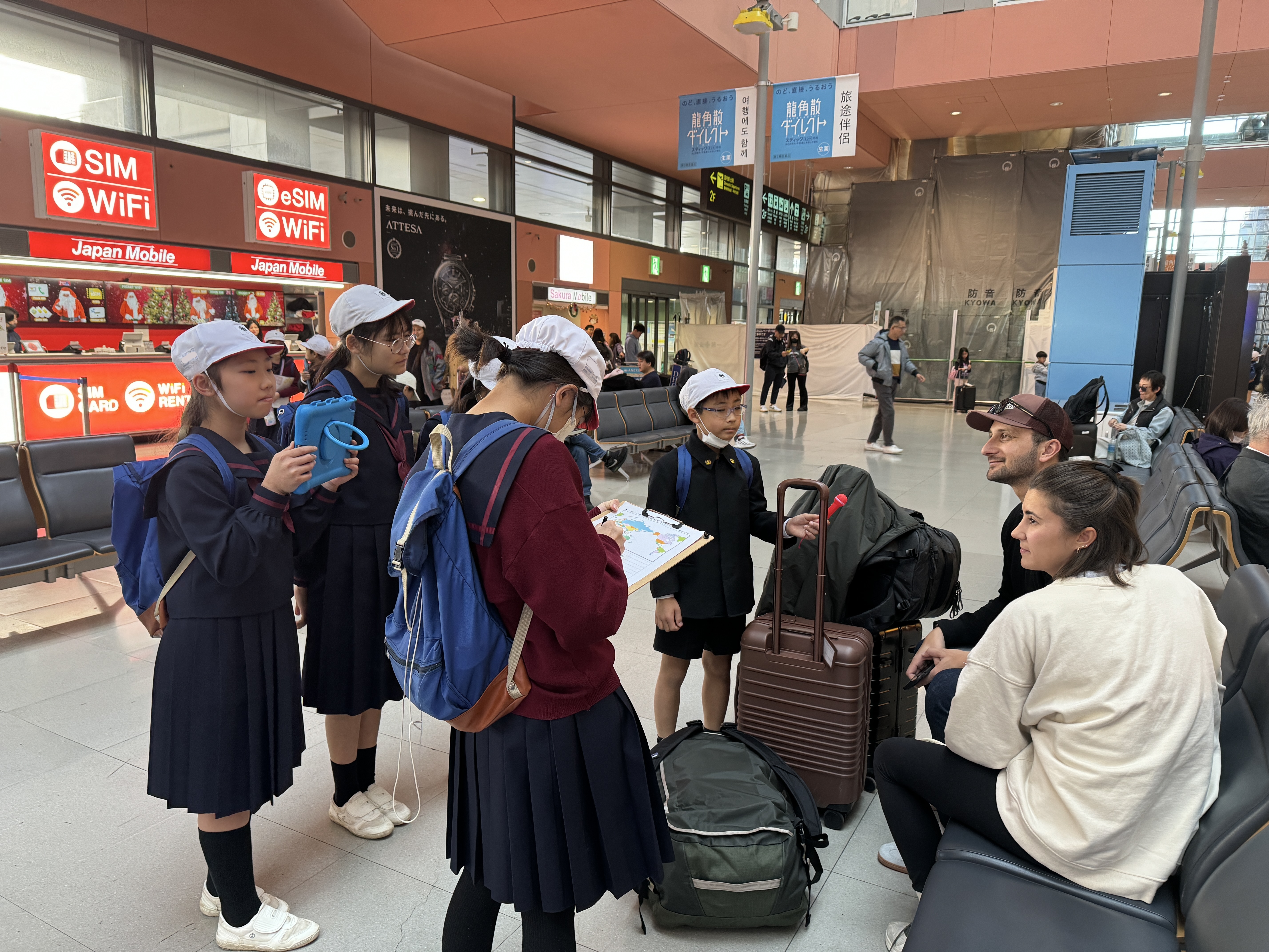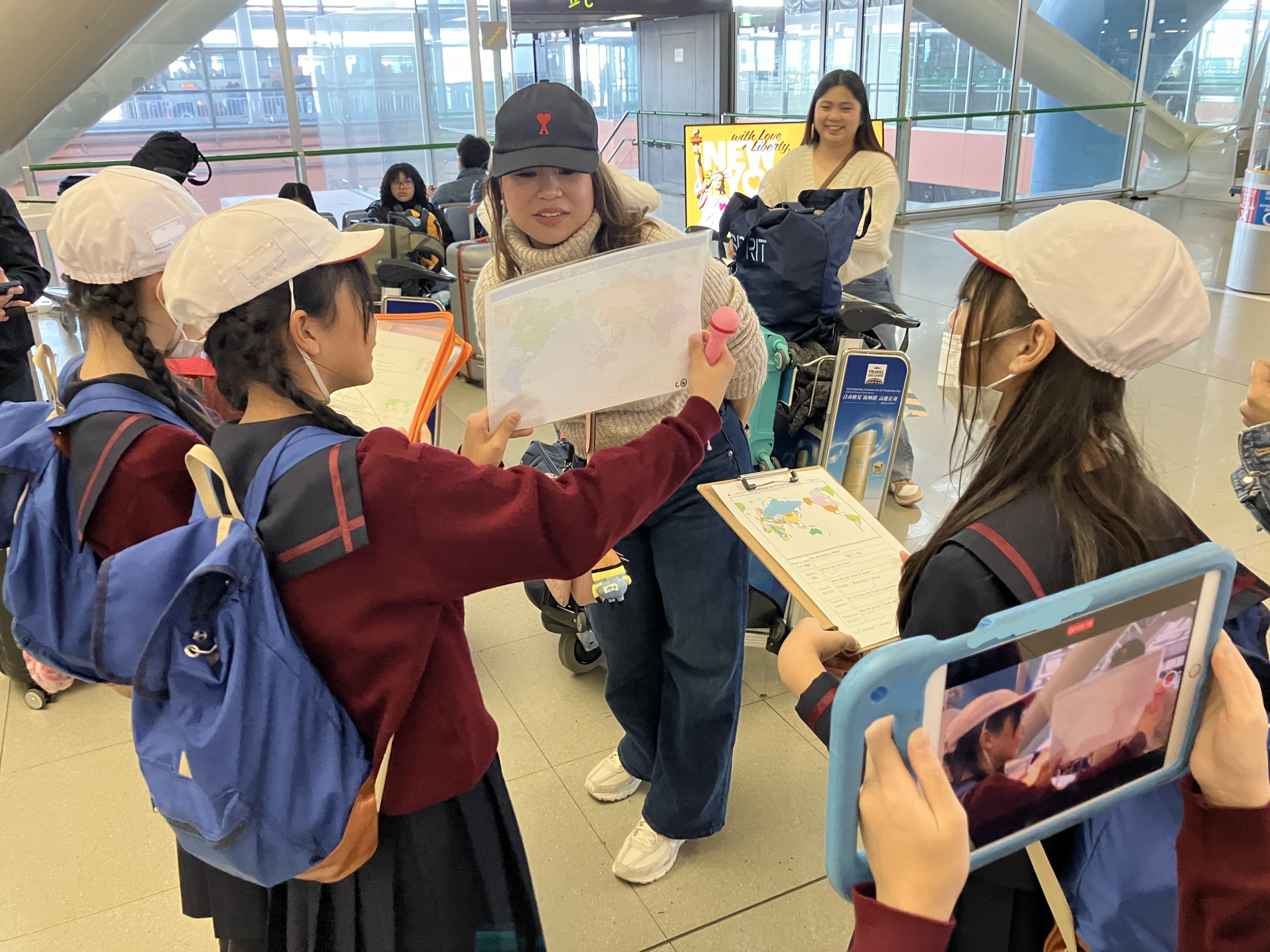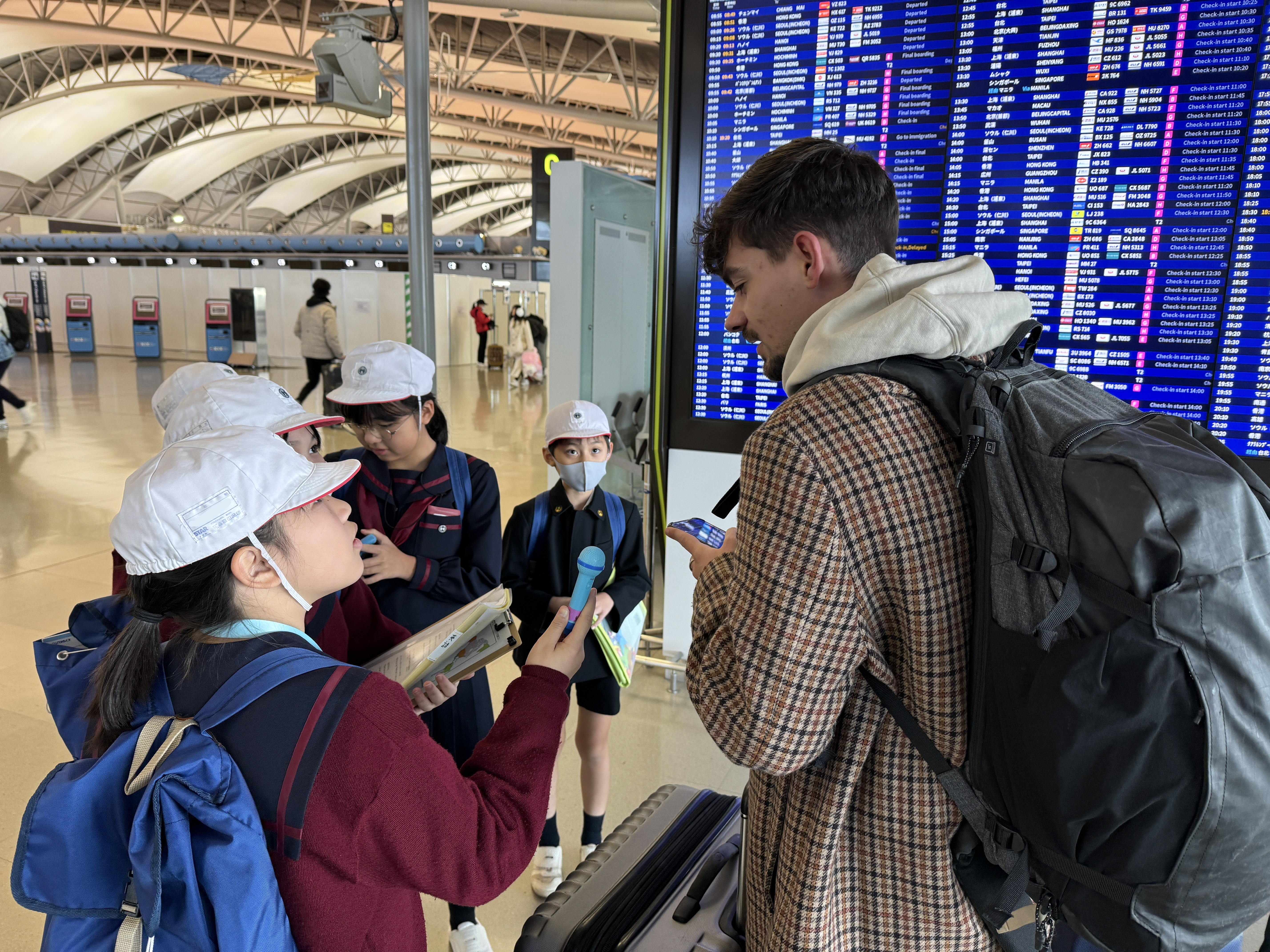 今回の校外学習で、児童たちは関西空港を利用している海外からの旅行客の方に英語でインタビューをしました。