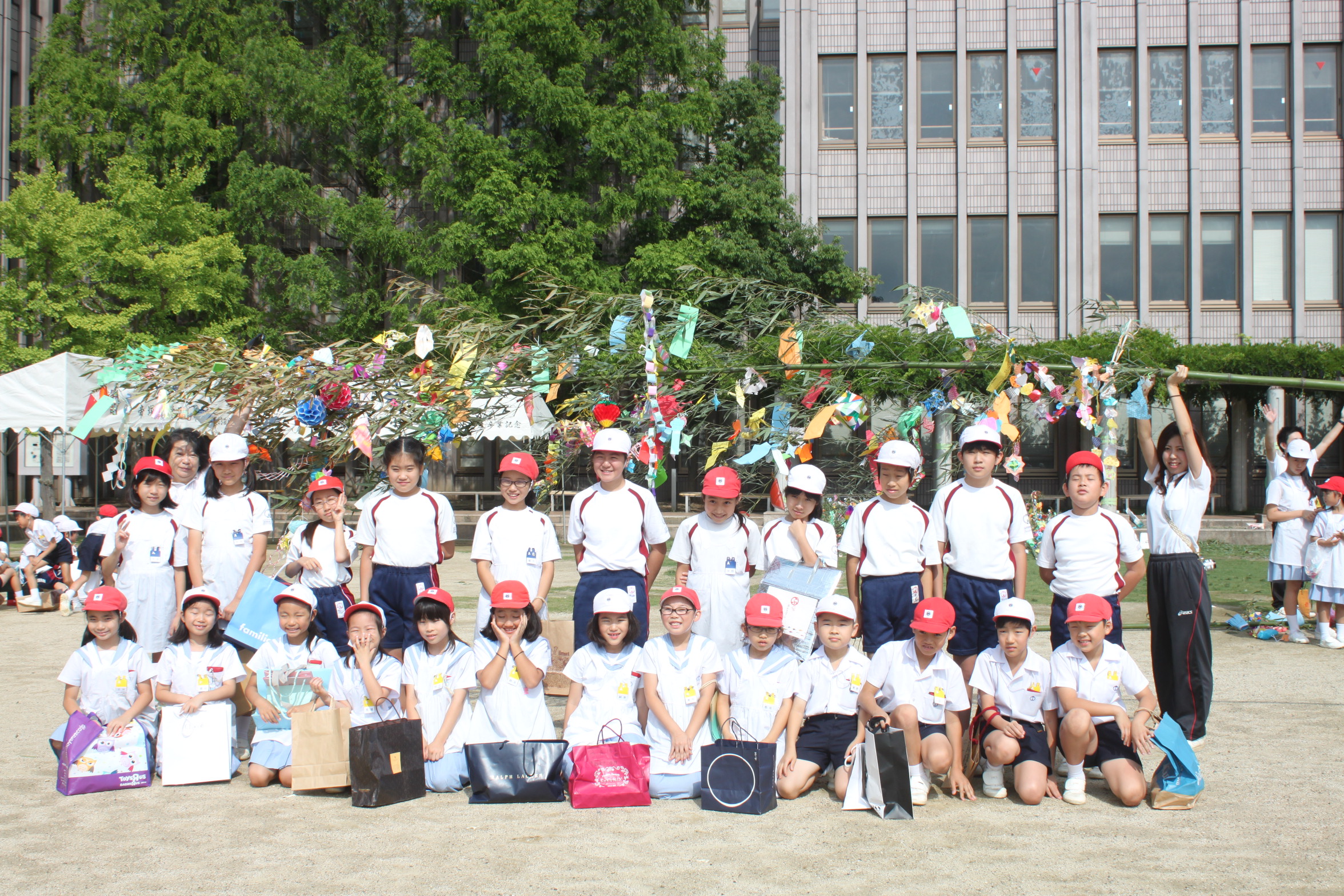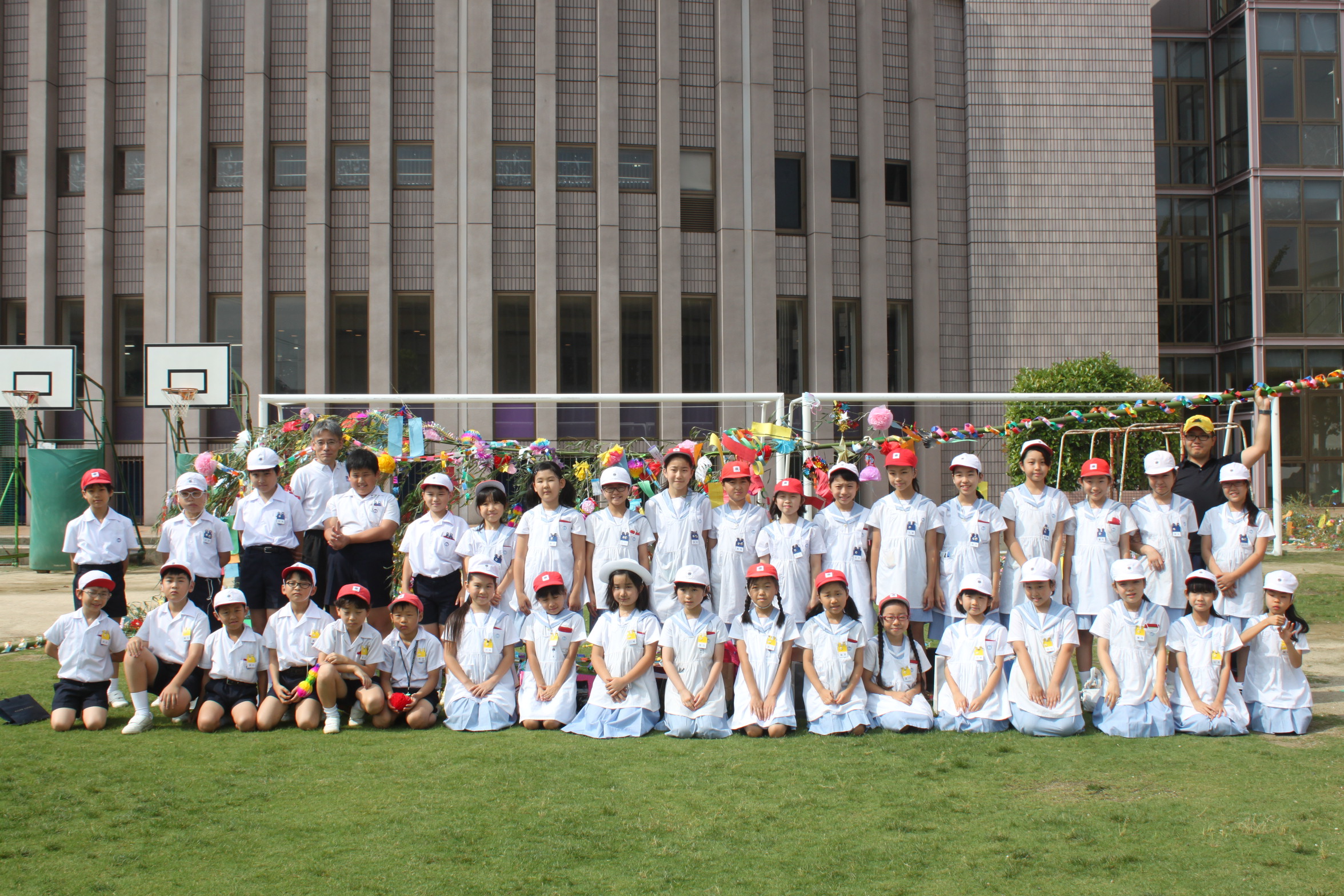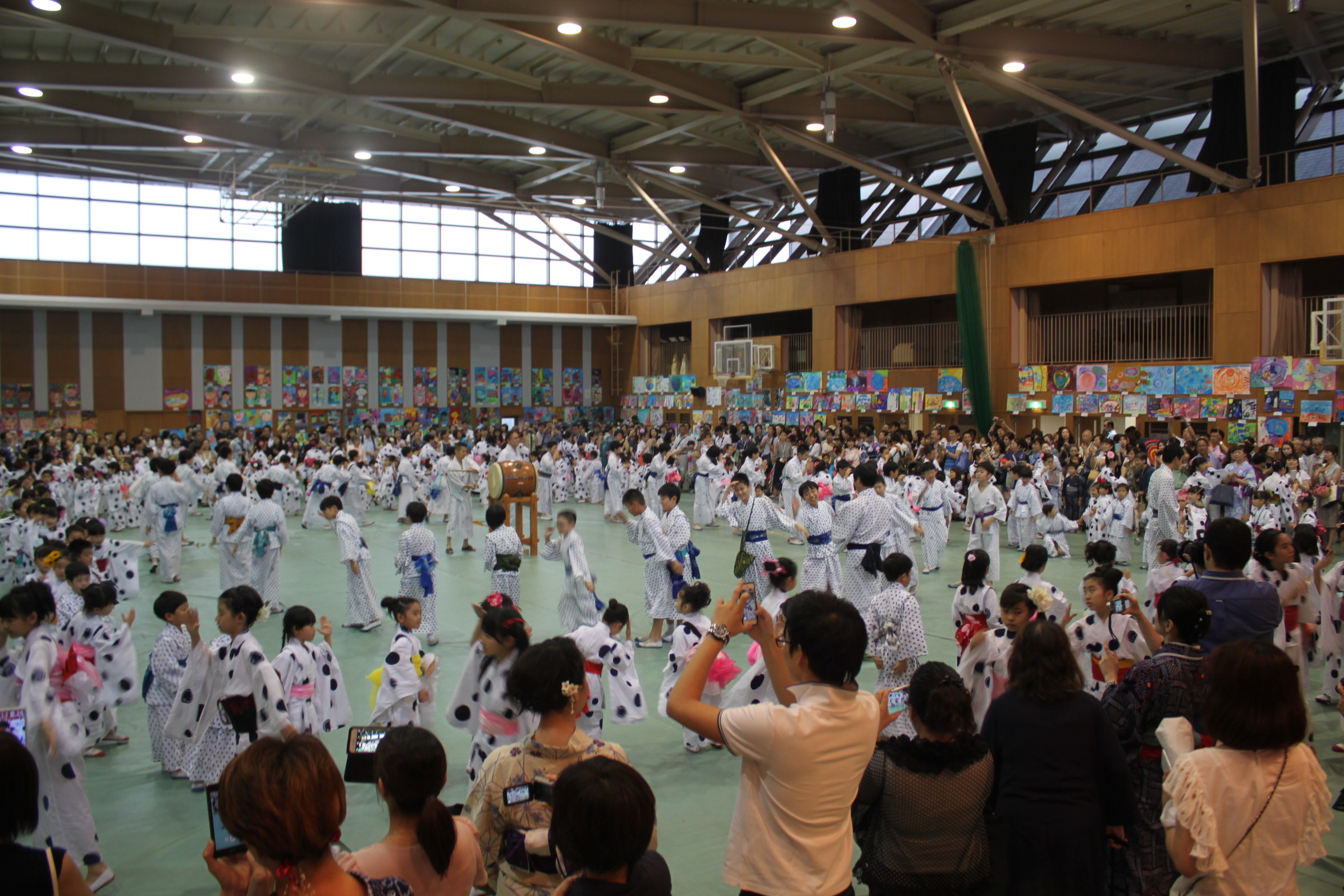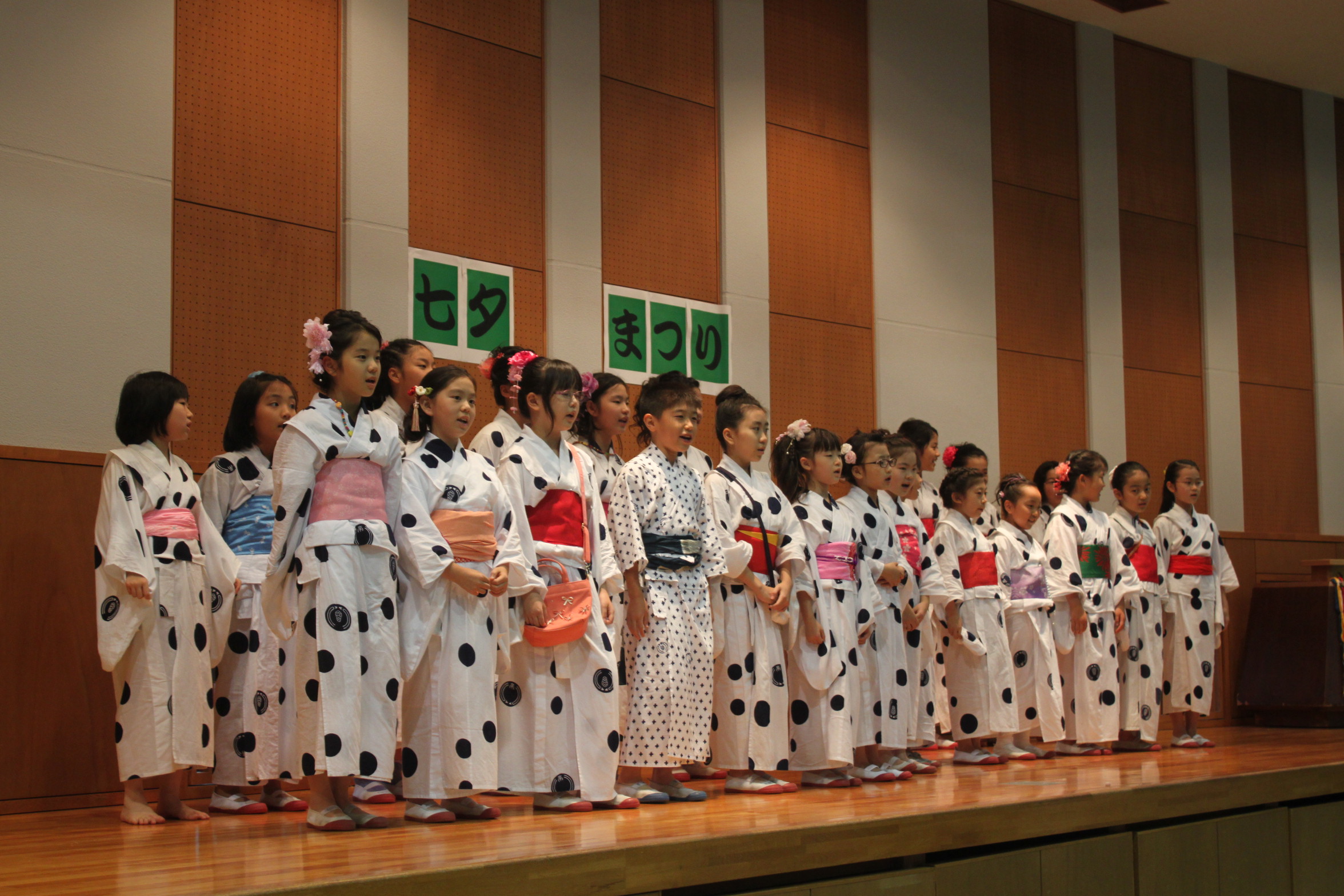 その後の、七夕おどりでは、学院音頭・七夕音頭を1年生と6年生が踊りました。1年生は初めての、6年生は最後の七夕おどりになりました。