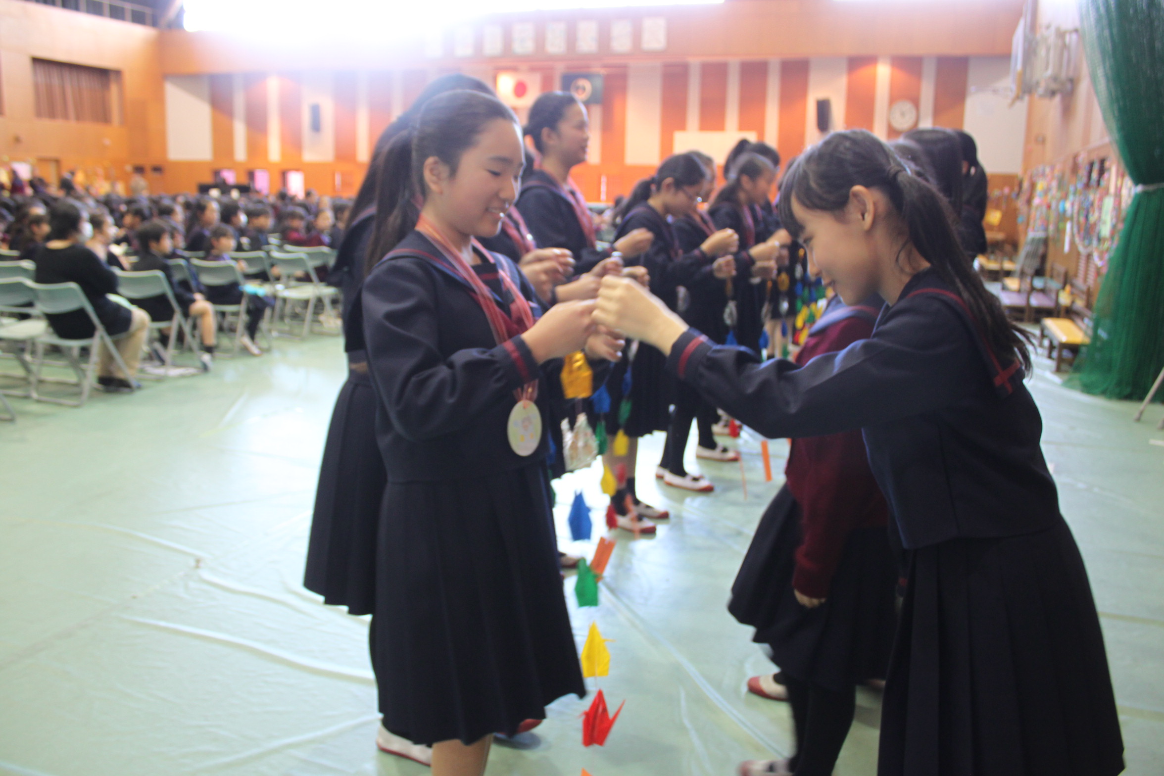 送る会の最後には1年生から5年生までがこの日の為に、心を込めて作った折鶴を6年生にプレゼントしました。
