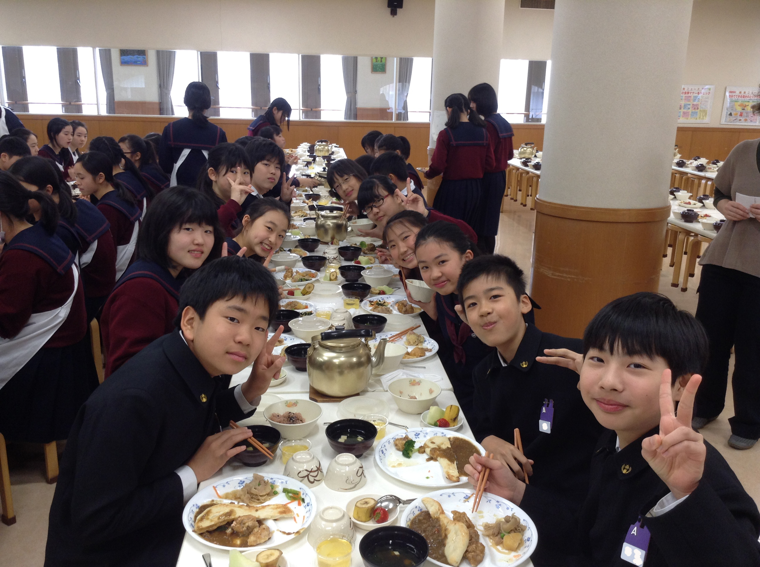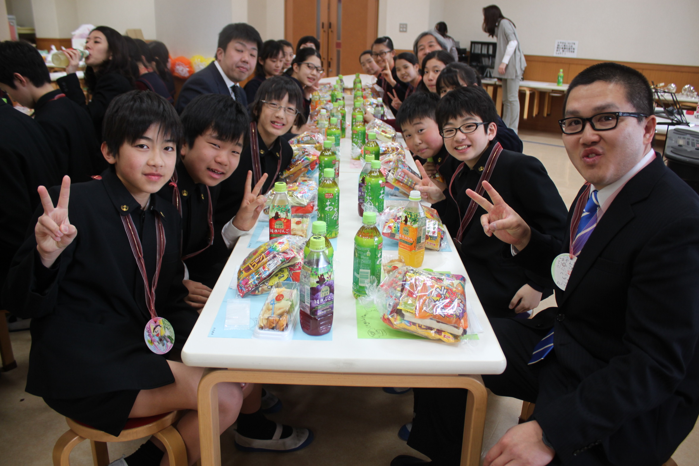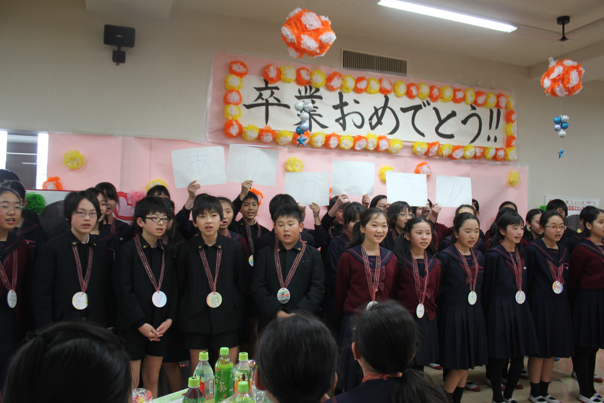 その後、給食場で「祝賀の集い」があり、軽食を食べながら、各クラスの歌を聞いたり、