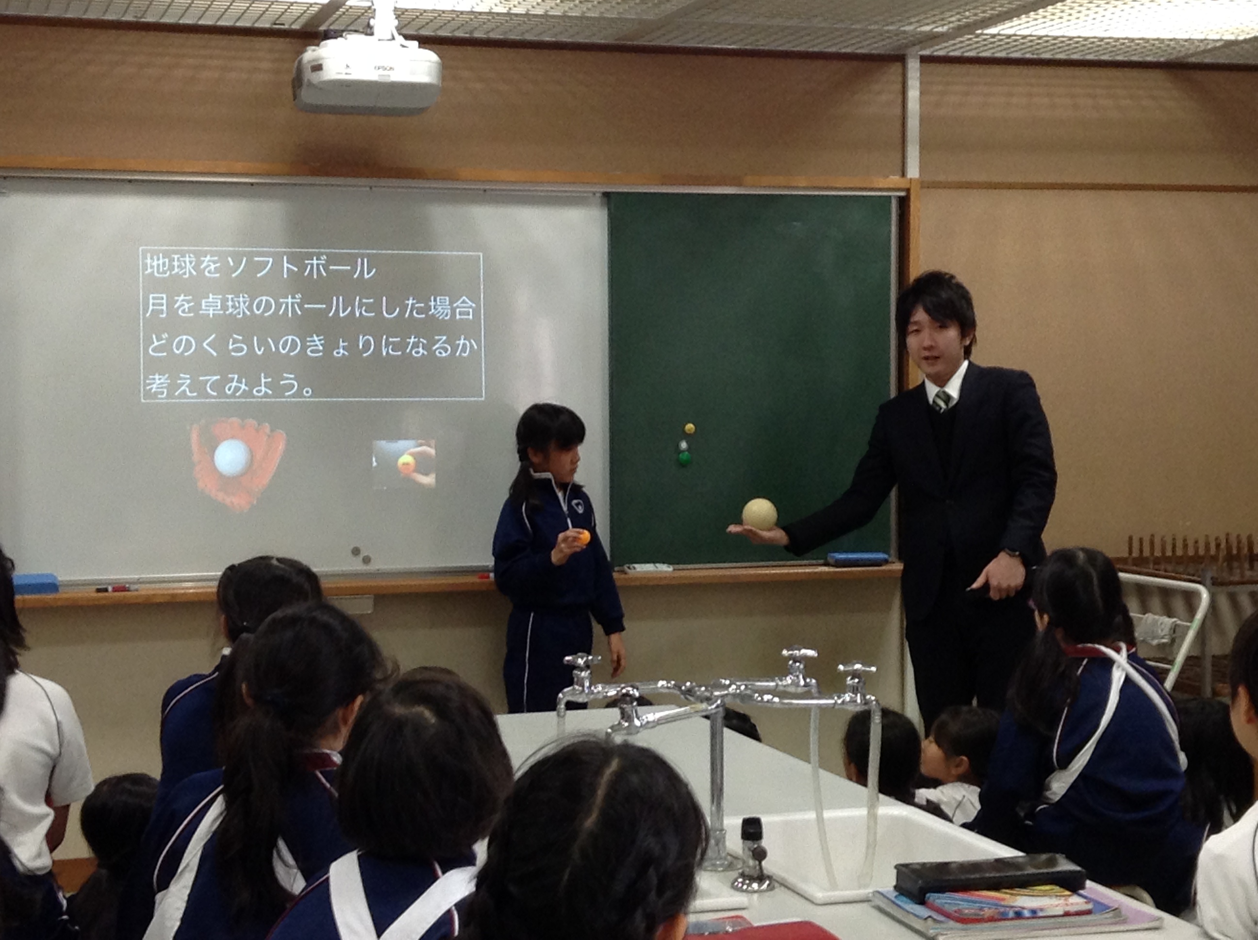 地球をソフトボールに見立てて、それぞれの天体について考えました。