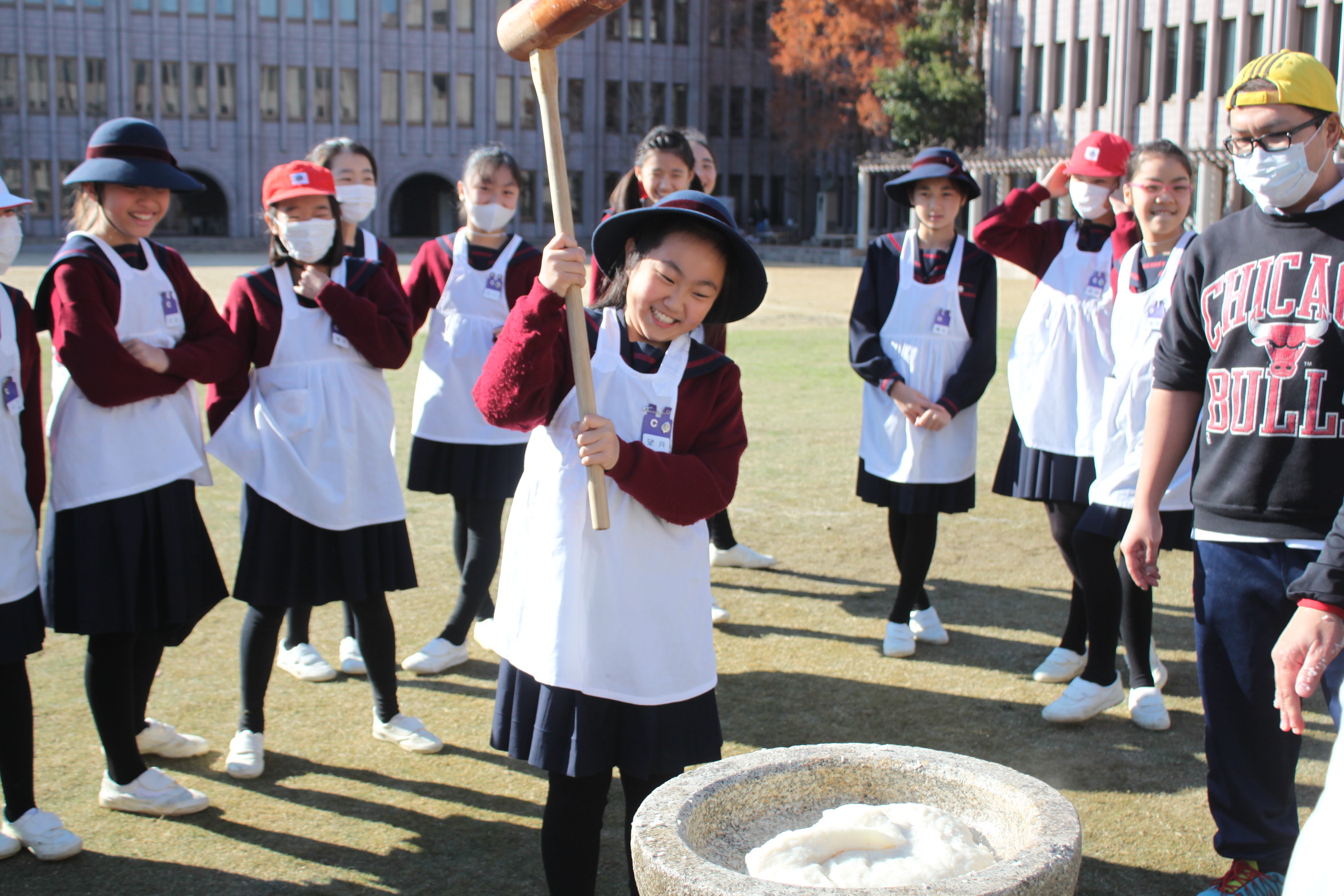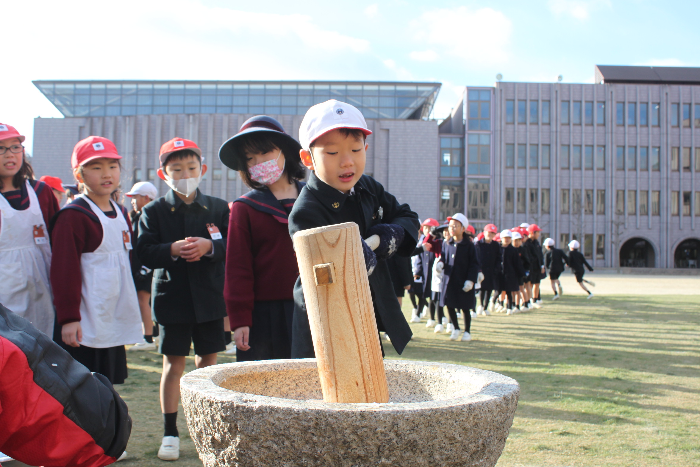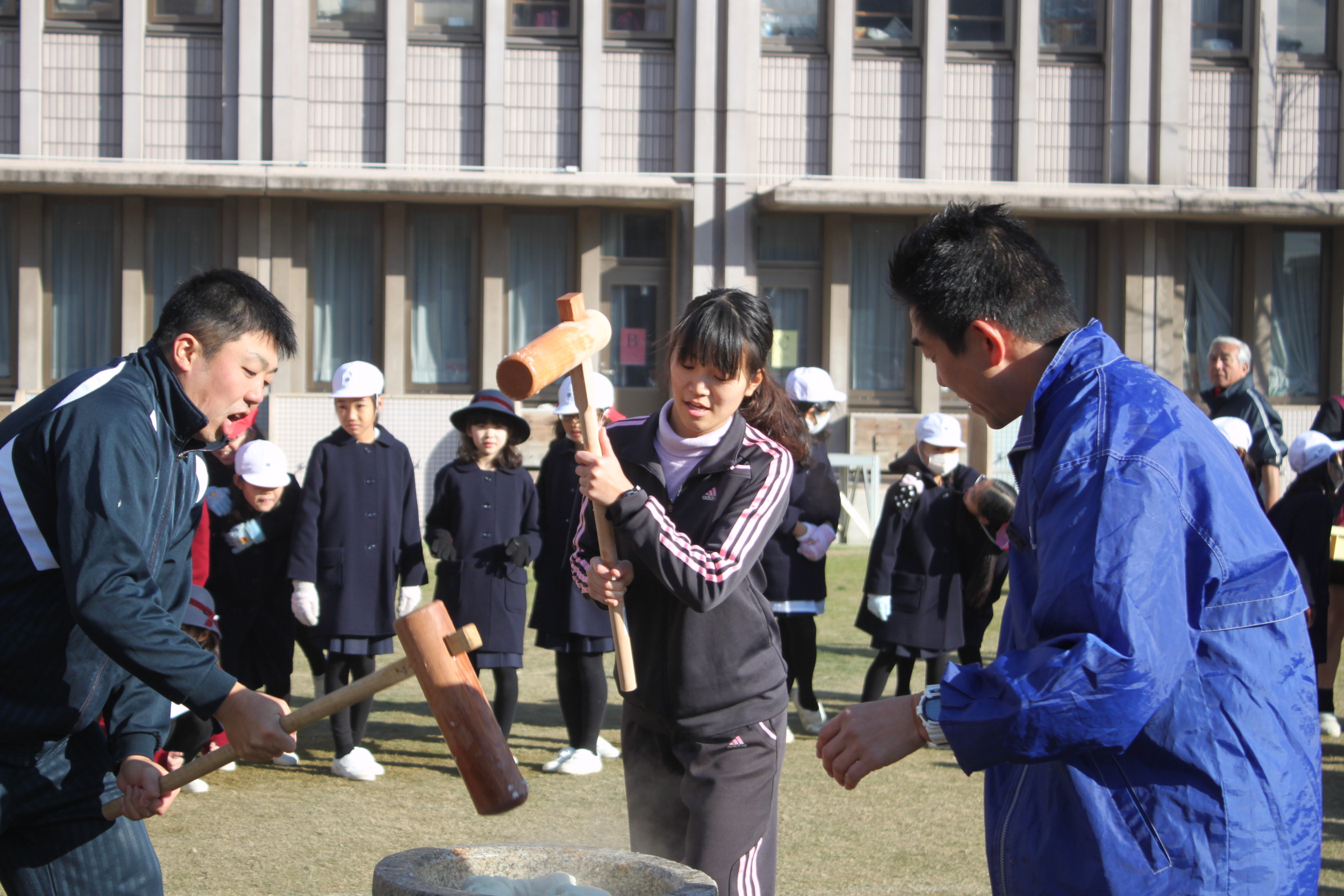 本日、小学校の伝統行事であるお餅つきを運動場で行いました。
