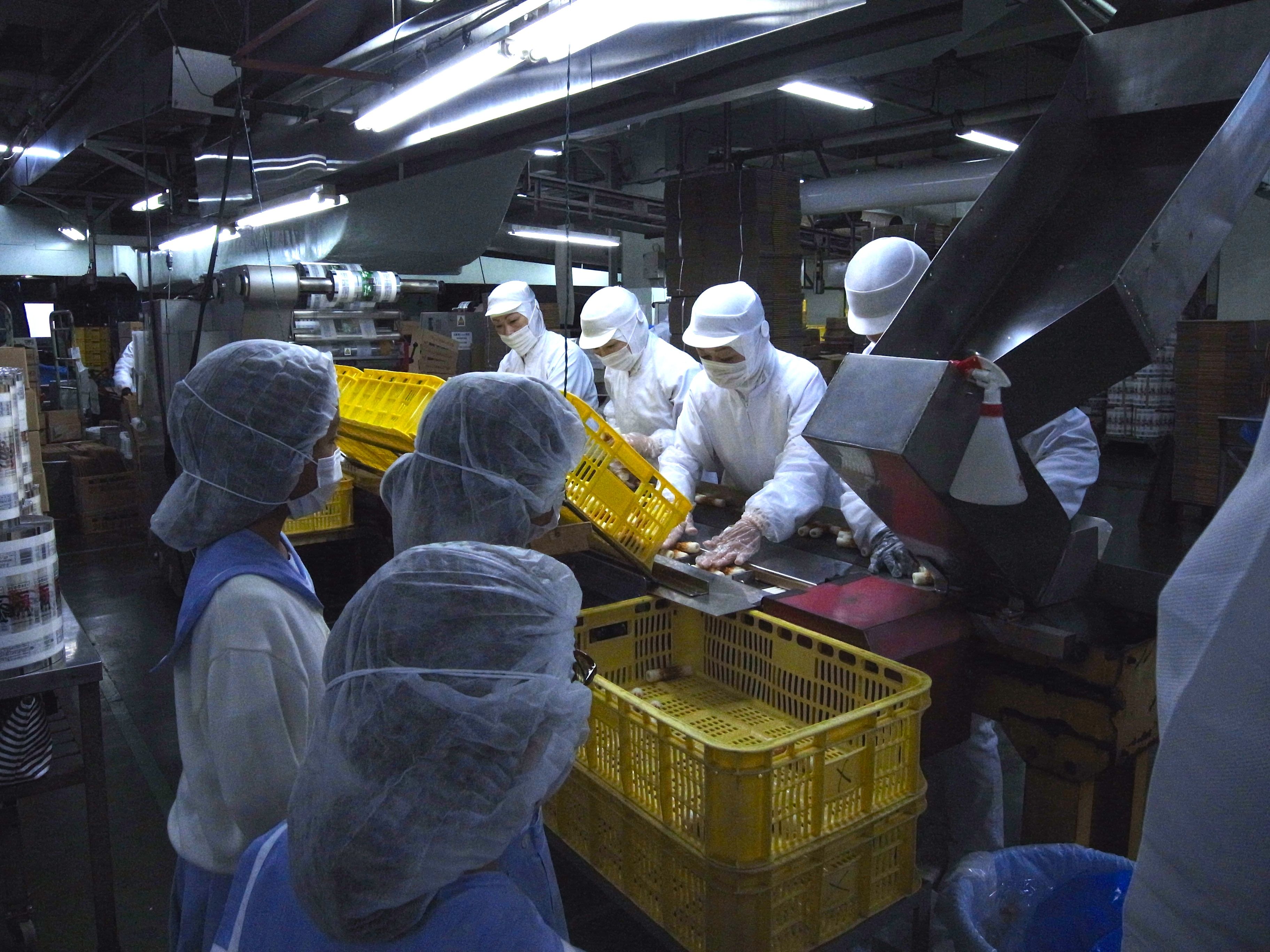 「別寅かまぼこ」さんでは、徹底的な衛生管理がされており、児童たちも、ヘアキャップとマスク、靴の消毒などをして工場内を見学しました。また、こだわった食材選びや美味しく作る研究があって美味しい蒲鉾ができていることを知りました。