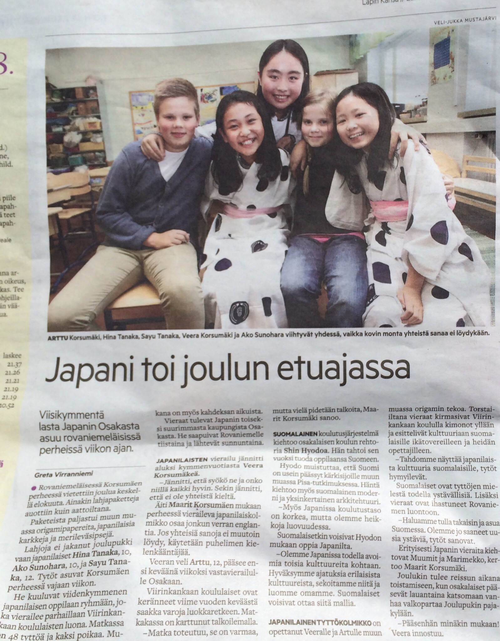 交流行事の日にフィンランドの新聞記者さんが小学校にいらして、ホームステイ先の子供たち、児童、校長先生にインタビューがありました。校長先生には、どうしてフィンランドの小学校と交流したいと思ったのか、フィンランドの授業や学校をどう思いましたか、フィンランドの印象などが質問されました。校長先生からは、世界の中で教育のやり方などが注目されているフィンランドの小学校と交流を持ちたいと思った事や、直に環境や教育の考え方、授業のやり方などを見たり聞いたりできて良かった事などが話されました。双方の子供達にもいろいろな質問がされお互い好印象を持った事や、来年春にフィンランドの子どもたちが日本に行く計画があることなどが大きく記事として掲載されました。