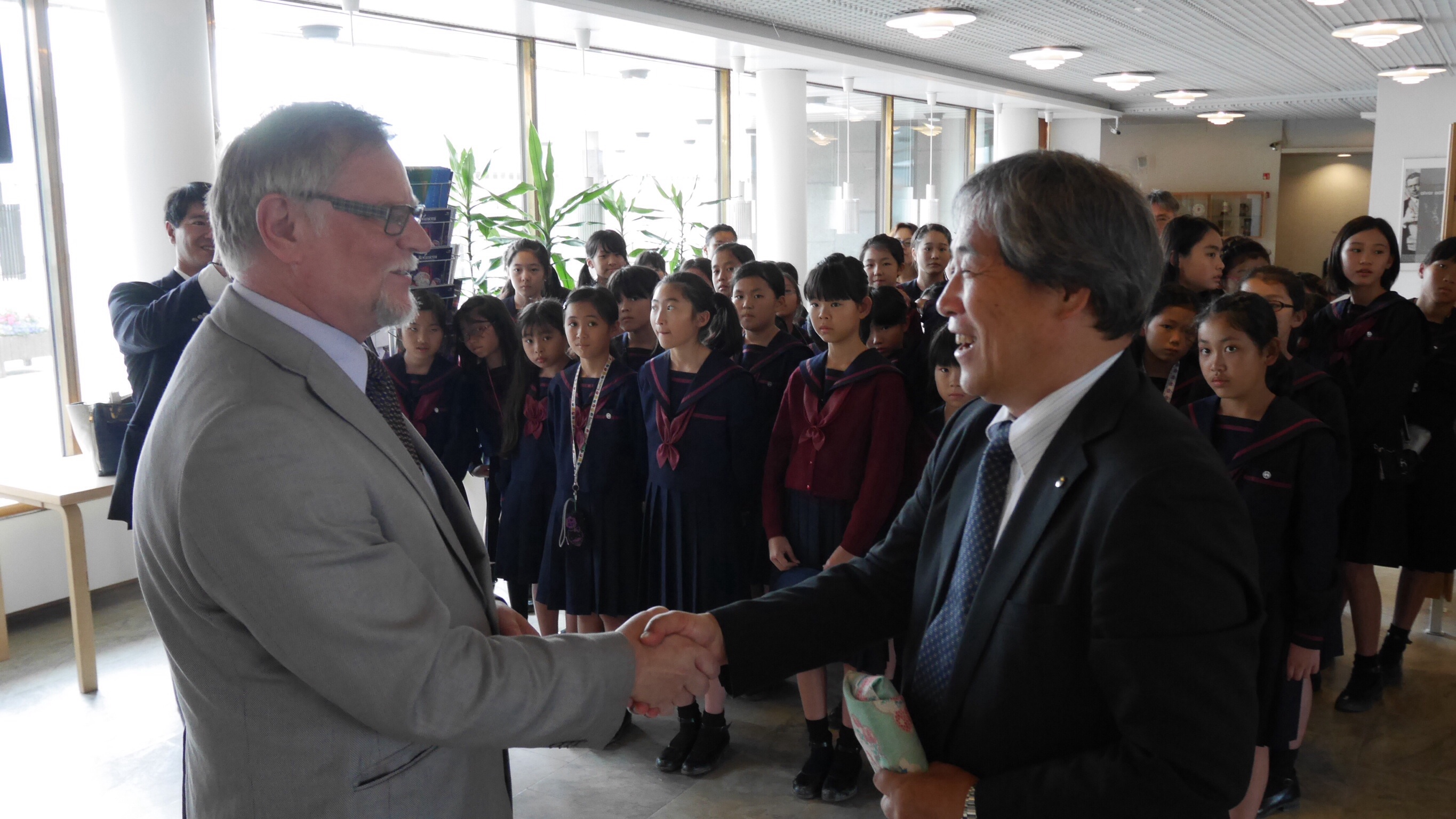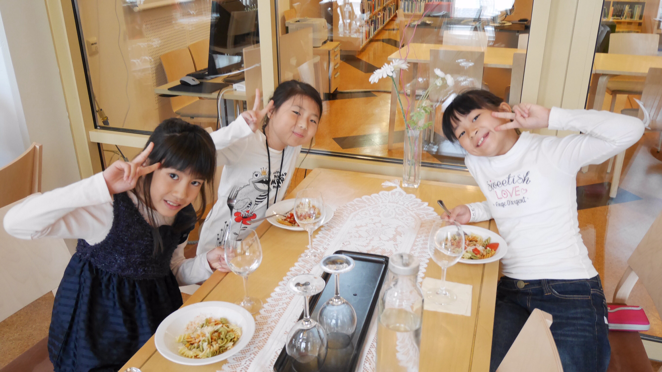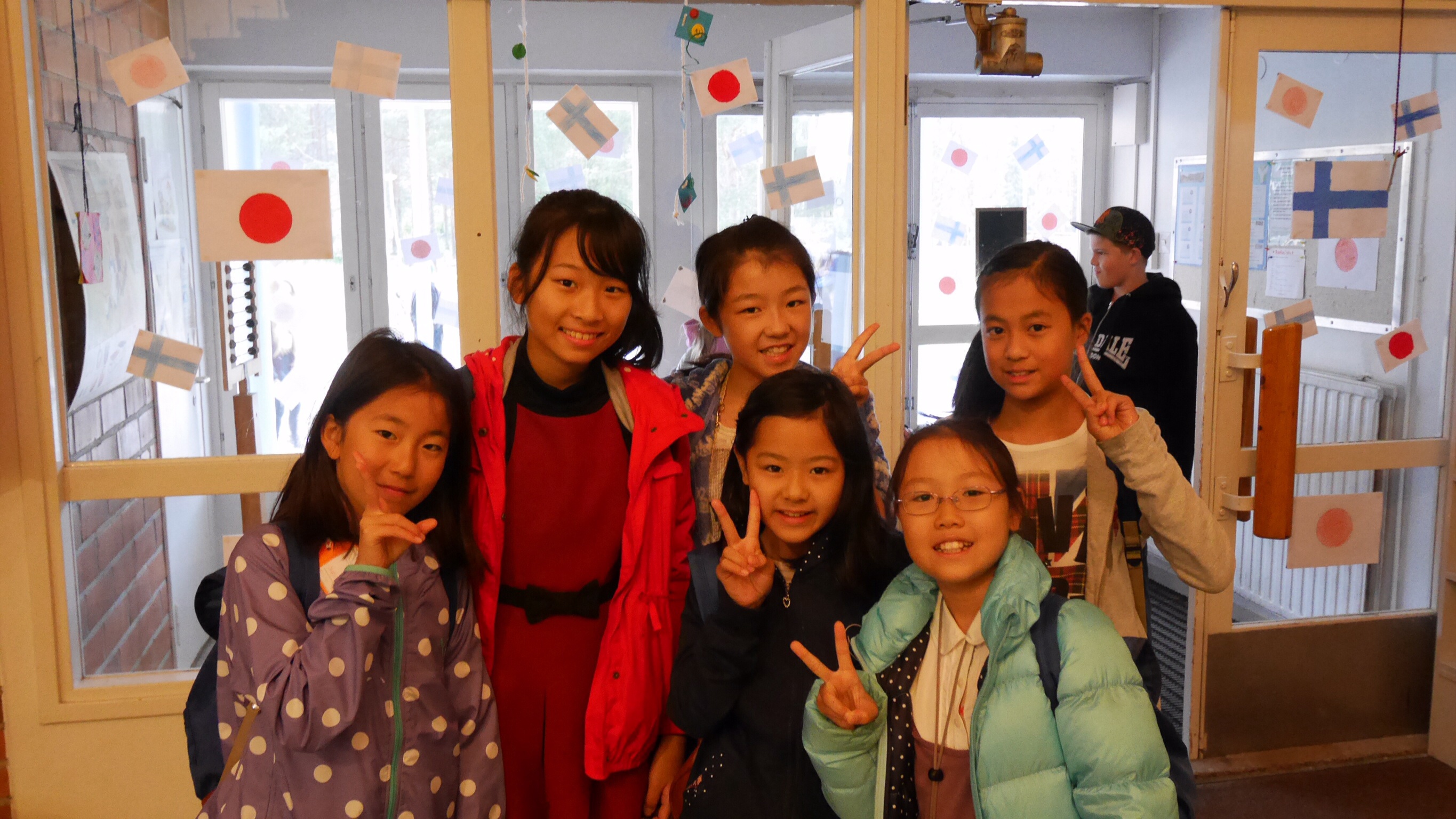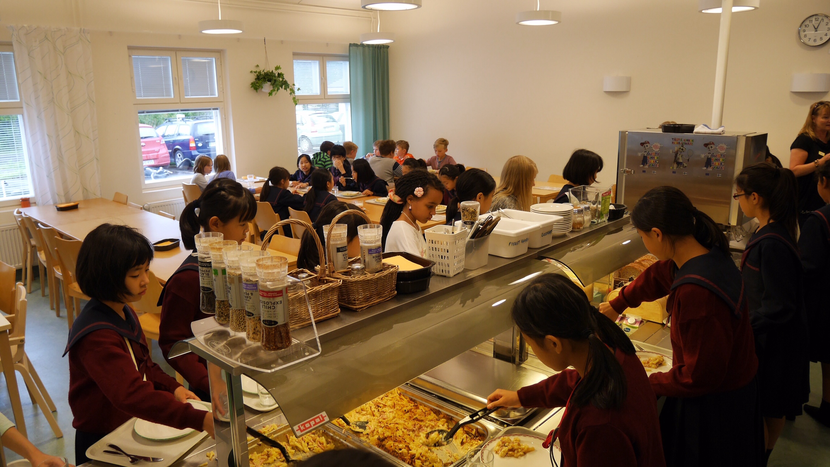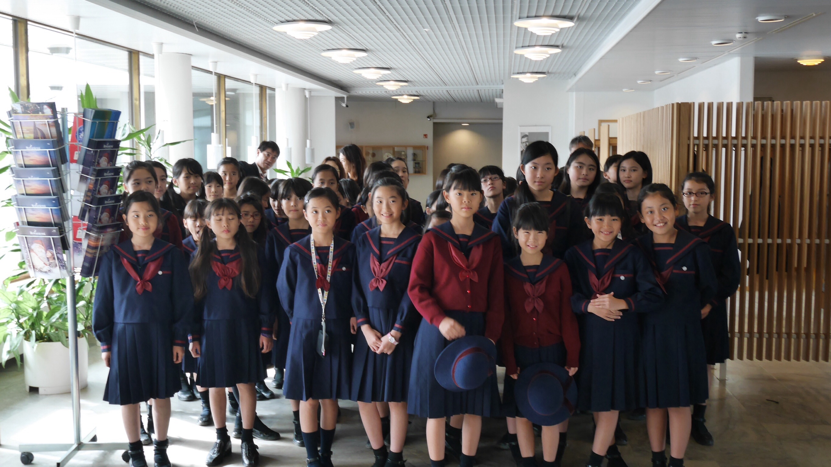 午前中の授業を終えてランチタイムになったのが11:00過ぎでした。朝食がオートミールの簡単なものが中心のフィンランドでは早めのランチタイムだそうです。ランチルームでは品目は限られていますが、バイキング形式のもので自分の好きなものを好きな量だけ食べるものです。ランチの他におやつタイム、夕食、夕食後にさらにティータイムと計5回を軽く取るようです。昼食後ロバニエミ市庁舎市長さんを表敬訪問し、市長さんの前で学院祝歌を斉唱。市長さんから歓迎の言葉をいただきました。そのあと市庁舎のランチルームで鮭のスープとパンをいただきました。その後の市の図書館で日本の漫画を発見。バスで小学校に帰りそこでホームステイ先のご家族、学校関係者へのプレンゼント交換、児童代表のスピーチが行われました。こうして二日目が終わりました。今日の気温も16度。午後からは雨も止み雲の間から晴れ間の見える一日でした。