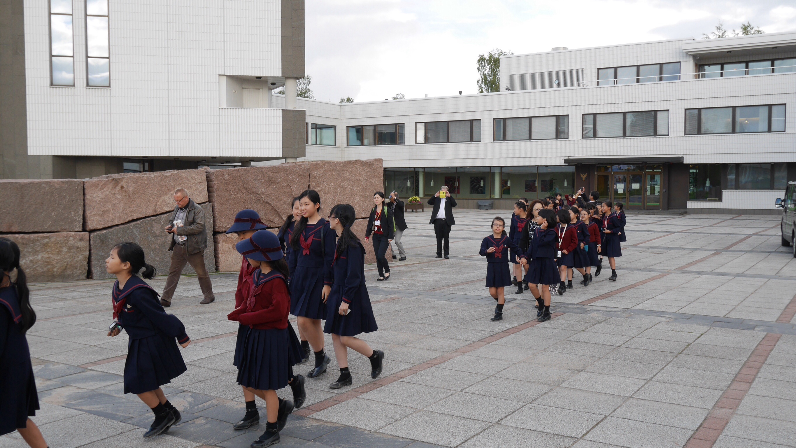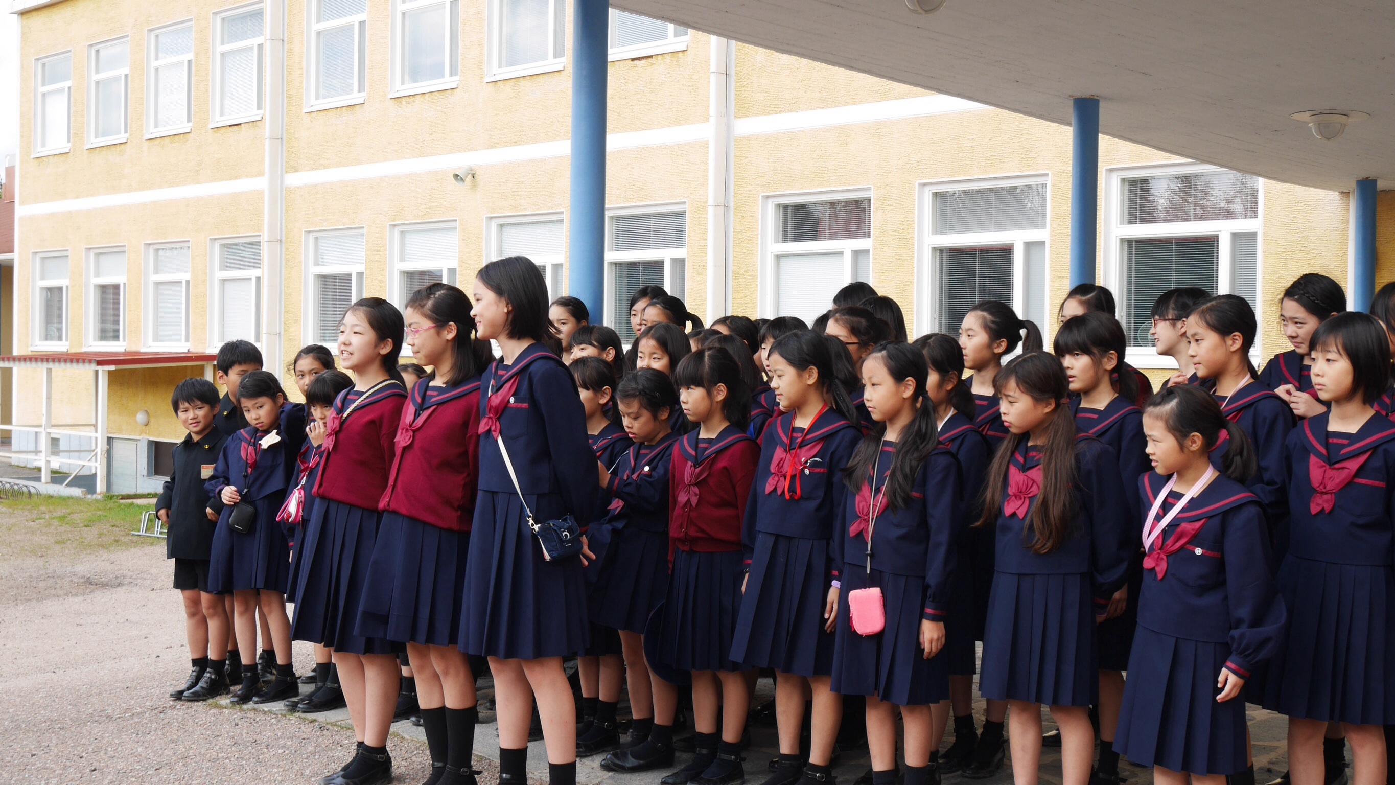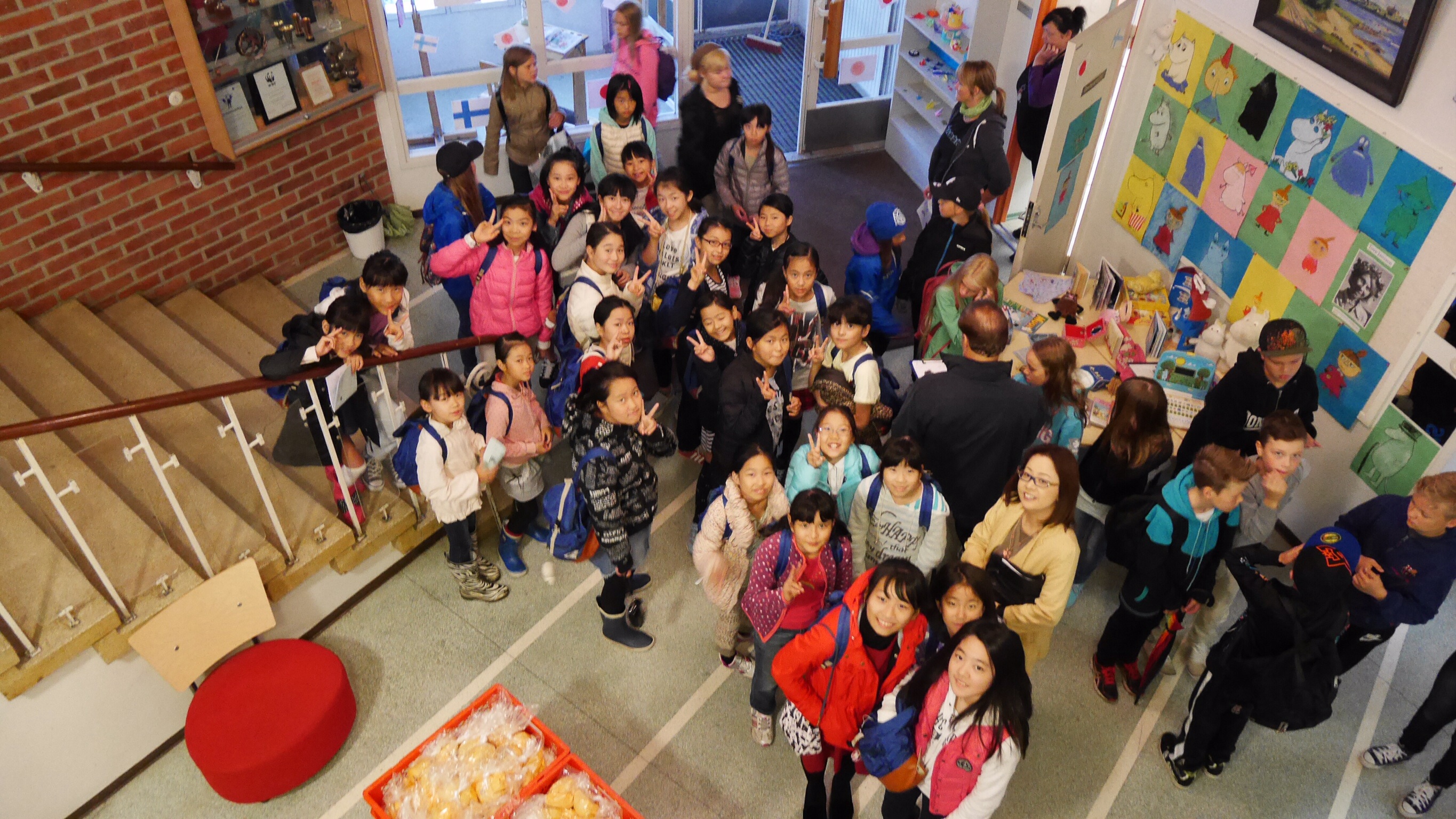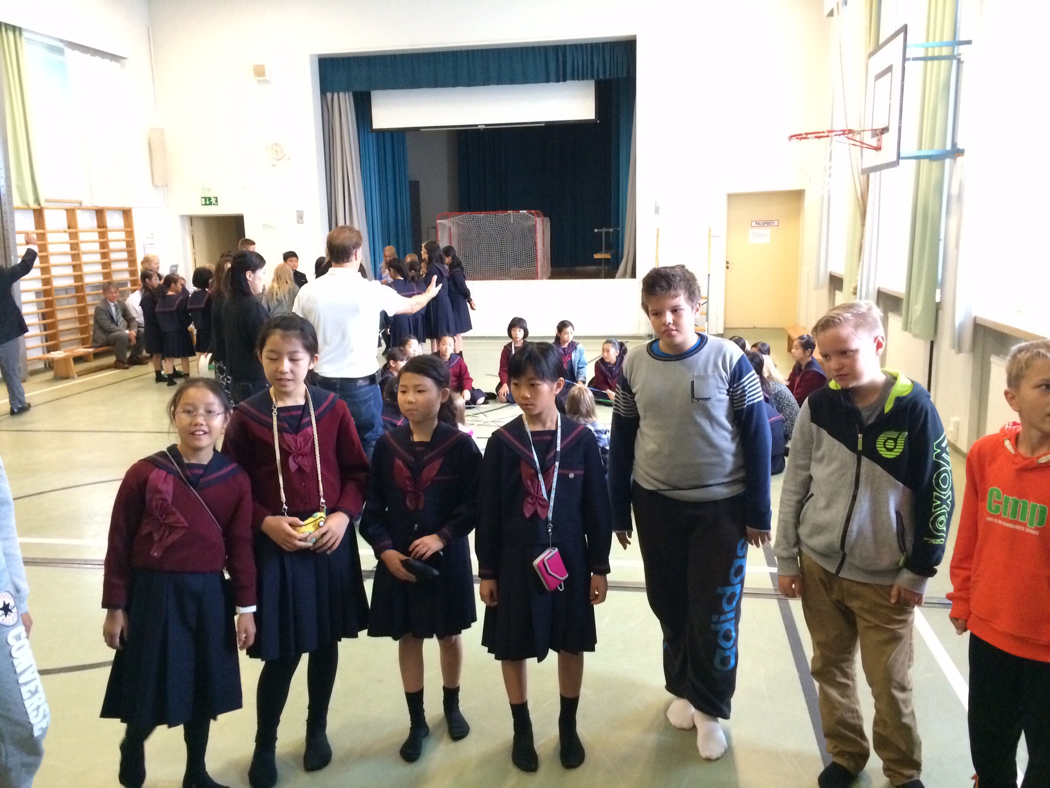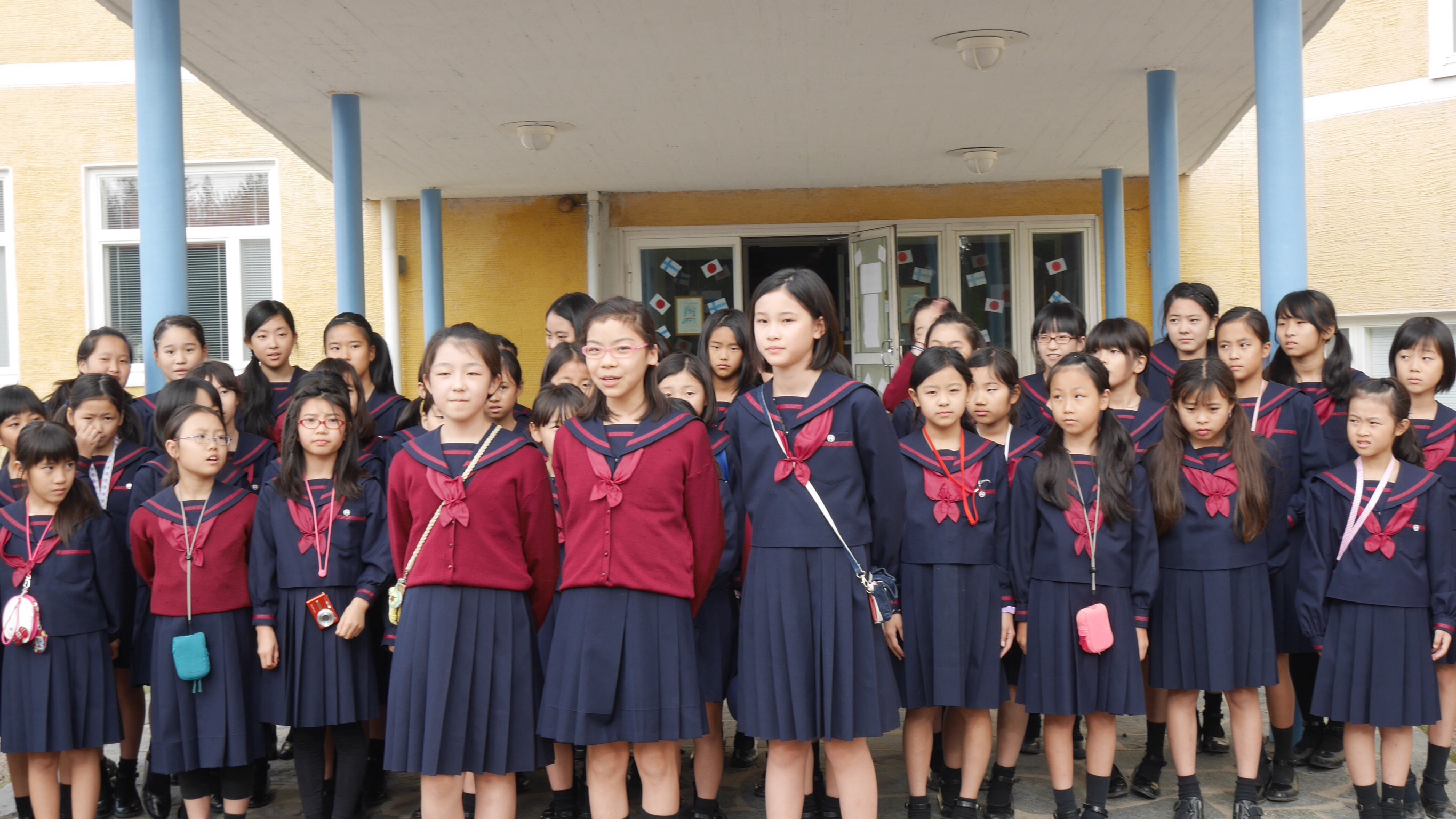 午前中の授業を終えてランチタイムになったのが11:00過ぎでした。朝食がオートミールの簡単なものが中心のフィンランドでは早めのランチタイムだそうです。ランチルームでは品目は限られていますが、バイキング形式のもので自分の好きなものを好きな量だけ食べるものです。ランチの他におやつタイム、夕食、夕食後にさらにティータイムと計5回を軽く取るようです。昼食後ロバニエミ市庁舎市長さんを表敬訪問し、市長さんの前で学院祝歌を斉唱。市長さんから歓迎の言葉をいただきました。そのあと市庁舎のランチルームで鮭のスープとパンをいただきました。その後の市の図書館で日本の漫画を発見。バスで小学校に帰りそこでホームステイ先のご家族、学校関係者へのプレンゼント交換、児童代表のスピーチが行われました。こうして二日目が終わりました。今日の気温も16度。午後からは雨も止み雲の間から晴れ間の見える一日でした。