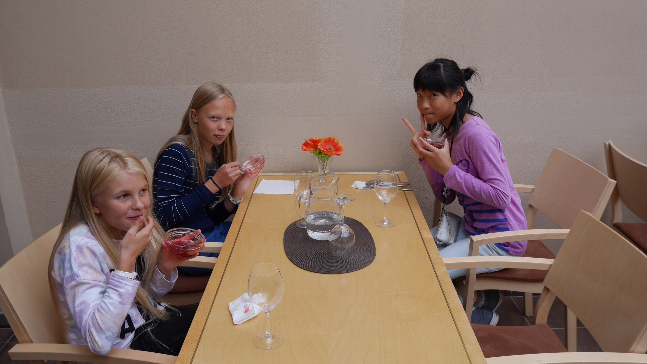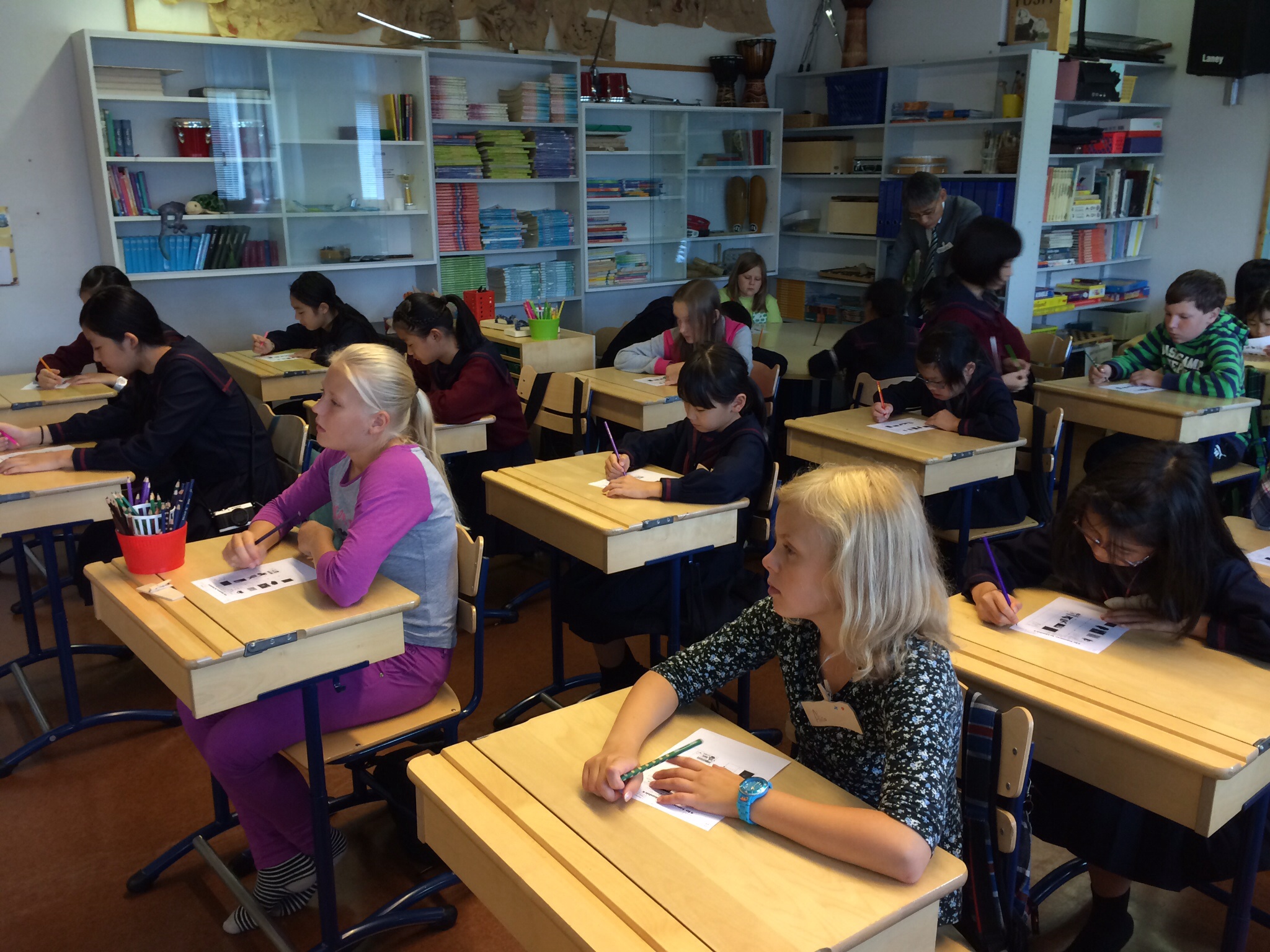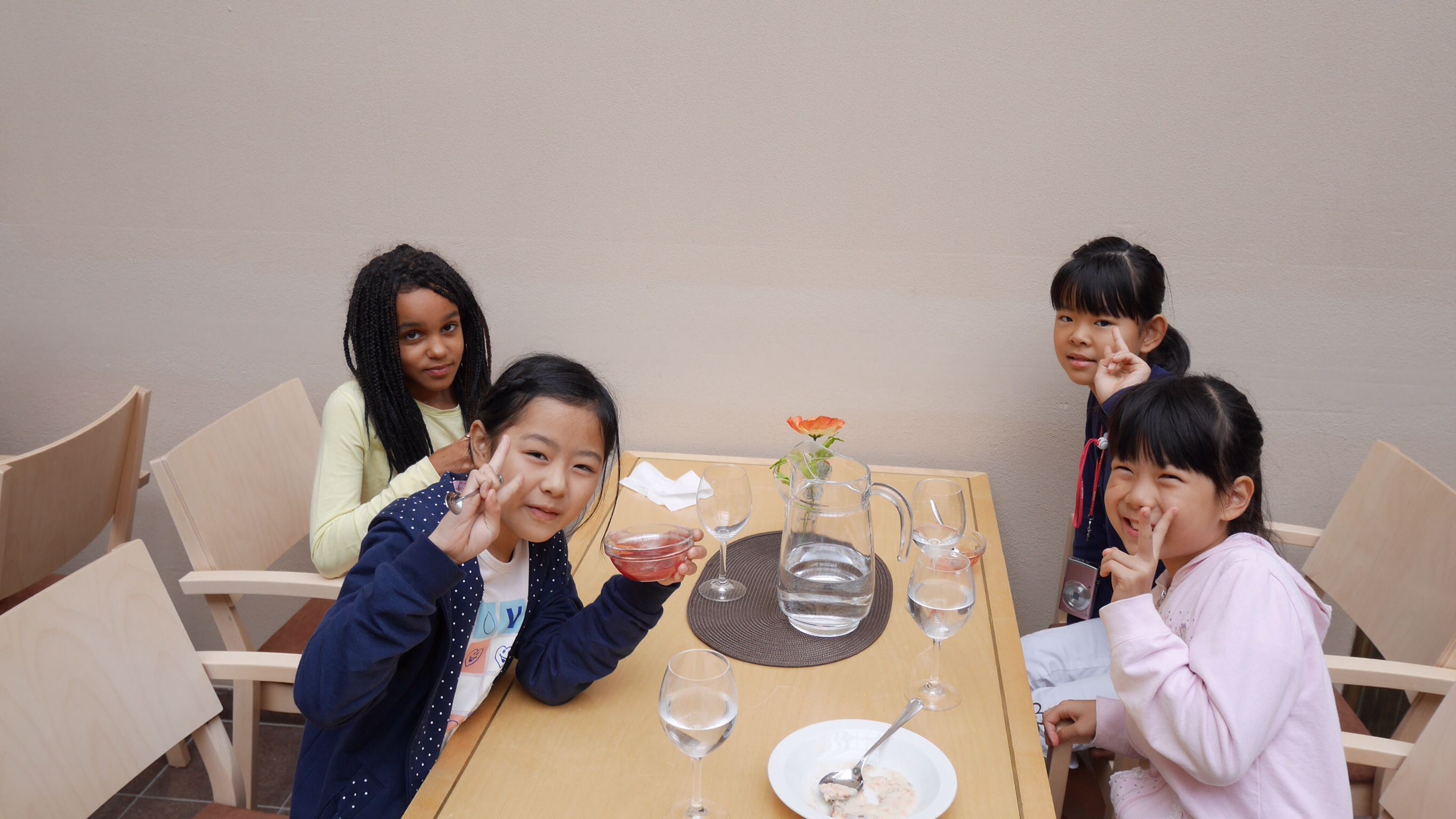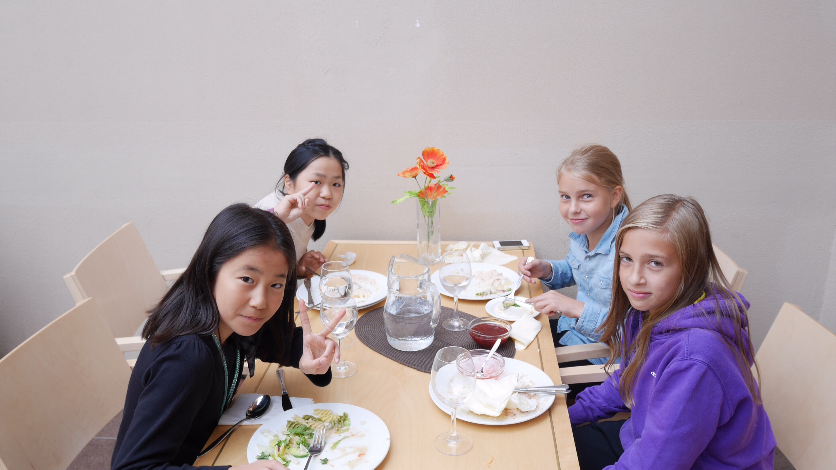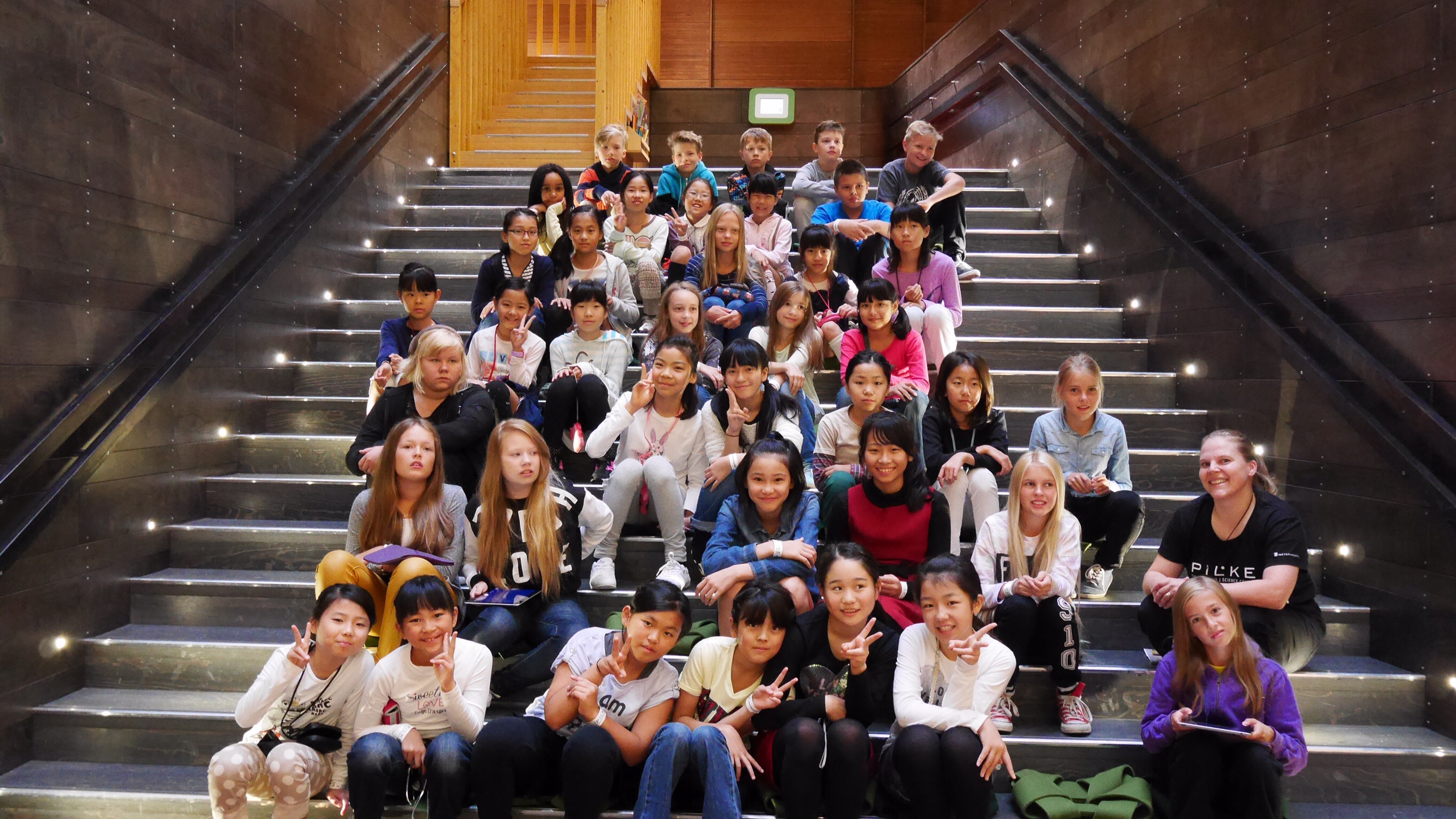 午前中の授業を終えてランチタイムになったのが11:00過ぎでした。朝食がオートミールの簡単なものが中心のフィンランドでは早めのランチタイムだそうです。ランチルームでは品目は限られていますが、バイキング形式のもので自分の好きなものを好きな量だけ食べるものです。ランチの他におやつタイム、夕食、夕食後にさらにティータイムと計5回を軽く取るようです。昼食後ロバニエミ市庁舎市長さんを表敬訪問し、市長さんの前で学院祝歌を斉唱。市長さんから歓迎の言葉をいただきました。そのあと市庁舎のランチルームで鮭のスープとパンをいただきました。その後の市の図書館で日本の漫画を発見。バスで小学校に帰りそこでホームステイ先のご家族、学校関係者へのプレンゼント交換、児童代表のスピーチが行われました。こうして二日目が終わりました。今日の気温も16度。午後からは雨も止み雲の間から晴れ間の見える一日でした。