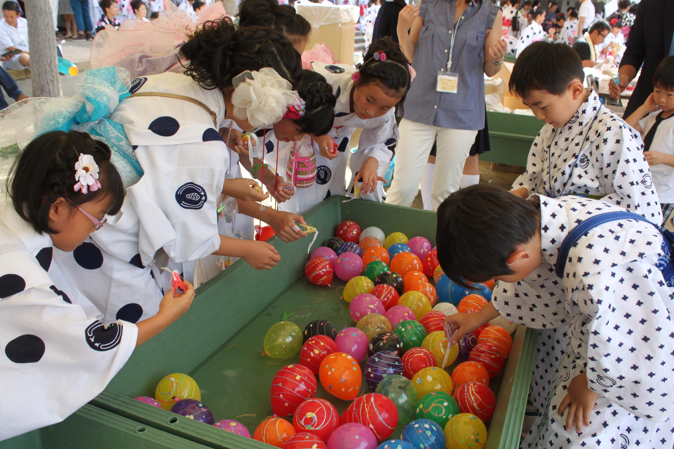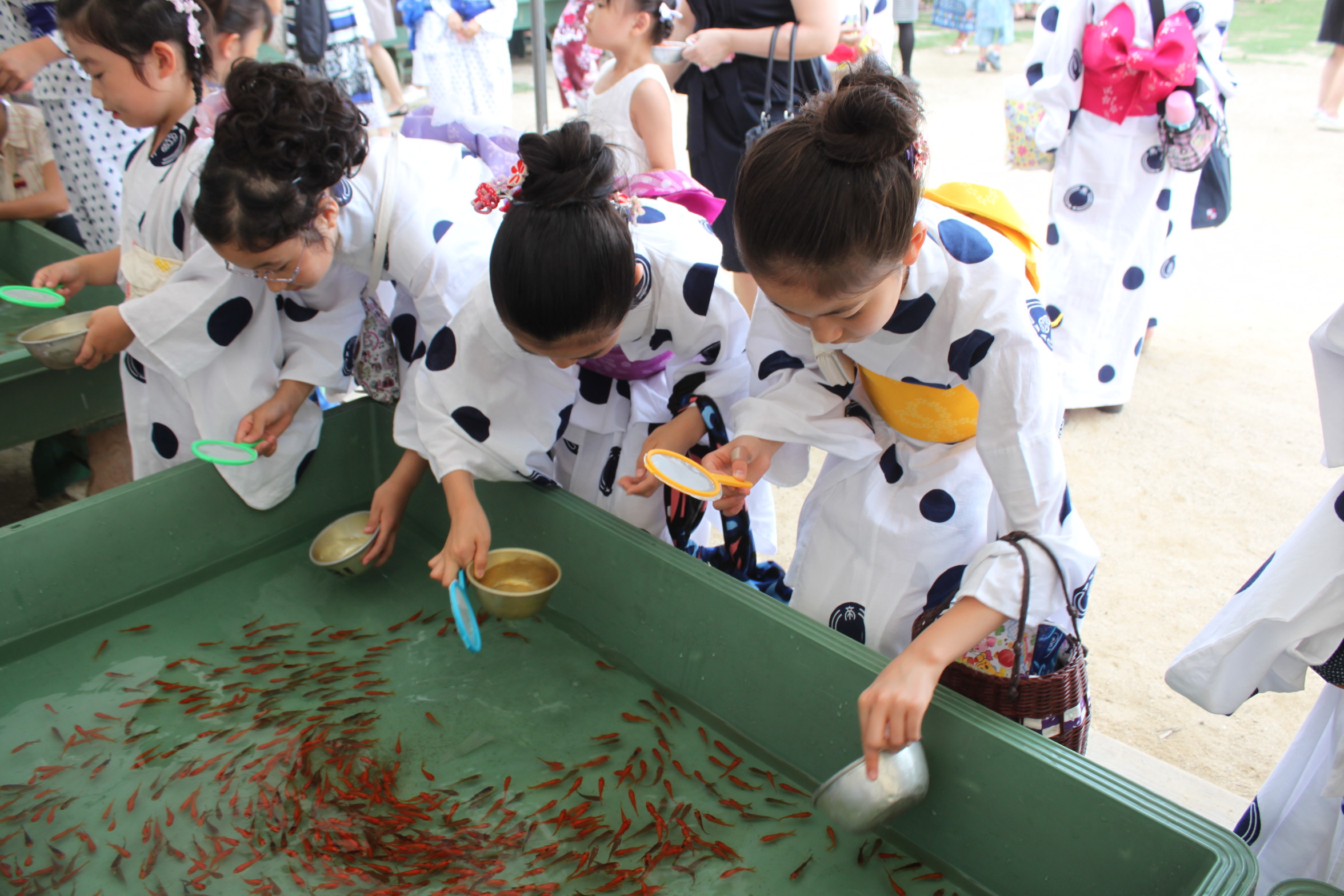 児童たちの金魚すくいやヨーヨー釣りをして楽しく遊ぶ姿が見られ、