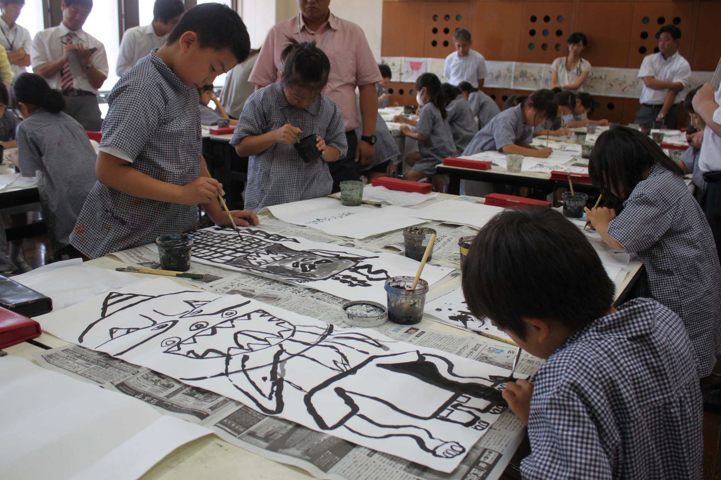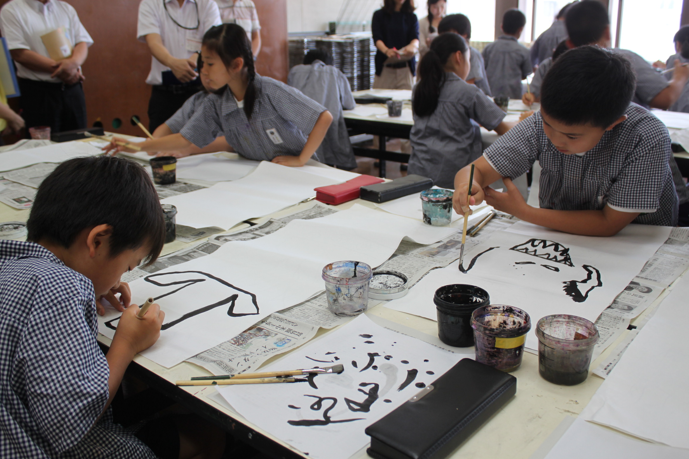 児童たちは、自分で妖怪を考え、筆使いや墨の濃淡を意識して描きました。