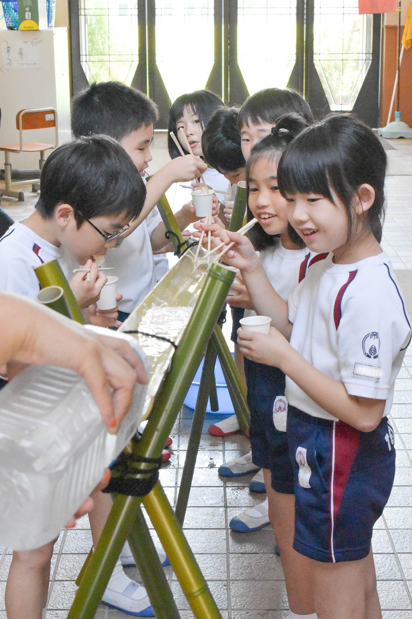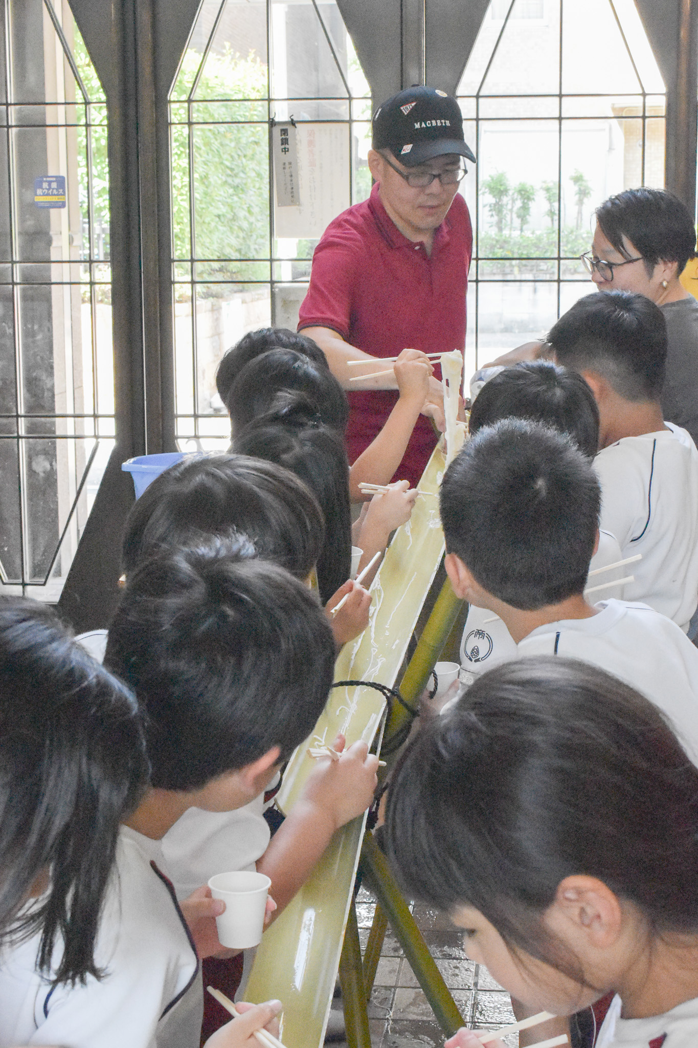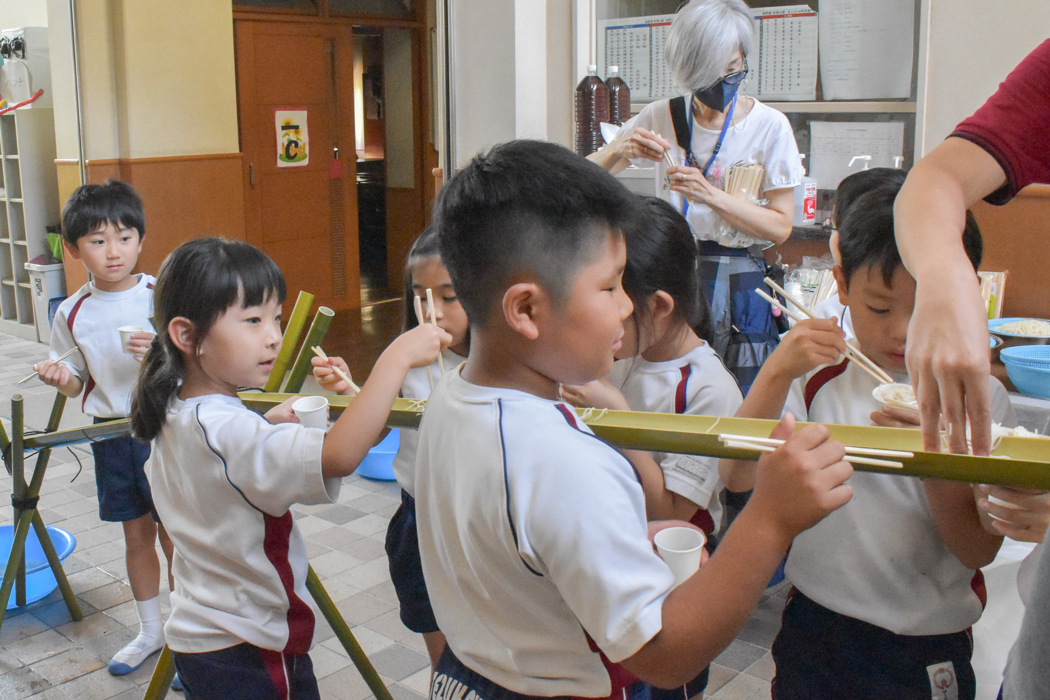 竹を用いた流しそうめんを見て子どもたちみんなテンションが上がっていました。